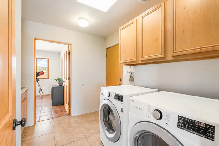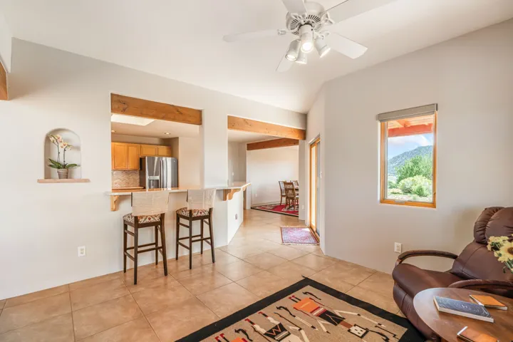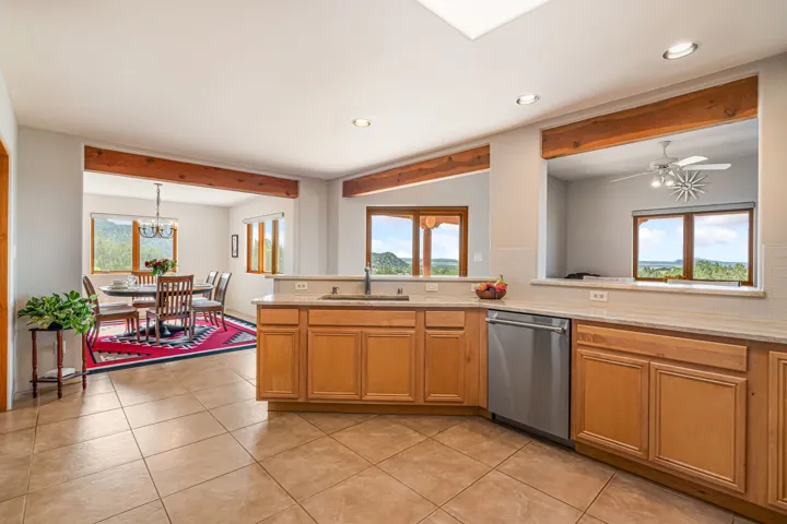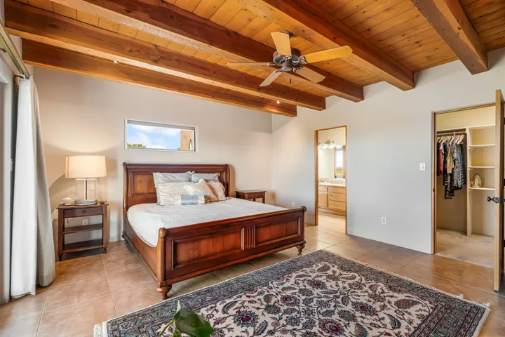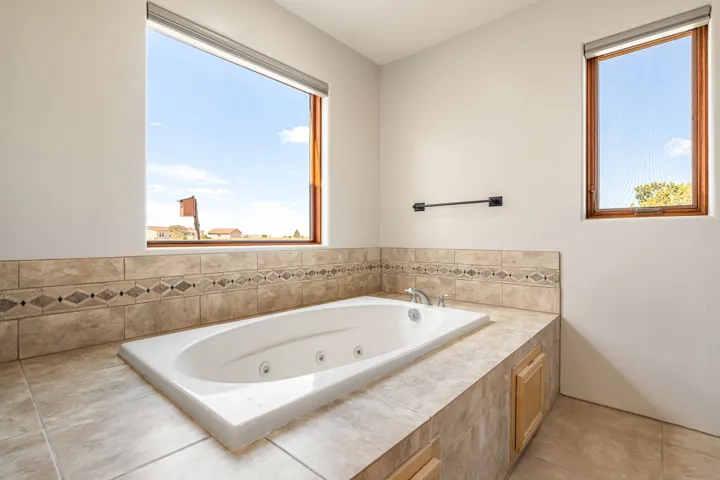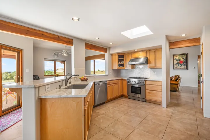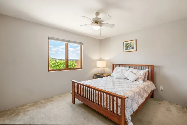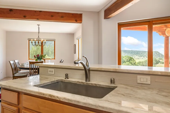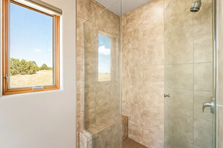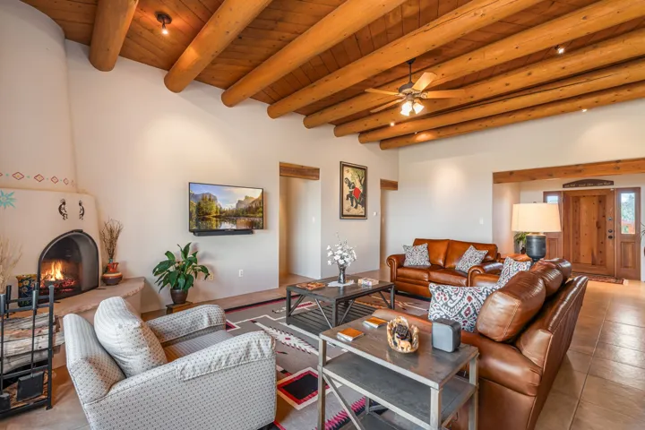 RARE OFFERING IN SPIRIT WIND RANCH! This single-level, passive-solar beauty offers long-range mountain views and privacy. Sited on 5 acres overlooking the Galisteo Basin, Sandia and Ortiz mountains. Radiant heat tubing is WIRSBO. Wonderful kitchen has Taj Mahal counters, bar with seating, two pantries, high-end stainless steel appliances and seating area. Living area has beautiful viga ceilings and wood-burning kiva fireplace. Primary bedroom has a gas fireplace and doors to rear portal. Bath has double sinks, jetted tub, separate shower and walk-in closet. Spacious office/studio space with en-suite 3/4 bath and separate entrance. Property has been pre-inspected and all repairs have been made. Inspection report available on request. Walled front courtyard is on drip with freshly painted gate. Proper laundry with sink and storage. Insulated blinds are all on a remote. Oversized and finished 2-car garage. NO KITEC. NO STEPS. Whole house water filtration – Aguasana. HOA has contract with Farrellgas for reduced rates. Septic has been inspected and lot corners are flagged.
