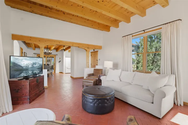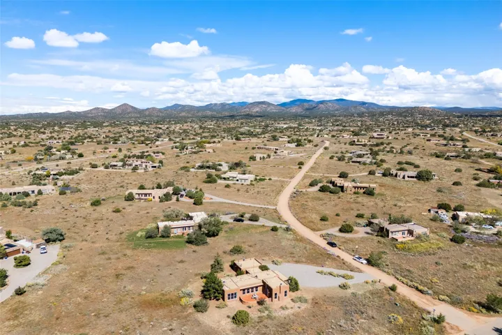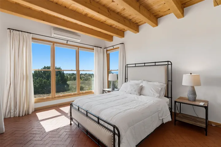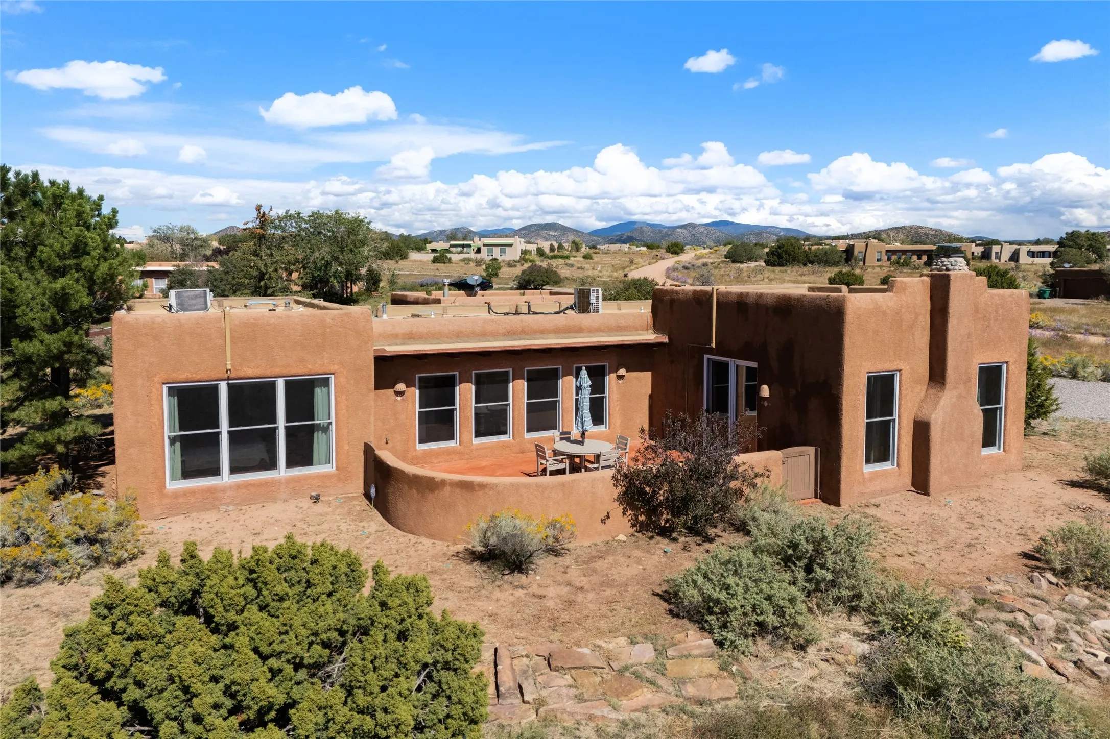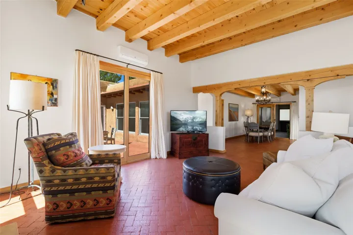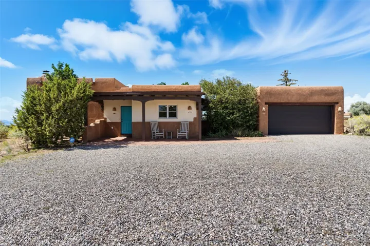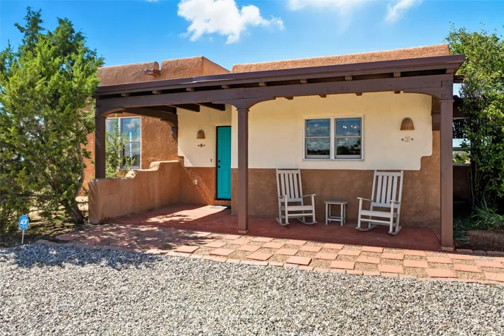 Located in the popular Eldorado community and sited on a desirable 1.28 acre corner lot, this charming 2 bedroom, 2 bath, single level home, filled with natural light, features an open concept living, dining and kitchen area. The living area has a high beamed ceiling, a wood-burning fireplace and French doors opening to a brick, walled-in patio. From the dining area step into a fully enclosed breezeway connecting to the 2-car garage. A long hallway, lined with large, south-facing windows, leads to the bedrooms and bathrooms. The spacious primary suite opens directly to the patio and features a full bathroom and a generous walk-in closet. A second bedroom, with built-in bookshelves, currently used as an office, offers flexibility as a home office or a guest room. Mini-splits in the living area, dining area and both bedrooms provide heating and cooling. Beamed ceilings with brick floors throughout. The home has been lovingly-cared for and well-maintained. The Seller has also made a number of improvements, including all new Pella windows, new mini-splits and a new garage door. Come home to this lovely home and enjoy all the conveniences Eldorado offers ā endless walking and hiking trails, shopping and dining, a community center, pool, parks, tennis and pickleball courts ā and just minutes to Santa Fe.