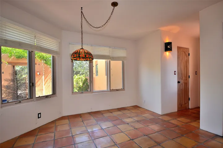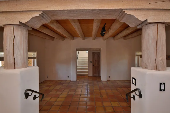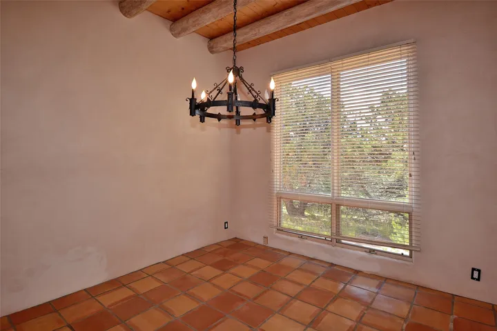 Nestled on two acres dotted with piñon and juniper, this inviting Santa Fe–style home blends traditional charm with modern comforts. A gravel driveway leads to a graceful walkway, which in turn leads to a beautifully landscaped, enclosed front yard, The house features plastered walls, and the ground-level floors are adorned with traditional Saltillo tiles, except for the guest bedroom, which has carpet and an en-suite bathroom. The living and dining rooms feature soaring ceilings with vigas. A gas fireplace in the living room adds ambiance during cold winter nights.