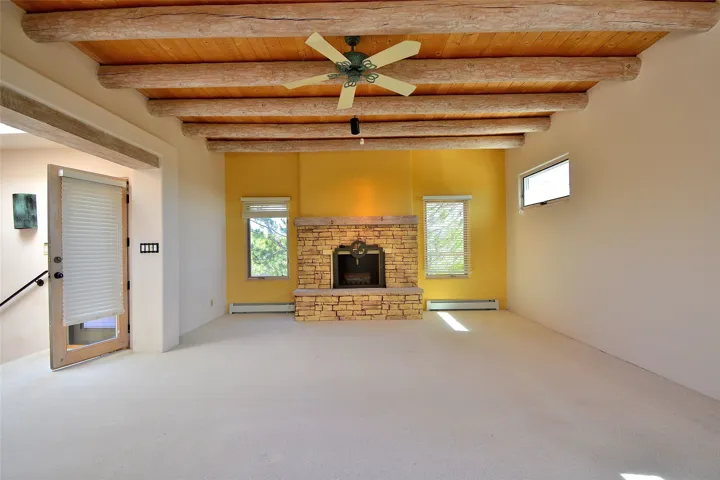 Upstairs, the spacious main bedroom offers vigas, a second gas fireplace, radiant baseboard heat, and mountain views on one side and a deck on the other. The adjoining bath offers dual sinks, a Jacuzzi-style tub, a shower with seating, and a walk-in cedar closet.