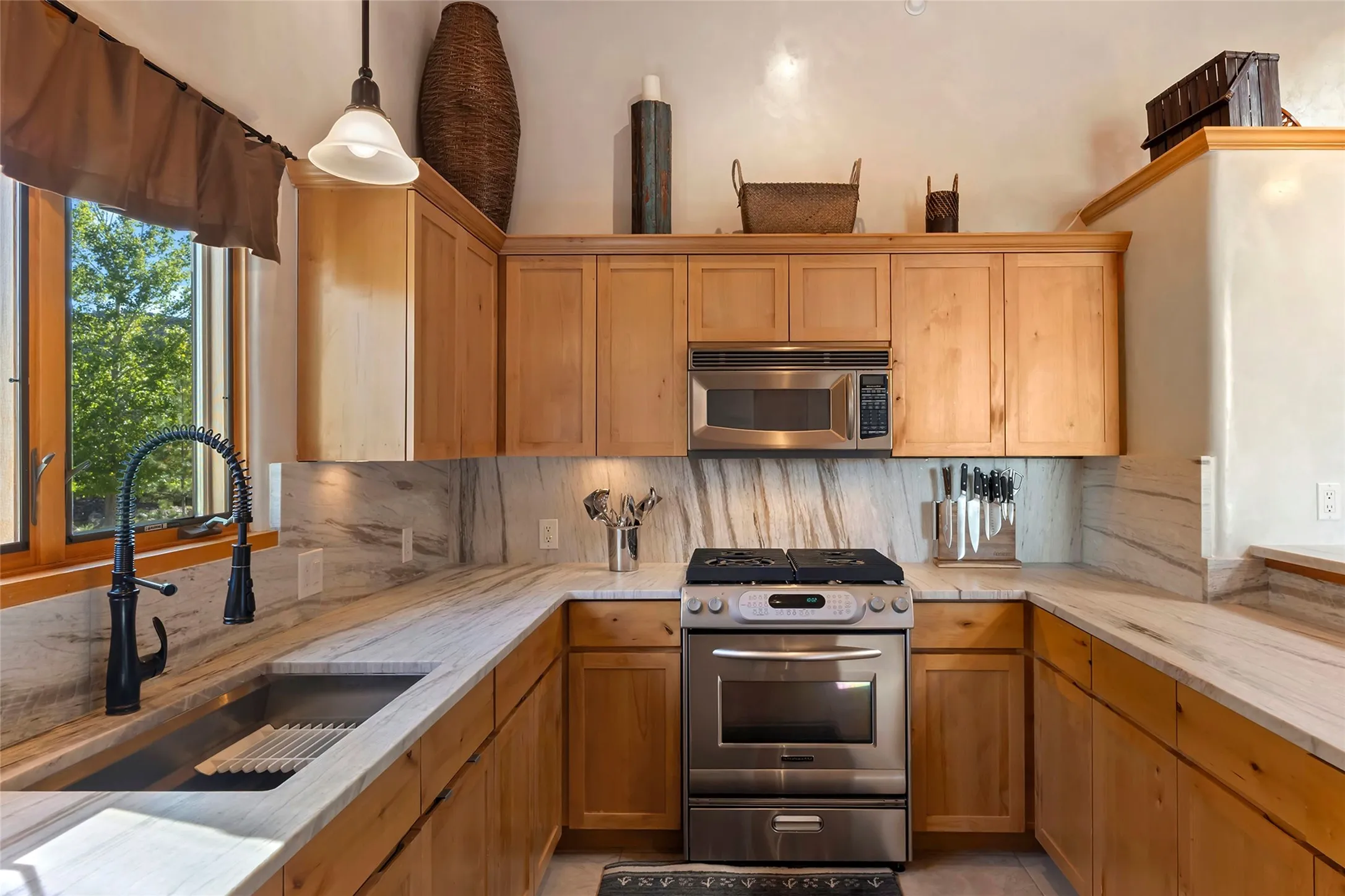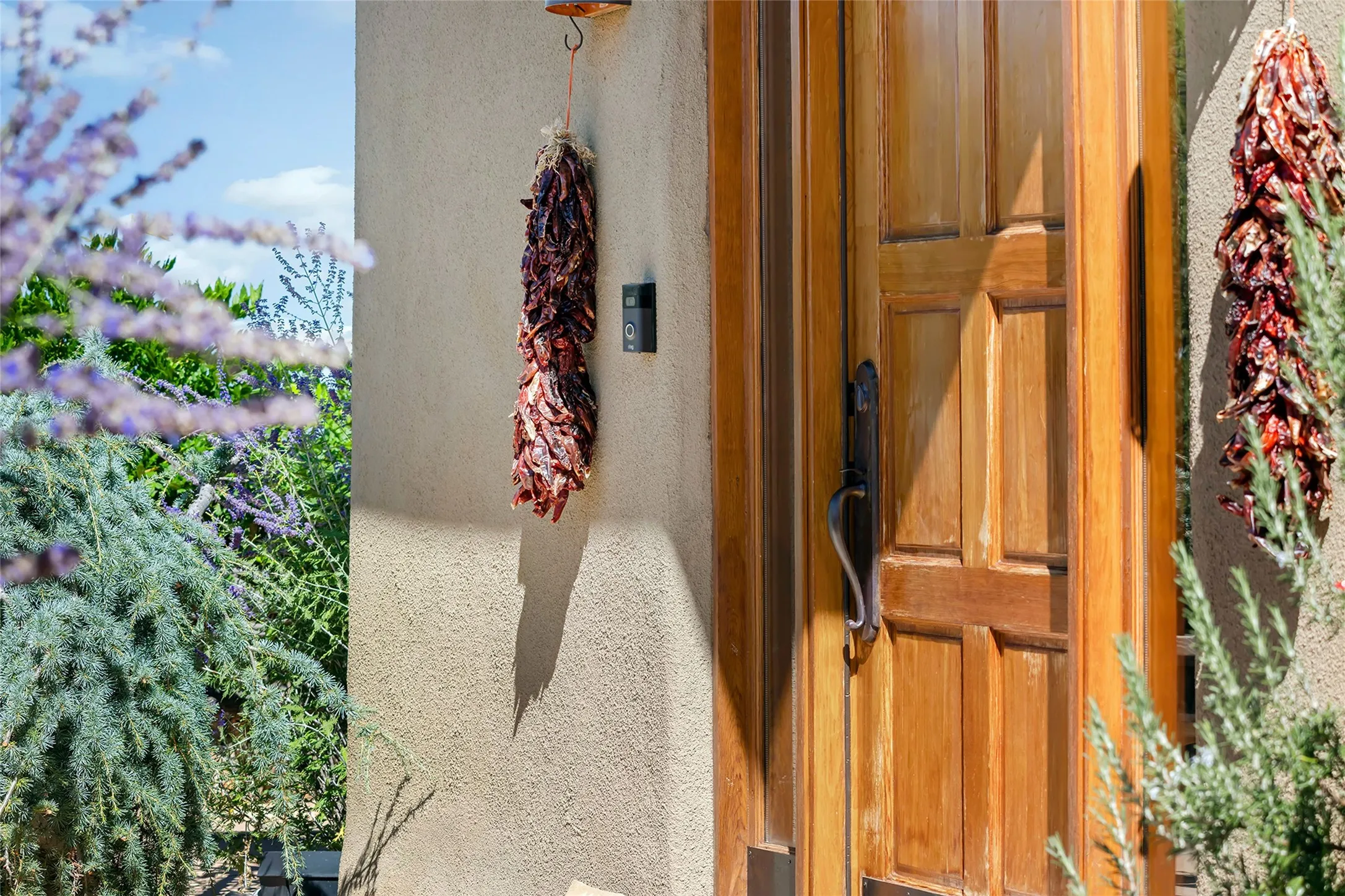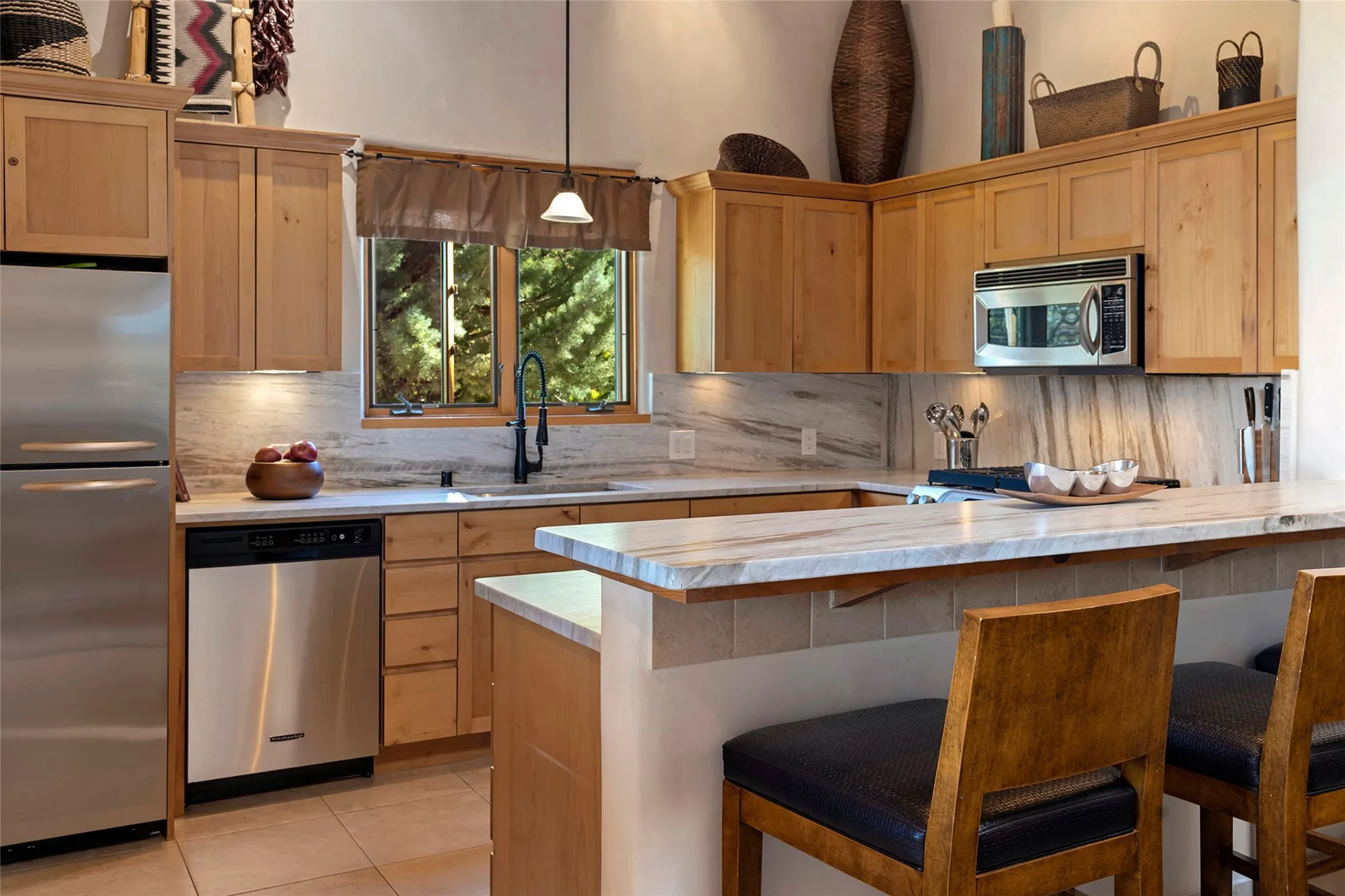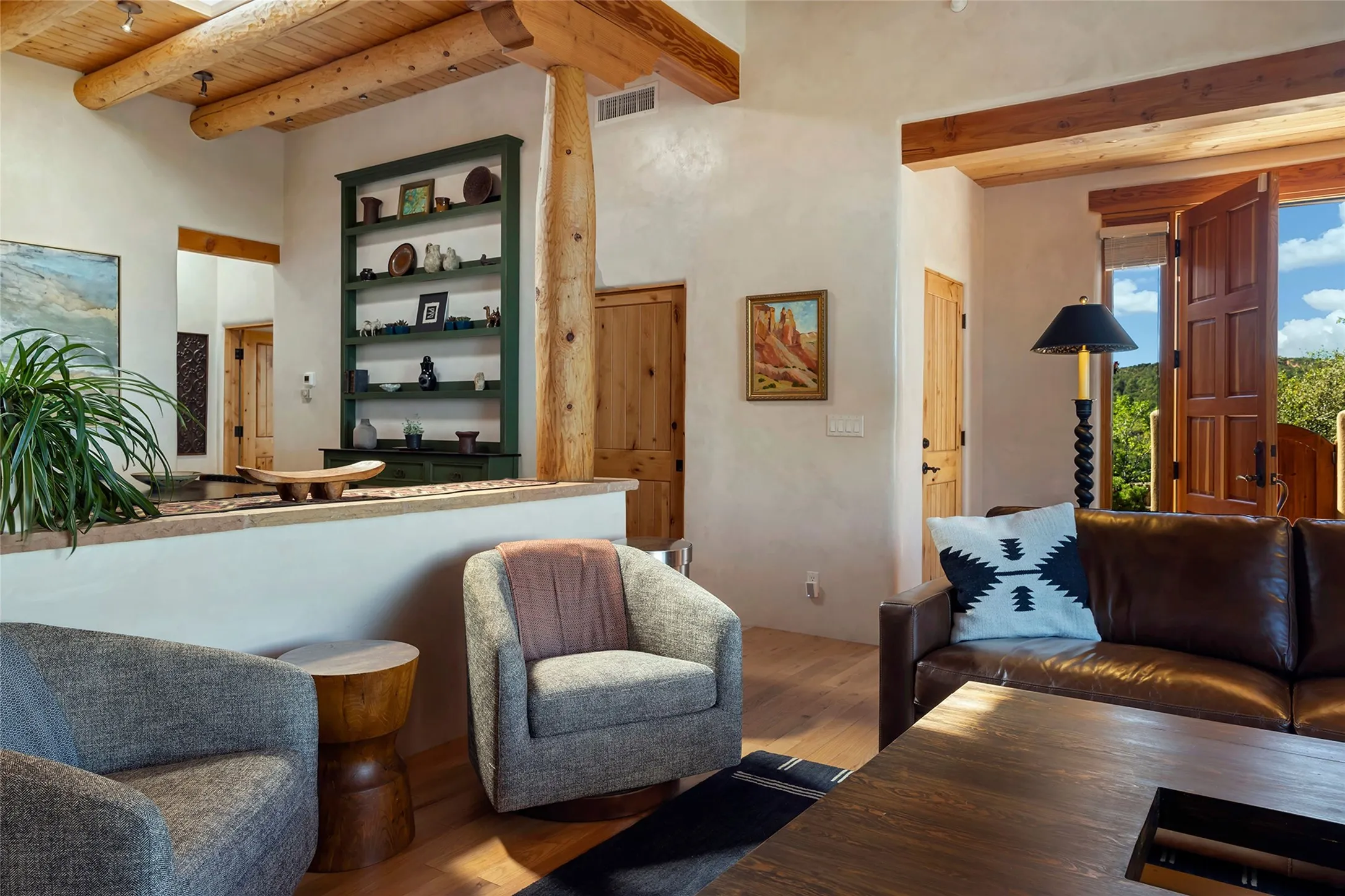 Rare single-level Bishopās Lodge Villa located above the Bishopās Lodge, Auberge Collection Resort. This free standing villa is uniquely located within the gated community perched on the edge of nature with sweeping Jemez Mountain Views and ultimate privacy from neighbors. Price includes a turn-key upgraded furniture package on this professional & locally managed investment opportunity with future bookings in place. A custom entry gate leads to the updated courtyards with coyote fencing, flagstone patios, lush landscaping, and a fire-pit ideal for entertaining & sunset views. Inside, a grand foyer opens to the living room that views the mountain vistas, a fireplace with flagstone hearth, gas logs and glass sliders all opening to an outdoor grilling/dining terrace. The generous kitchen offers updated quartzite countertops, KitchenAid SS appliances with gas range, bar seating and ample storage, opening to an expansive dining area filled with natural light.