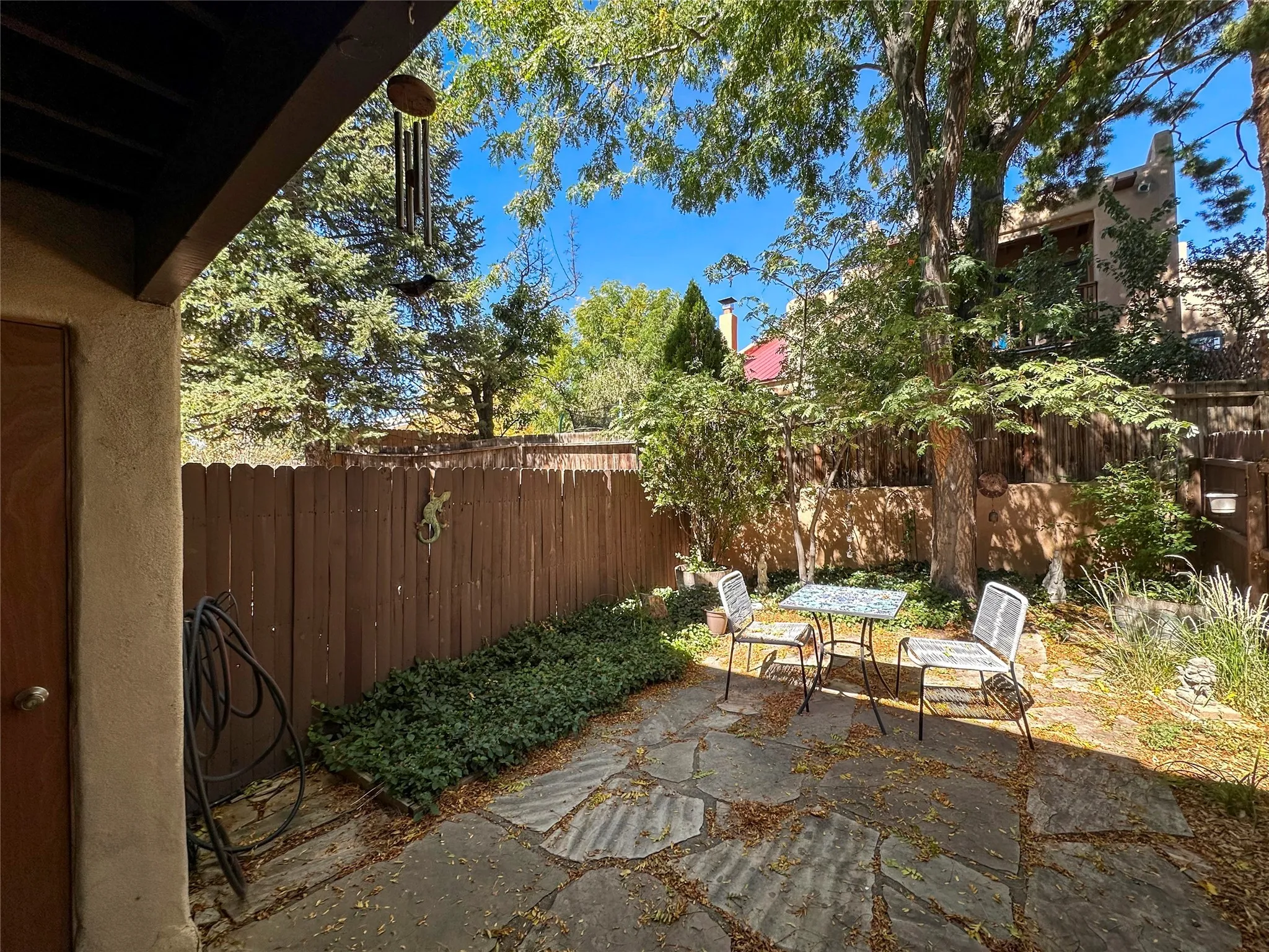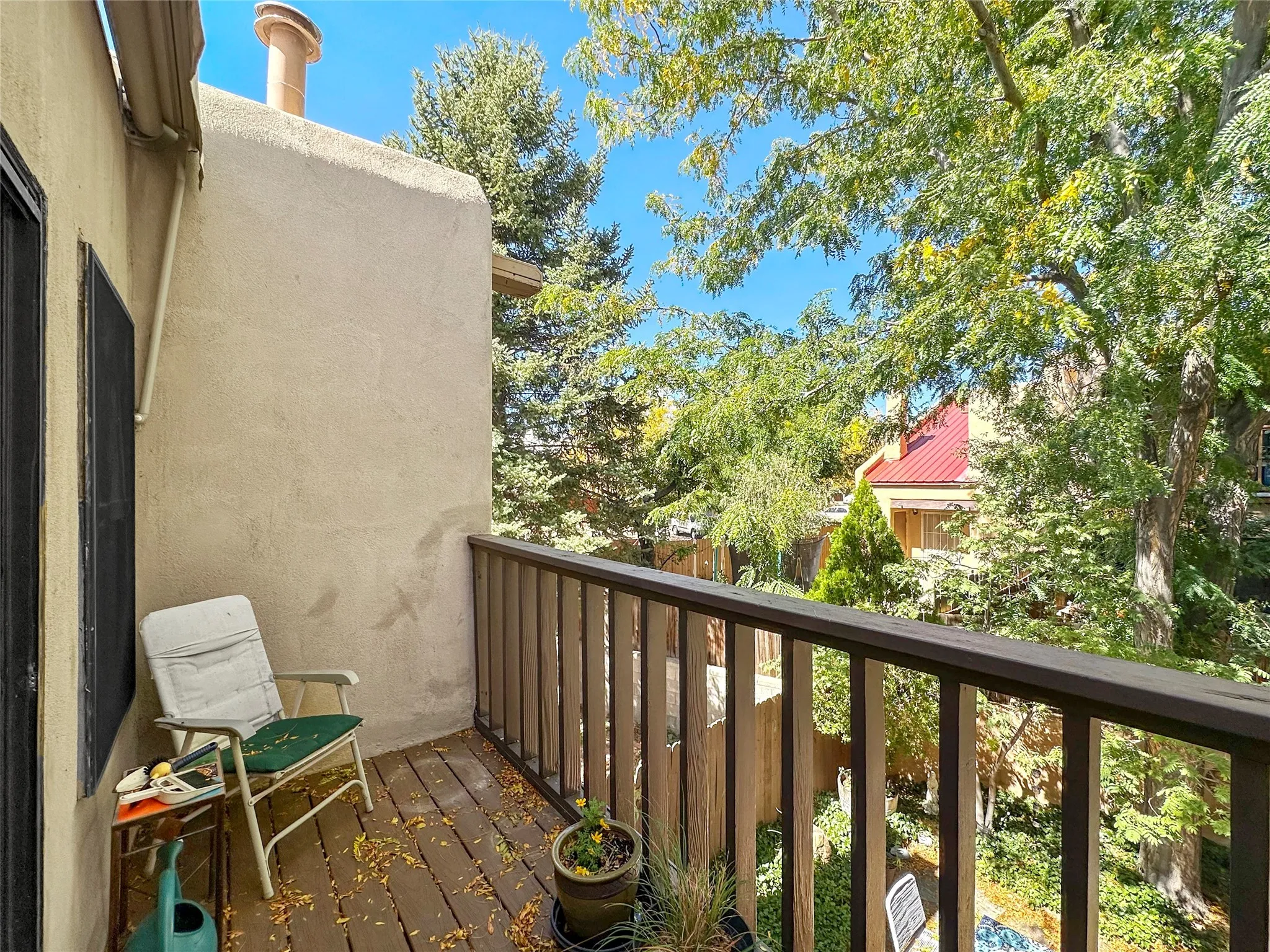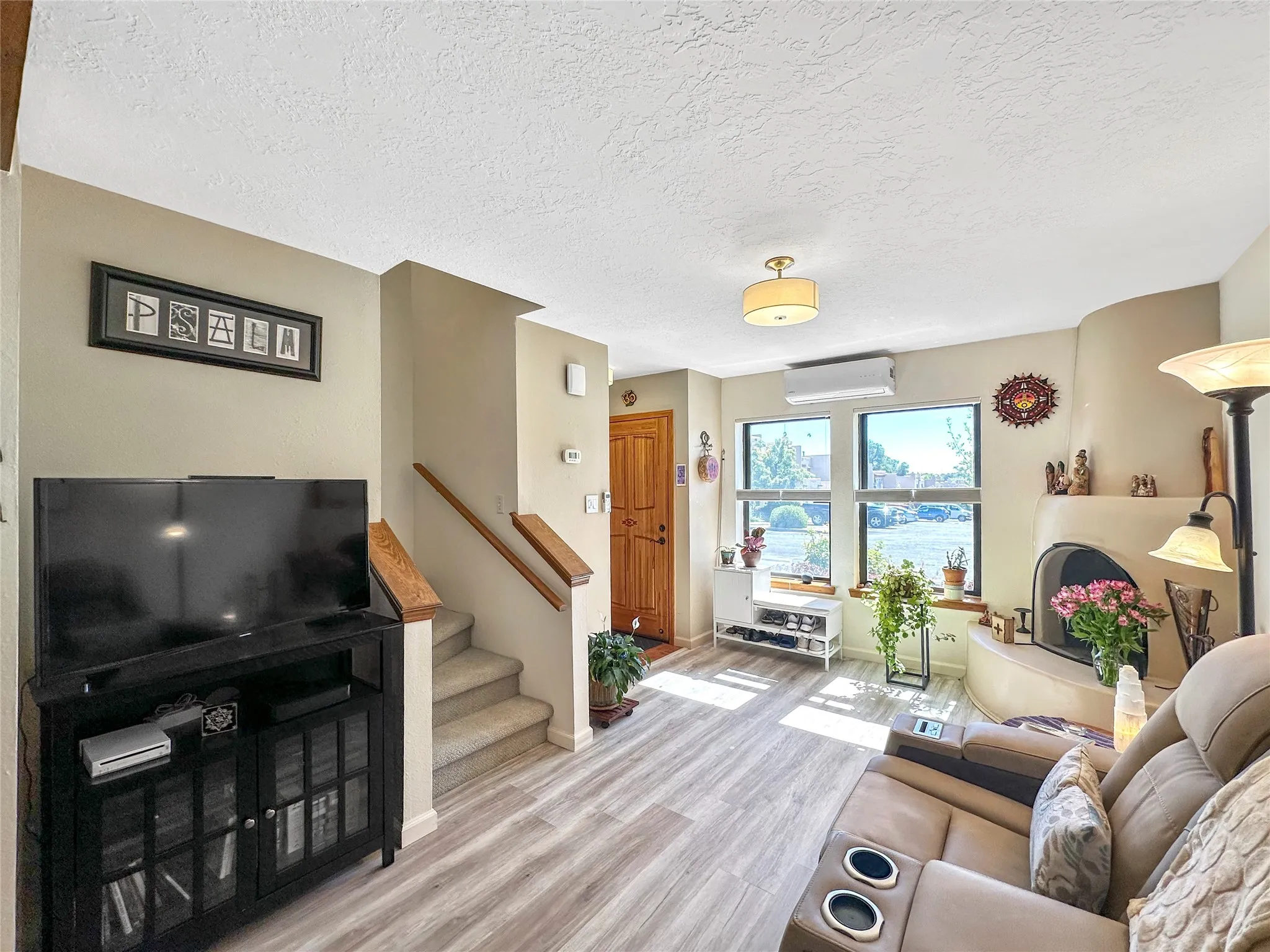 This centrally located and maintained townhome in Avenida De Las Americas is move in ready for the new owner. The well thought out floorplan allows for comfortable space between the living room and dining room while still being within reach of the kiva fireplace heat. Plenty of windows allow light in the home to accentuate the vigas. LVP flooring, countertops, stained cabinets, mini-splits, bathroom shower, and a TPO roof maintenanced in the last 3 years are just a few of the highlights that make this home stand out in this neighborhood. Step out into the large primary bedroom’s balcony to enjoy the cozy view of the back yard that is watered with drip irrigation for peace of mind.