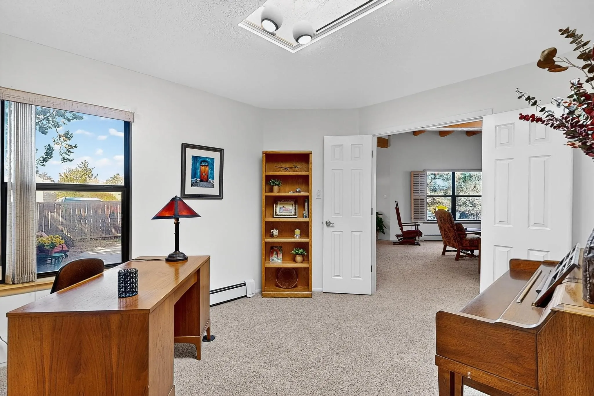 Welcome to this warm and inviting home in the coveted Estates at Park Plaza. Featuring impressive viga beamed ceilings, Saltillo tile, Kiva fireplace and lovely courtyard entry, this home exudes warmth and comfort. The backyard deck shaded by trees, offers a perfect space for outdoor gatherings or quiet evenings. Residents can enjoy fantastic amenities, including a community garden, tennis and pickleball courts, a dog park and 8 miles of scenic walking paths. Located close to shops, restaurants, and just a short drive to the historic Plaza, this home provides both convenience and a sense of community. With recent updates including a boiler, kitchen water heater, refrigerator, dishwasher and stove in 2025, this home is move-in ready.