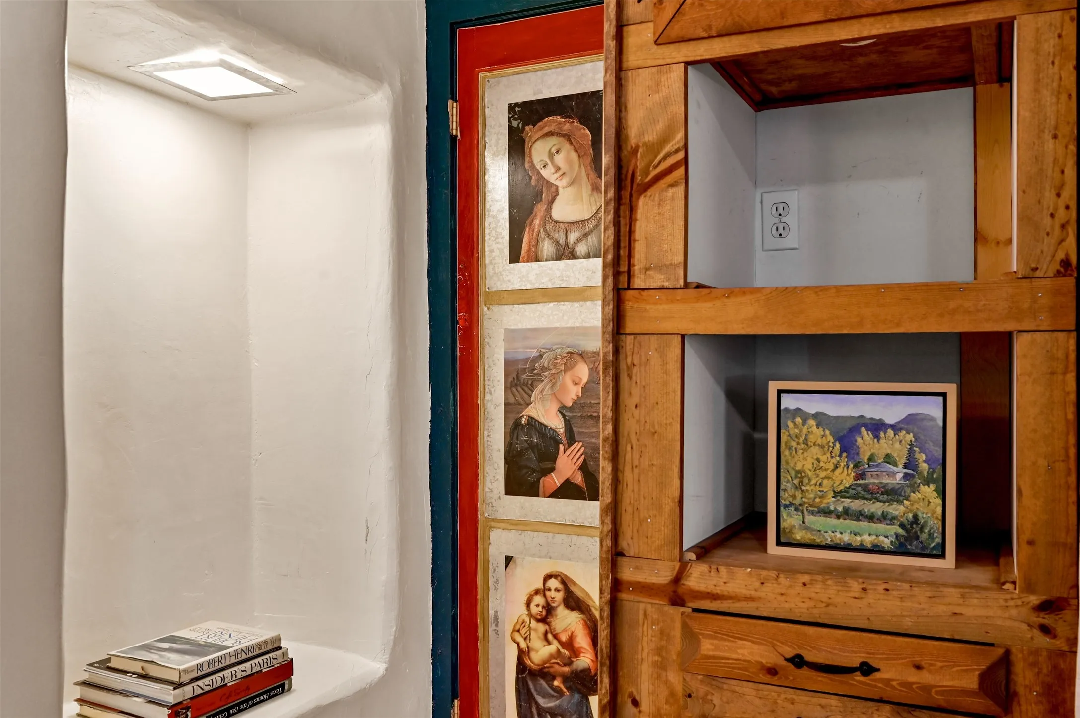 Step into Old World charm with this one-bedroom condo, part of a Pueblo-style adobe dating back to 1921. Outdoor private patio entrance greets you with south facing light. The four large windows bring warm sunlight to the tiled countertop and red bricked floor kitchen. Large dining and living room area offers beautiful old vigas and wood flooring. The pull-out Murphy bed, hidden in the living room, is perfect for those out of town guests or late night sleep-overs. Whimsical hand painted doors throughout pairs beautifully with the colorful mosaic fireplace in the bedroom. Just minutes from Kauneās and the historic Santa Fe Plaza, make this an ideal location for living the Santa Fe dream.