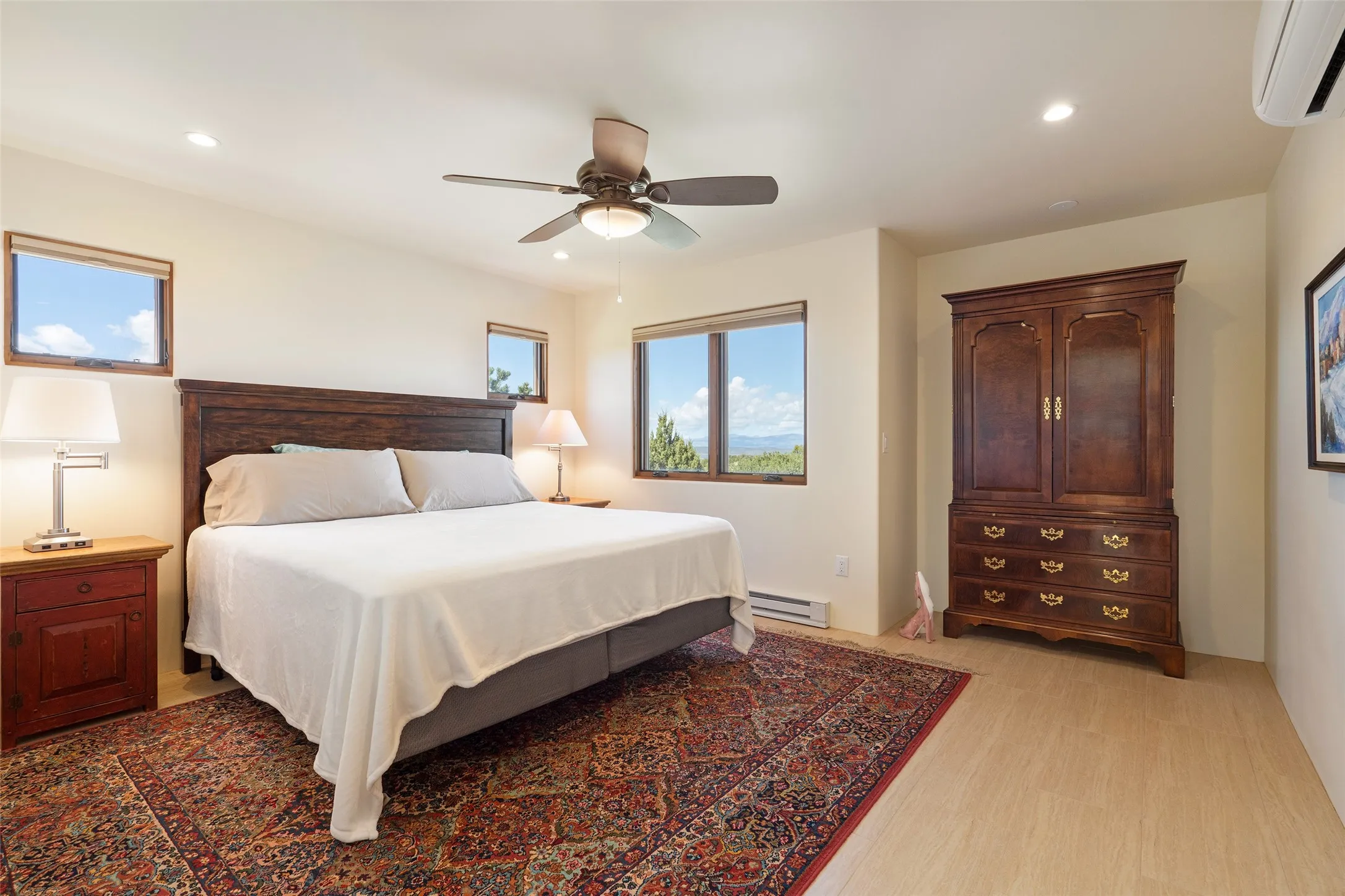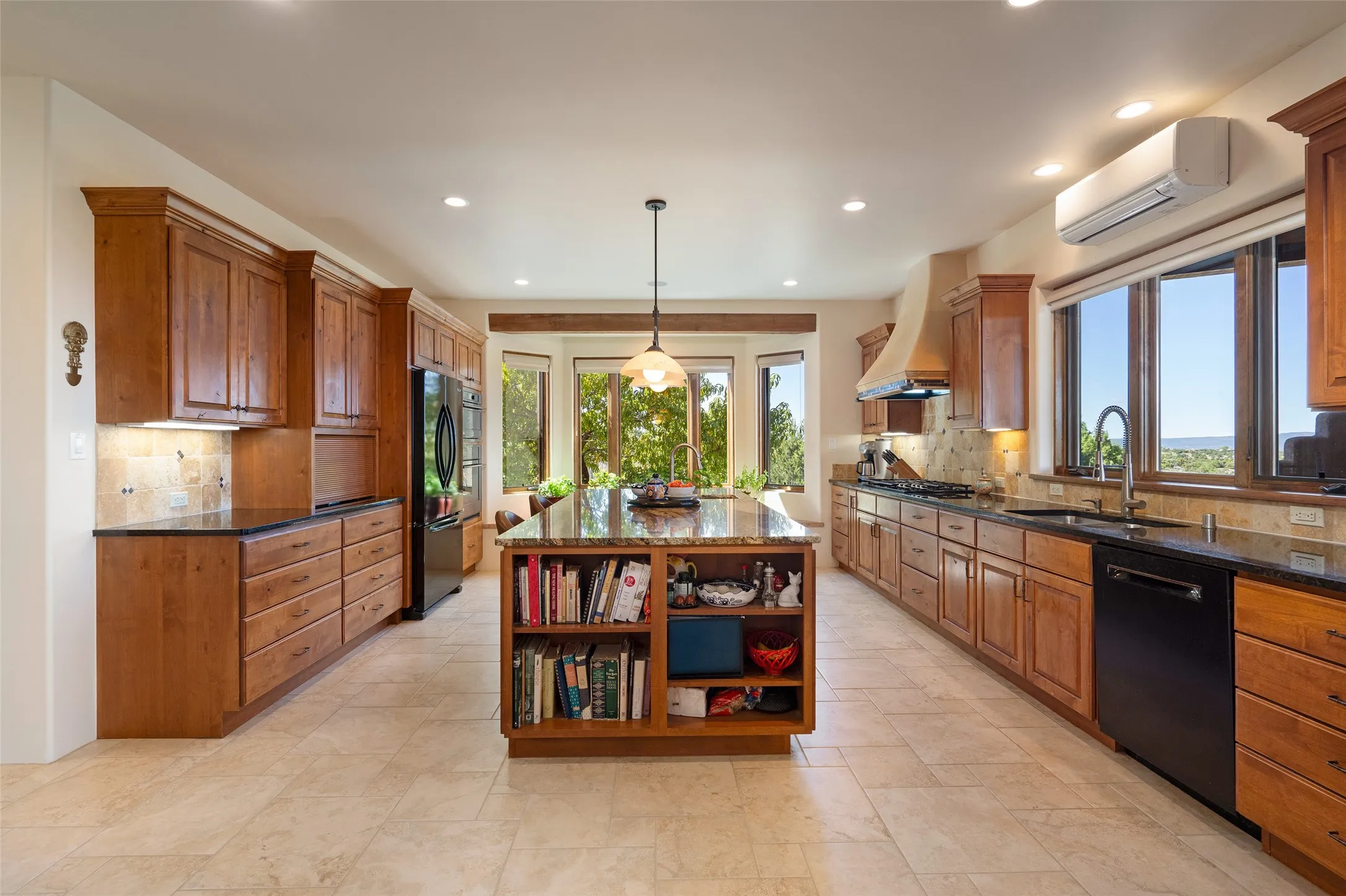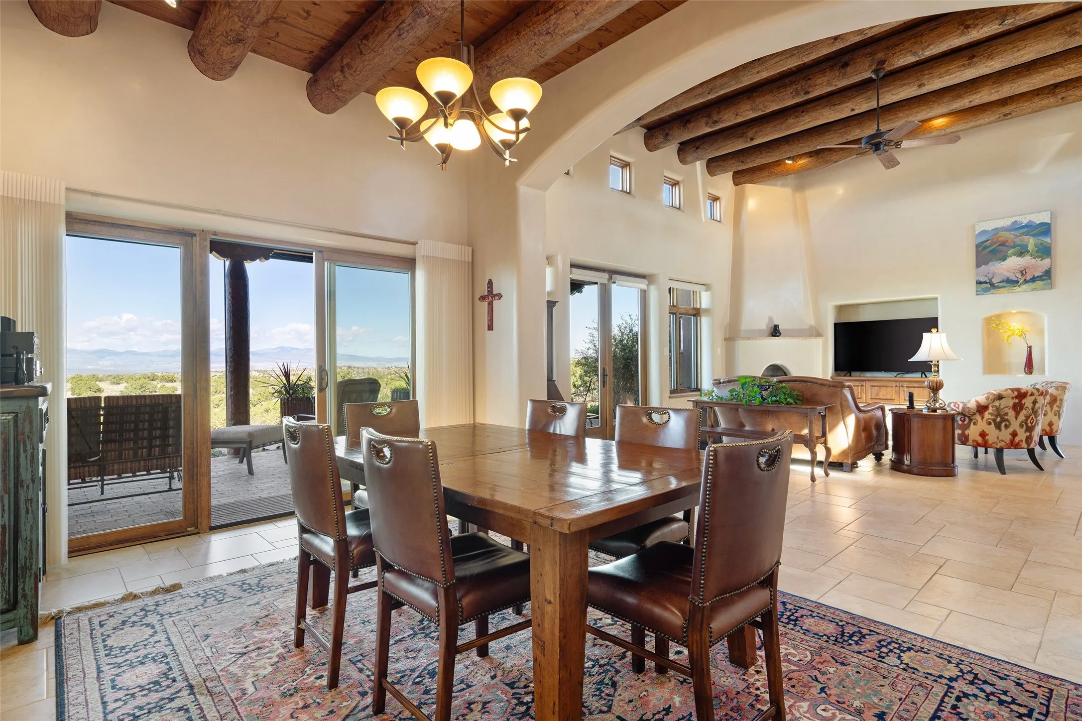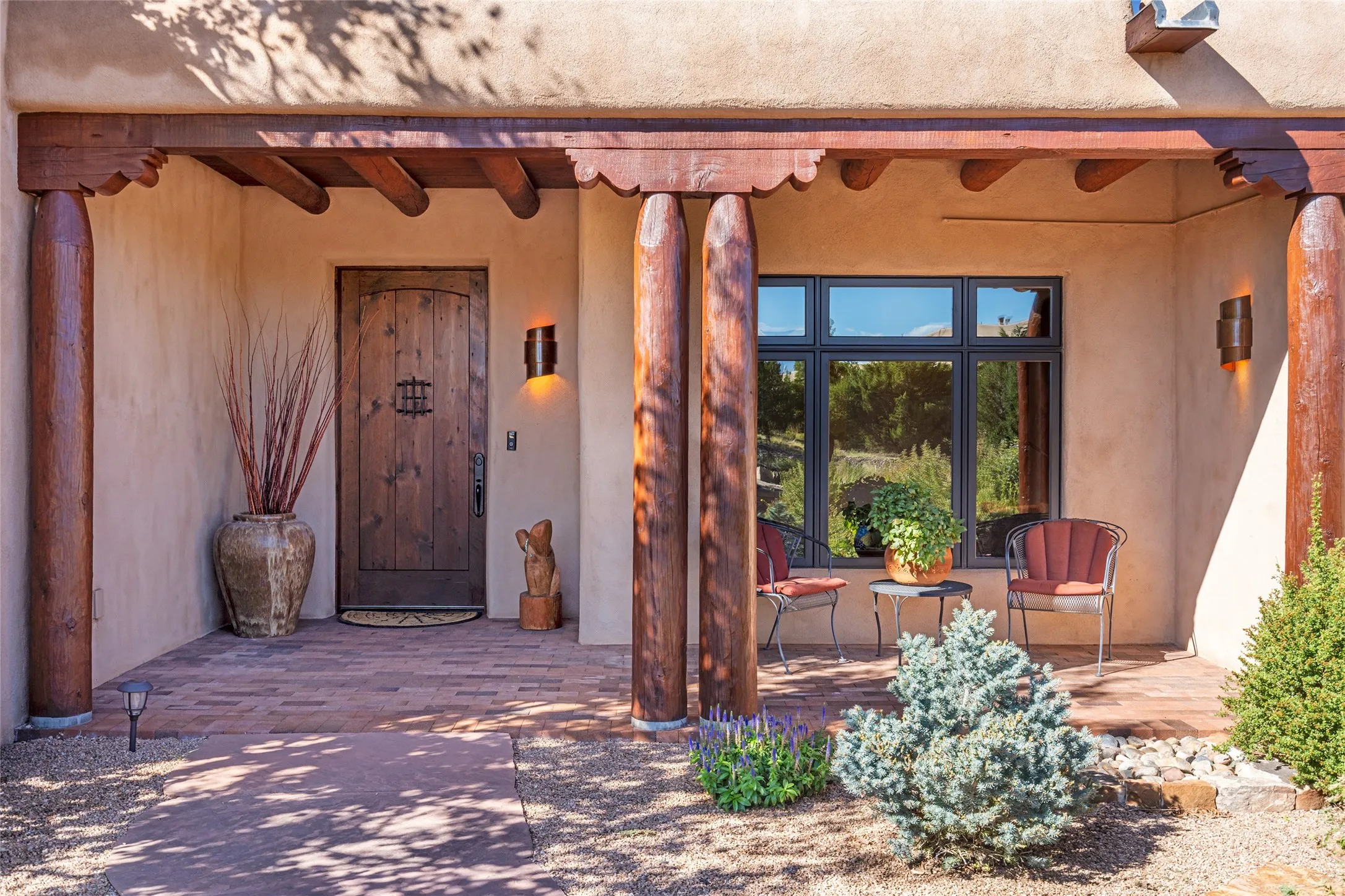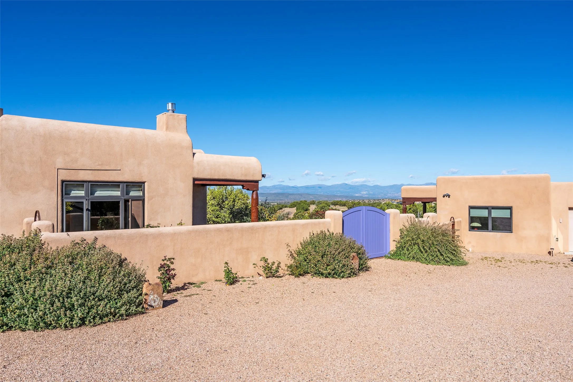 BREATHTAKING SANTA FE STYLE WITH SUNSET VIEWS. Perched on 2.5 acres with unobstructed views of the Western Jemez Mountains, this home was designed with PATTERN LANGUAGE principles in mind including multiple arches that visually repeat throughout the home. This 4-bedroom, 4-bathroom residence (including detached guest house built in 2016) offers the best of Southwestern living with intentional design. Prull Custom Builders built this residence in 2009 for the current owners and the home is sited perfectly to capture glorious sunsets and the dramatic New Mexico landscape, all while blending seamlessly into its natural surroundings. The floor plan ensures excellent separation between the primary suite and guest room, with soaring ceilings, vigas & beams, plastered walls, and abundant natural light throughout. The spacious living room flows to a large sunny gourmet kitchen with multiple granite countertops, a huge island, generous cabinetry, and vistas of the mountains beyond. Radiant in-floor heating and mini-splits provide year-round comfort, while a fully paid Positive Energy solar system keeps electricity costs minimal! The main garage is equipped with EV charging support. Outdoor living is equally inviting with covered portals, brick paver patios, a fireplace, and flagstone paths leading to the guest house – complete with its own garage for added privacy. The landscaped grounds include a fenced backyard for pets and a charming side garden, offering a balance of beauty and function. Free from HOA restrictions, with a newer paved road, privacy and coveted location, this property is an exceptional blend of style, sustainability, and Santa Fe charm.