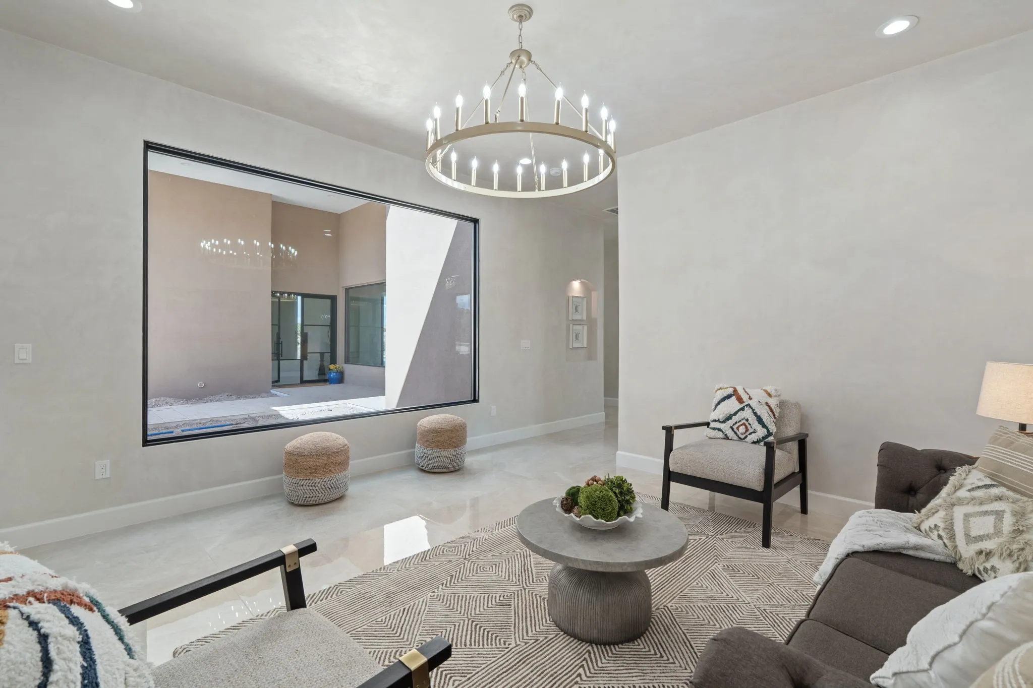Nestled in the prestigious Las Campanas community of Santa Fe, this newly built custom single story estate blends modern elegance with timeless Southwestern charm. Perched to overlook the lush fairways of the world-class golf course and endless views to Jemez mountains, the home offers an unmatched lifestyle of sophistication and serenity. As one of the few residences approved for a private pool, it also features a soothing hot tub for year-round enjoyment. Expansive outdoor living spaces are paired with built-in speakers both inside and out, creating the perfect setting for entertaining or relaxing. Inside, enjoy breathtaking views through oversized Pella windows spanning more than 10 feet wide. The chefās kitchen is outfitted with high-end appliances, a spacious island, and refined finishes. The master suite and main living areas are enhanced with radiant in-floor heating for comfort in every season, while each bathroom has been individually designed with custom touches, including built-in mood lighting in the showers. Practicality meets luxury with a fully outfitted laundry room, mudroom entry from the garage, and an oversized epoxy-coated garage ideal for vehicles and recreational toys. Additional details such as Venetian plaster walls and thoughtful design elements throughout make this home truly one of a kind. Built by Candelaria Homes, you ‘ll know you made the right choice. Don’t miss this rare opportunity in Santa Feās most sought-after enclave offers a retreat of elegance, comfort, and distinction.