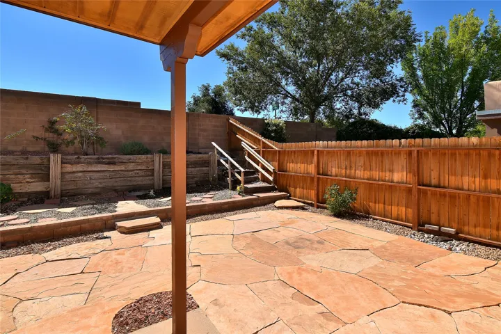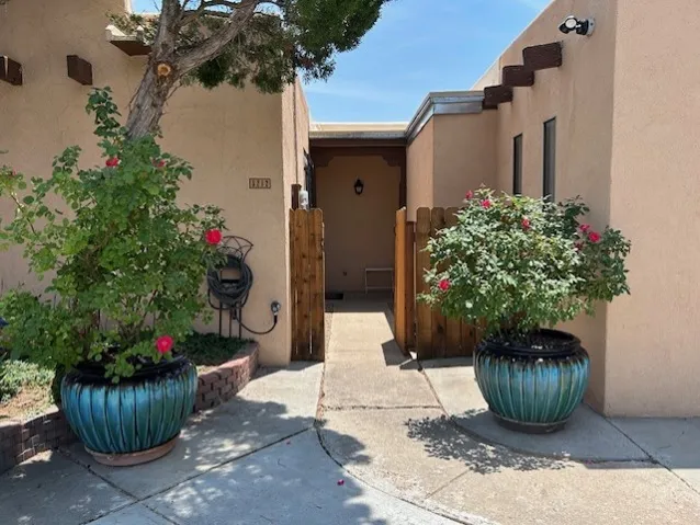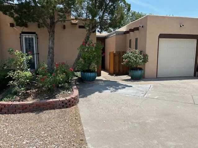 Beautiful, updated, light and bright and freshly painted home in Pueblo de Rodeo Rd. This single level home offers 3 bedrooms, 2 bathrooms and a 1-car garage with a spacious double driveway providing ample parking. An enclosed front entry courtyard welcomes you into the home. The galley kitchen features granite countertops, tile backsplash, pantry and new microwave in 2025. The backyard is private and offers a covered porch with flagstone and a large shed. Lovely features and amenities include: Newer windows-Remote Hunter Douglas top/down blinds-TPO roof-Tile and carpet floors-New washer and dryer in 2025 including water filter/softener system-Ceiling fans-Walk-in closet in primary suite-Carpet in the bedrooms. Super sweet home not to be missed.