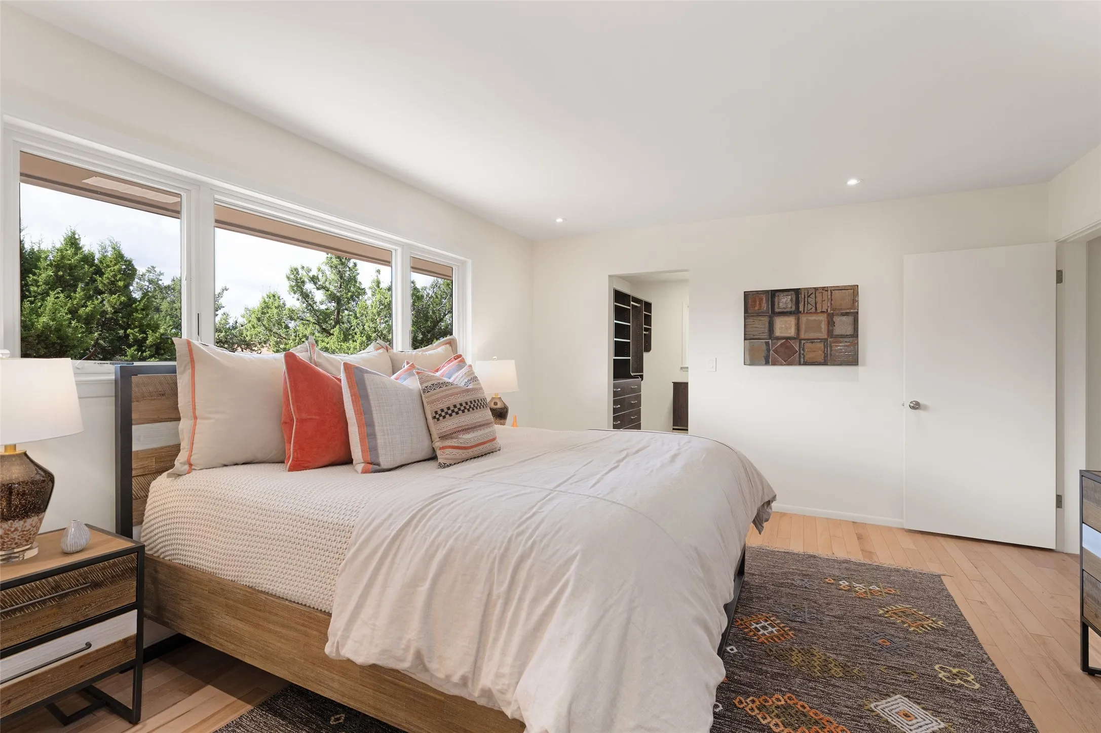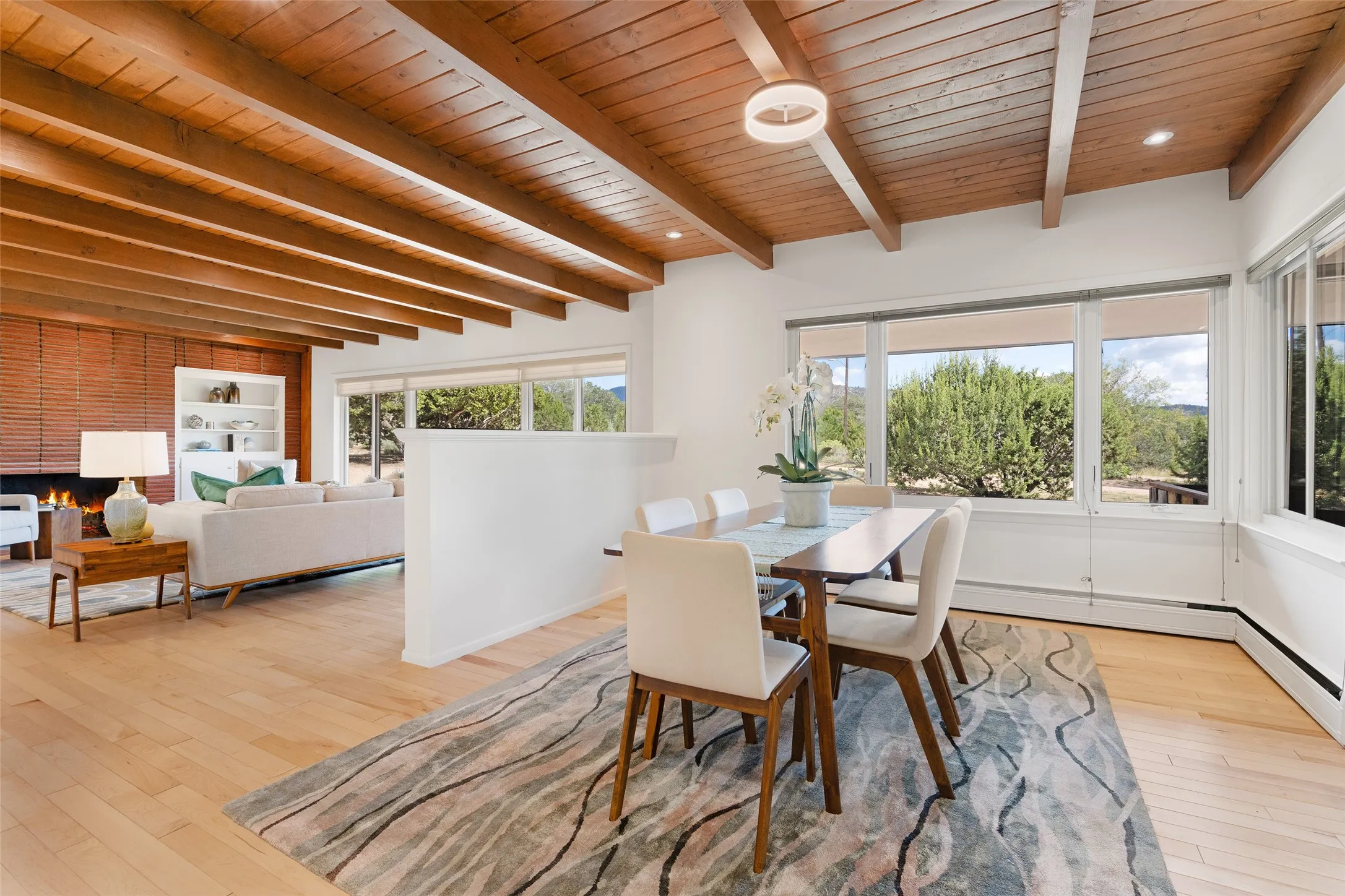 Set apart from the ordinary and just 2.5 miles from the Santa Fe Plaza, this striking custom Stamm home blends classic Northern New Mexico pitched-roof architecture with timeless Santa Fe charm. Sited on a generous 0.70-acre lot with expansive views of the foothills and Ortiz Mountains, this home offers a rare sense of space and privacy ā all while keeping you close to the heart of town. Thoughtfully renovated throughout, the main residence features three bedrooms, wood floors, and a warm, wood-plank ceiling with exposed beams. The living room centers around a charming brick fireplace flanked by custom bookcases, and the stylish kitchen boasts cool glass tile backsplash, great gas cook top, ample storage, and even a wood burning fireplace for ambiance. The sunlit primary suite includes California Closets and a beautifully modern bath with a large walk-in shower. A fully operational photovoltaic solar system helps keep energy costs low. A standout feature of the property is the detached 750-square-foot studio ā complete with its own 100-amp service, ¾ bath, soaring ceilings, custom wrought iron doors, and an upstairs loft (not included in the listed square footage). Whether you’re an artist, entrepreneur, or simply seeking bonus flex space, this studio delivers. Recent improvements include a Propanel roof, new Anderson windows, high efficiency tankless water heater, remodeled bathrooms, new tile and wood flooring, updated kitchen countertops (2024), all-new interior lighting (2023), and fresh paint throughout (2025). This is a one-of-a-kind offering that feels private and peaceful ā yet is mere minutes from galleries, dining, and all the cultural vibrancy of downtown Santa Fe.