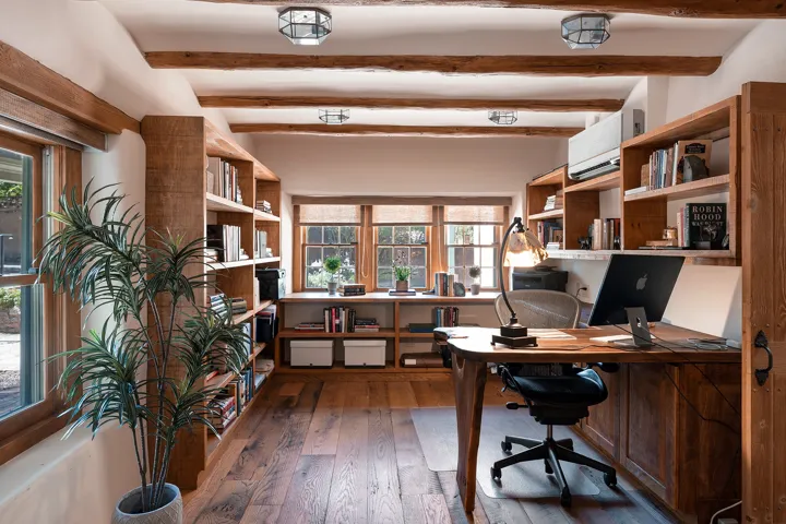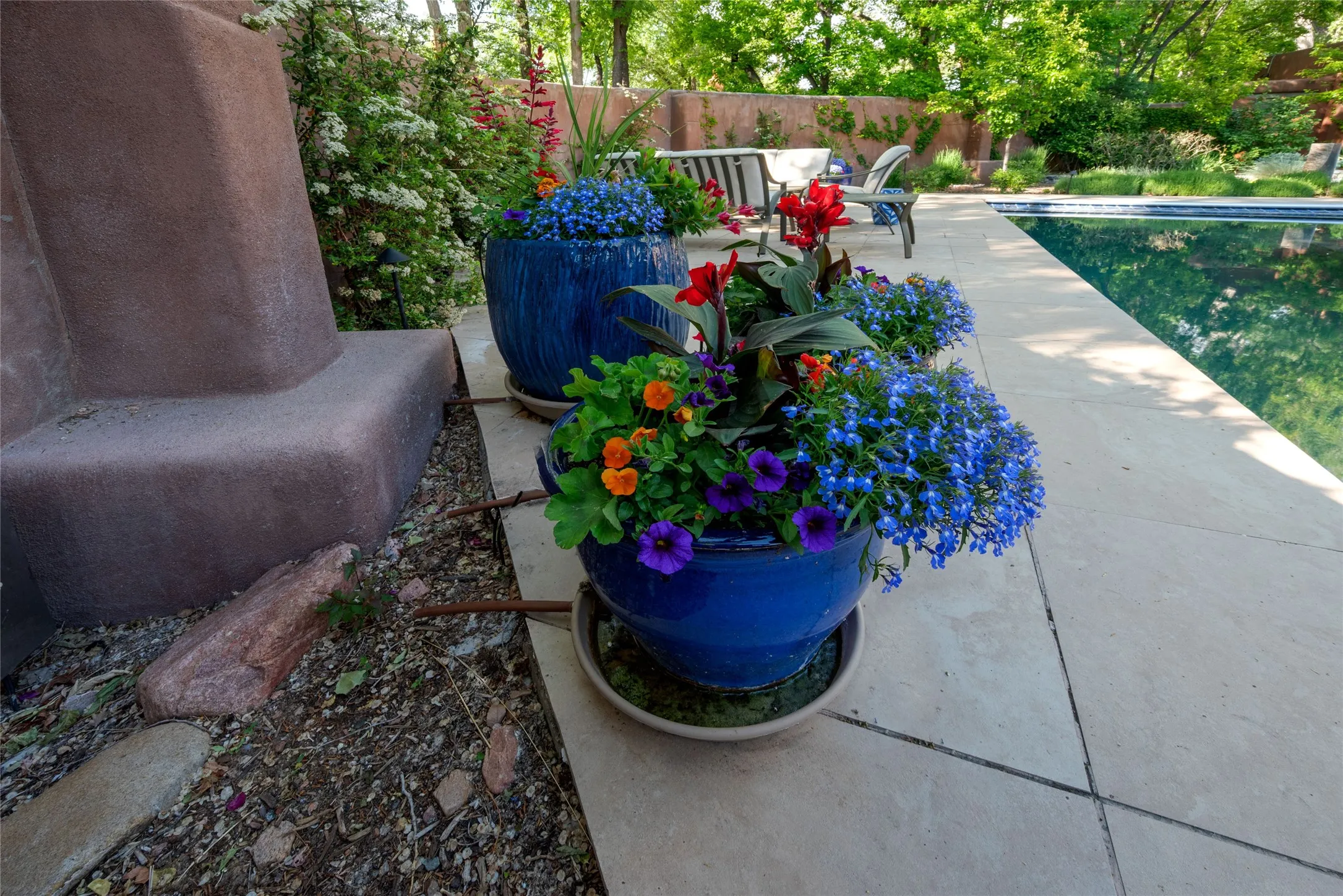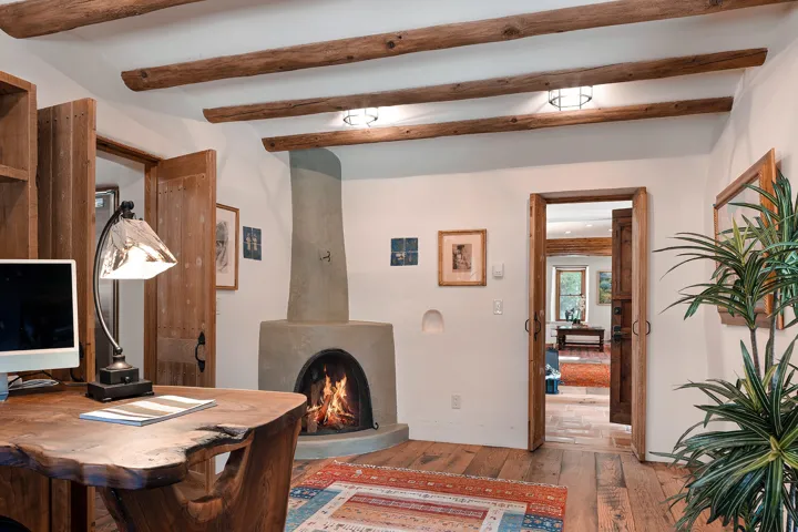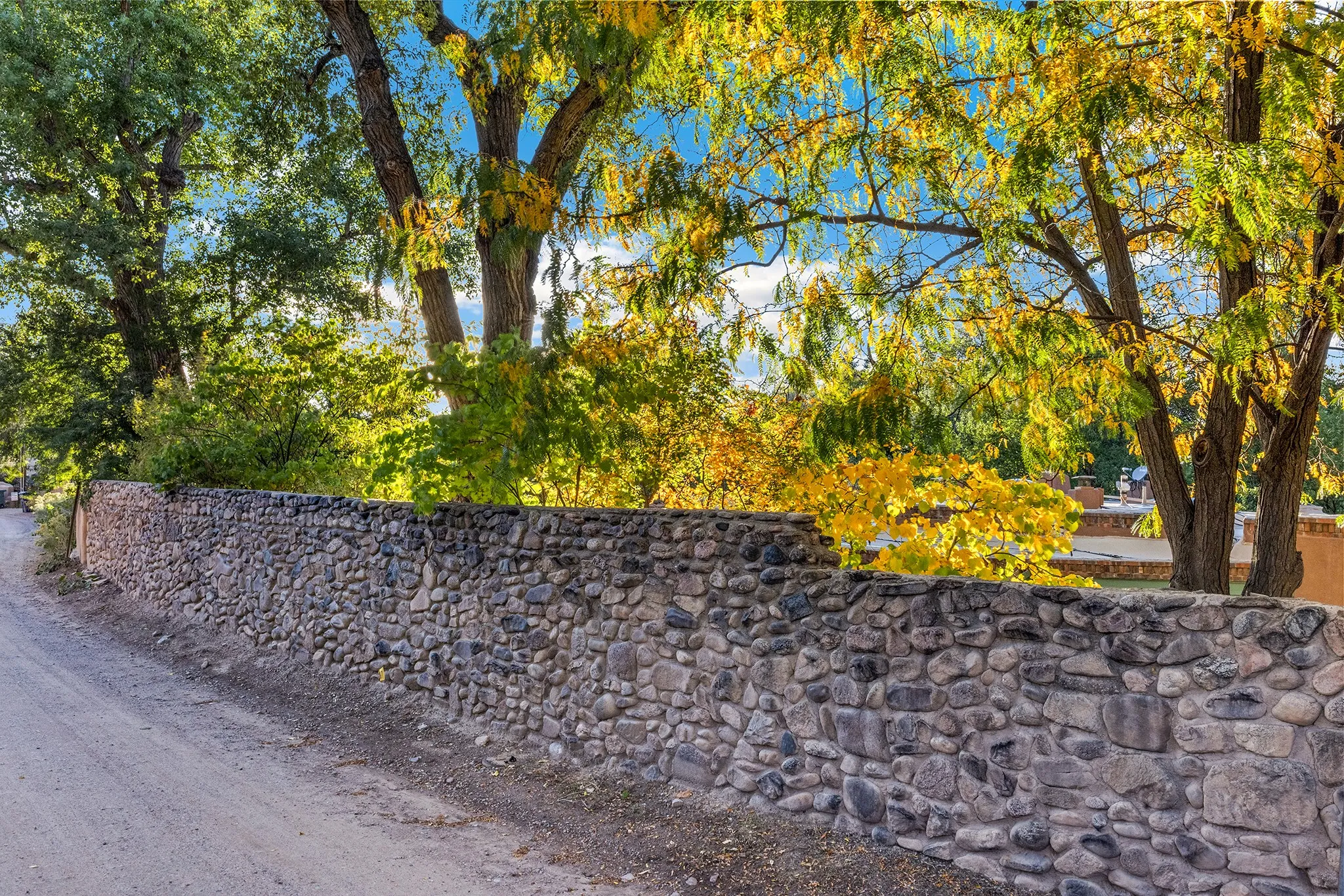 481 Arroyo Tenorio, behind an iconic stonewall in the heart of the Historic East side and the Acequia Madre runs through it! Tucked away and gated on a serene lane in the coveted Historic District is this enviable compound which blends traditional Santa Fe architecture with modern comforts. Thick plastered walls, vigas, coved ceilings, and multiple fireplaces create warmth and authenticity, while large windows and French doors invite abundant natural light. An elegantly designed pool, hot tub and extended outdoor living space and vegetable garden were added in 2022.