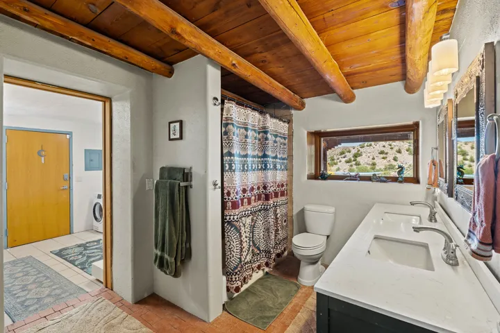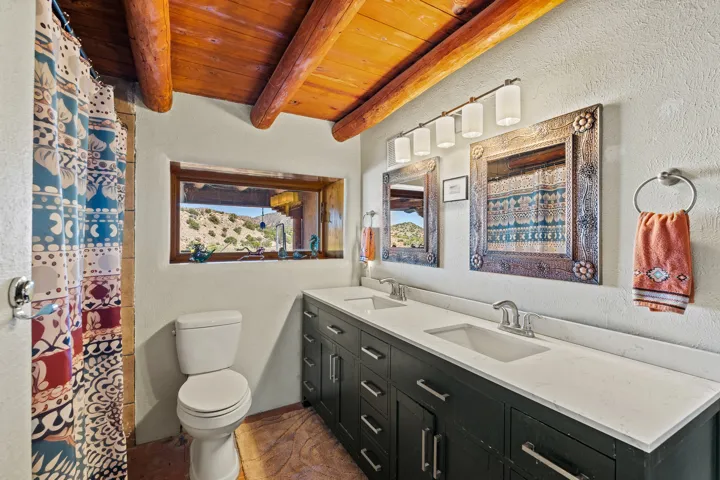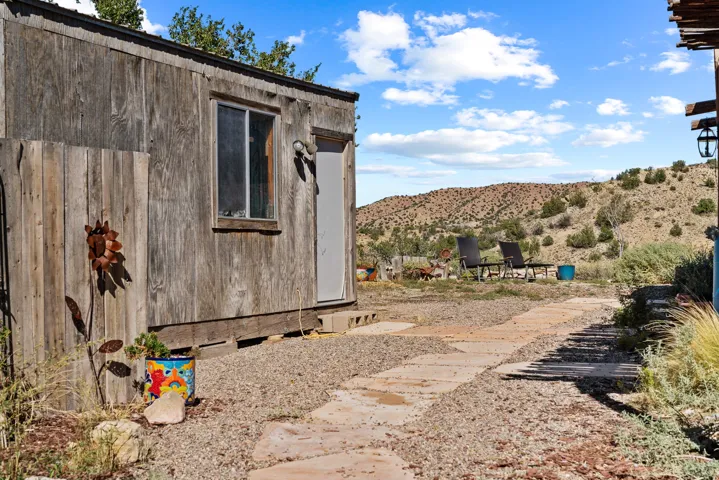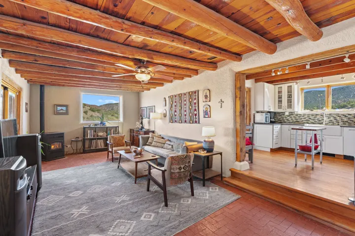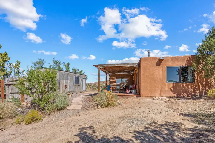 Nestled beside a breathtaking canyon which is part of the historic San Antonio de Las Huertas Land Grant, this charming adobe homeādating back to the 1940sāsits on two tranquil acres surrounded by sweeping mountain views. Thoughtfully updated to preserve its authentic Southwestern character, the home features traditional vigas and wood plank ceilings that create a warm, inviting atmosphere throughout.Ā Step onto the spacious covered portal, complete with vigas and a brick floor, and take in the serene vistas of the Sandia and Jemez mountainsāan ideal setting for outdoor dining or entertaining. Through sliding patio doors, the main portal opens into a cozy living room with a new pellet stove and beautifully plastered adobe walls. The remodeled kitchen blends rustic charm with modern convenience, offering a country-style farm sink, quartz countertops, newer appliances, and a butcher block island. Both bedrooms are generously sized, and the home is outfitted with Pella windows and patio door. Recent upgrades include a new membrane roof system, hot water heater, and main electric panel all installed in September 2025.Ā Additional features include a 320-square-fo square-foot workshop (sold āas-isā), a 108-square-foot storage shed with a picture window, and a large, fenced yard perfect for dogs. An older addition presents exciting possibilitiesāwhether as an expanded dining area or a second portal. Best of all, thereās no HOA to limit your vision for this unique property.