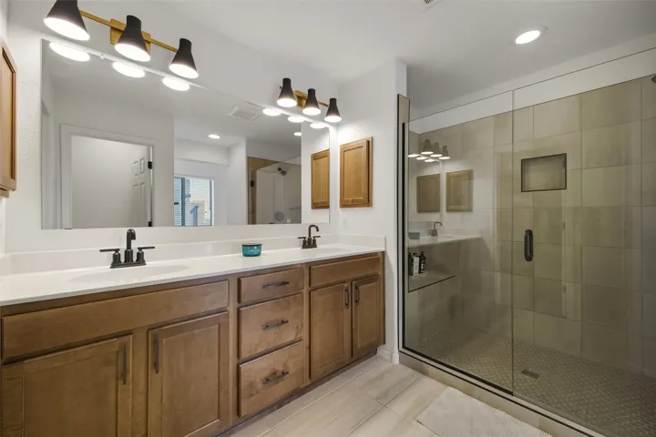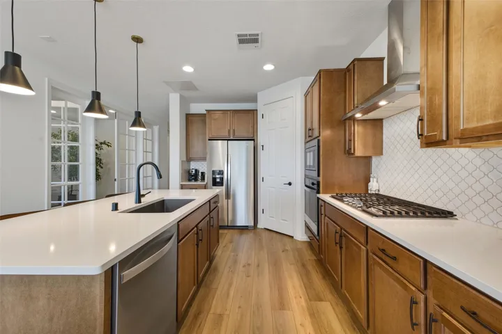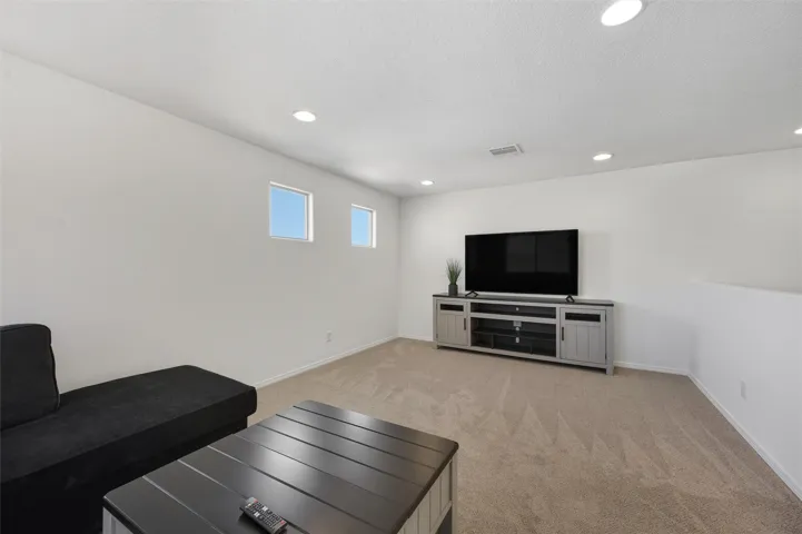 Welcome to your nearly new, 2023 Pulte home, the lovely covered entry portal provides protection from the weather, inside youāll be surprised by the double door closet providing ample storage space. The light and bright floor plan begins with a spacious living room that blends well with the open-concept kitchen and dining space, luxury vinyl flooring throughout. Your well-equipped kitchen features a generous island with seating, spacious pantry, wall oven, 5-burner gas cooktop, modern finishes, newer stainless-steel appliances, custom cabinets, and beautiful quartz countertops. Two sliding doors across from the island offer you easy access to enjoy the lovely Santa Fe weather while you lounge under your covered patio in your private-side courtyard. Just off the kitchen, adorned with beautiful French doors, youāll find a dedicated flex space that you could use as an office, den, or media room, centrally located but separate. The first floor also features a full-sized laundry room, below stair closet/storage and easy access to your two-car garage, all providing you more storage spaces. Upstairs, youāll discover your versatile bonus room, perfect for a kidsā playroom, home gym, media space, the opportunities are endless. Your home comes complete with two bedrooms that share a full bath in the hallway, and a spacious primary ownerās suite. The primary en-suite bath features double vanities, a generous glass-enclosed tiled shower, and a private water closet, all connected to a large walk-in closet. Your home features an on-demand, energy efficient, tankless hot water heater, central heat and refrigerated A/C, all designed to provide hours of indoor comfort. The Las Soleras community is located just minutes from I-25, the 599, medical facilities, and a plethora of shopping and dining options. Bordering the Las Soleras community youāll find a large open space featuring a park that offers a basketball court, playground, dog run, walking trial and a cabana for entertaining.