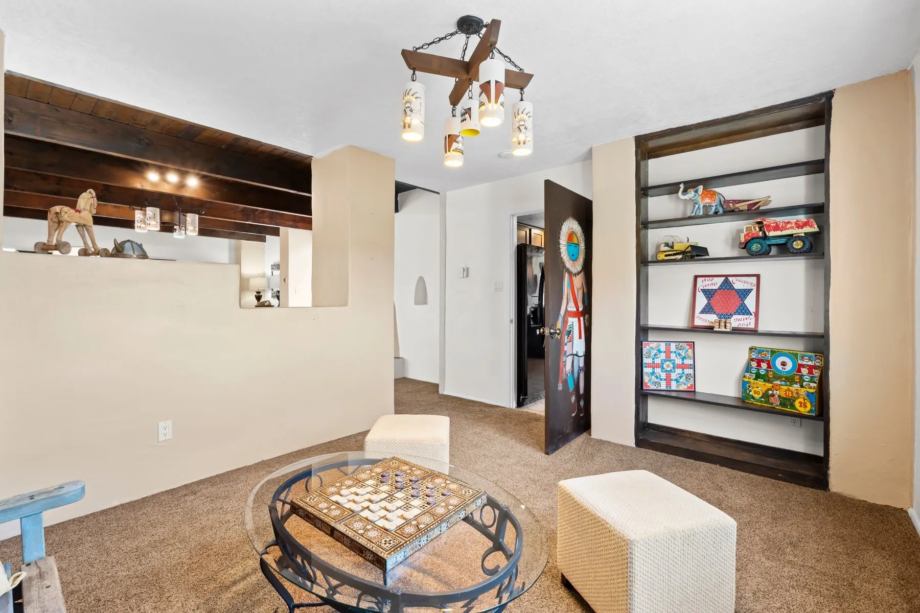 Discover the creative potential of this Pueblo Revival home in Eldorado ā a sought-after Santa Fe community known for its trail network, community amenities, and easy access to I-25 and downtown. Set on a flat, private 1.65-acre lot just 15 minutes from Santa Feās historic Plaza, this spacious 4-bedroom, 4-bathroom, 3,758 square foot two-story residence blends Southwestern character with abundant flexible space, ideal for artists, hobbyists, or anyone seeking room to live, work, and create. A dramatic entry welcomes you into a spacious living room with dual-sided kiva fireplace that flows into a flex space and sunroom opening to a secluded walled patio with Sangre de Cristo mountain views. The kitchen features quartz countertops, dual ovens, custom cabinetry, and a generous dining area, while brick and tile floors, banco seating, custom kachina-painted doors, and beamed ceilings add timeless style. Upstairs are four bedrooms with walk-in closets, including a large primary suite with two decks, dual baths, bonus room, and a second fireplace. A main-level bonus room off the oversized five-car garage offers additional options for a studio, workshop, or gym. Additional highlights include skylights, a greenhouse with hot tub, storage shed, and private outdoor living spaces ideal for sunrise and sunset views. The level acreage offers space for future gardens, with community trails and Santa Fe Rail Trail access just steps away. Eldoradoās community center with pool, tennis courts, stables, shopping, and Eldorado Community School are minutes from your door, while downtown Santa Fe, medical centers, and galleries are a short drive away. This versatile property offers rare space, privacy, and flexibility in one of Santa Feās most desirable communities ā a peaceful retreat that can evolve with your lifestyle and fuel your creative pursuits.