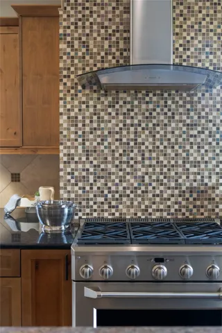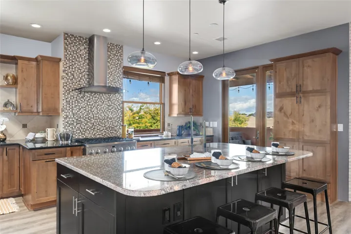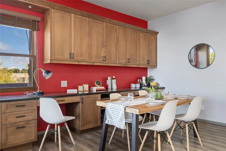 Upstairs, the light-filled two-bedroom, two-bath residence impresses with soaring ceilings, large windows, and an open floor plan. The chefās kitchen includes abundant workspace, a barstool-friendly island, sleek tile backsplash, and a GE Monogram six-burner cooktop/oven. The living area extends to a delightful outdoor deck, perfect for entertaining or enjoying mountain views. Luxury vinyl plank floors run throughout, creating a warm, modern feel.