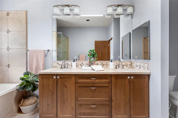 The spacious primary suite boasts a California Closets walk-in with built-ins, plus a spa-like bathroom with dual sinks, soaking tub, and separate shower. A second upstairs entrance from the back courtyard offers added flexibilityāallowing the option to rent one level while living in the other.