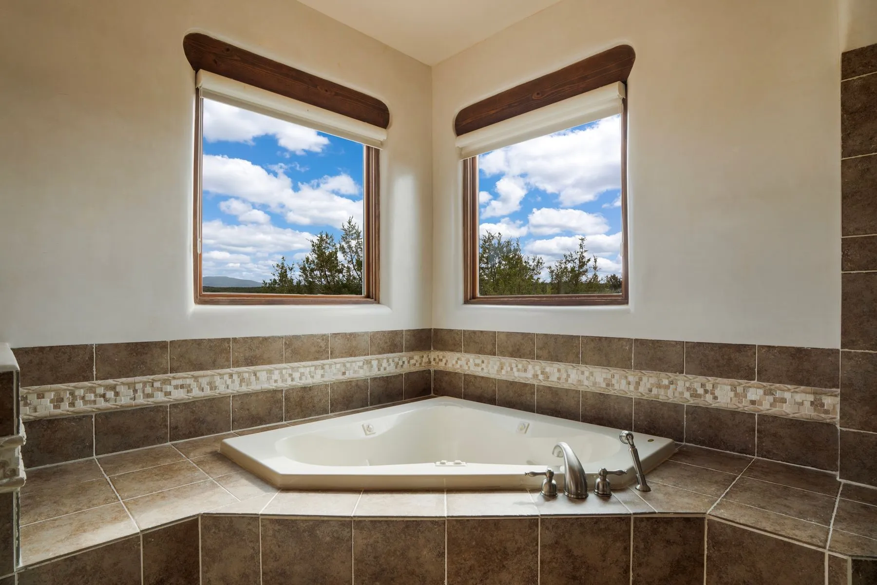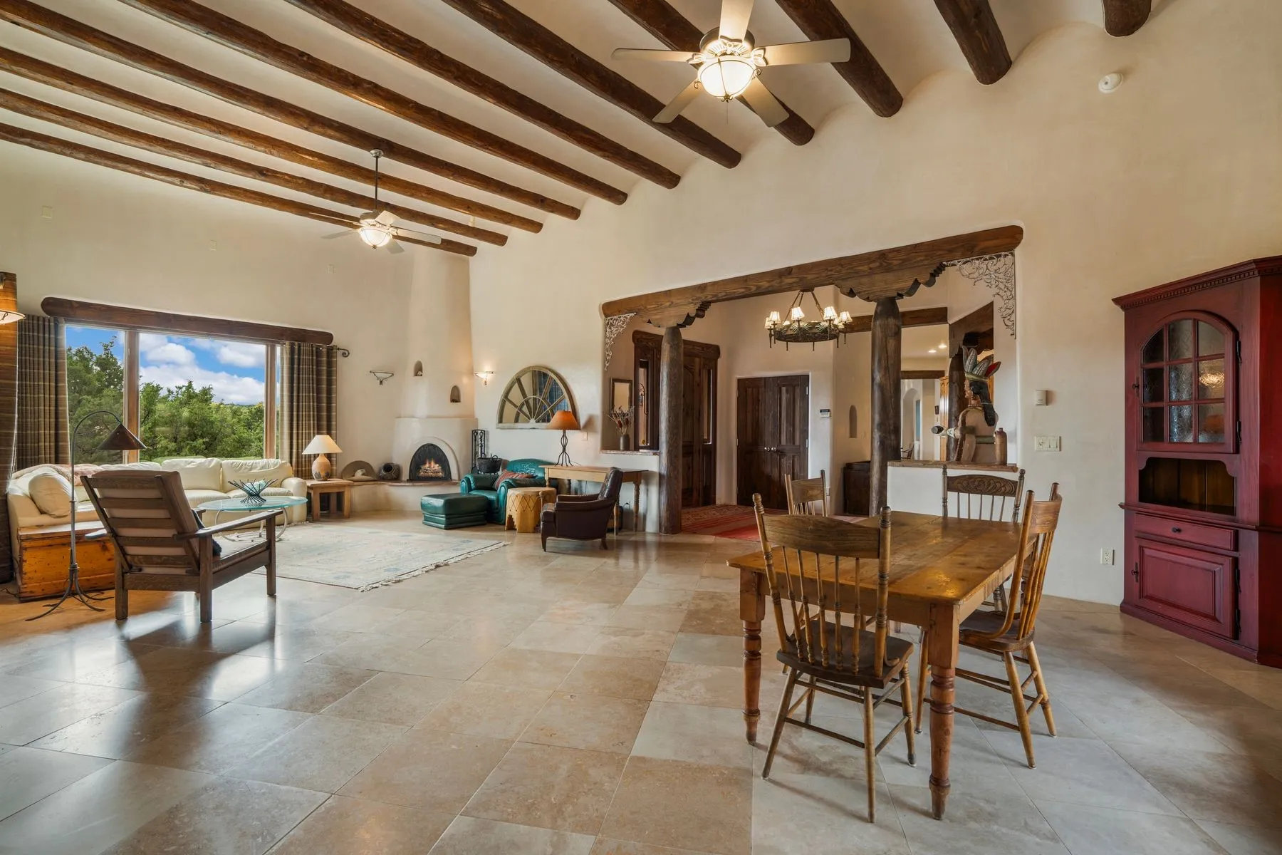 Experience classic Santa Fe style and modern livability in this 3,486 sq ft single-level (no steps!) Pueblo Revival home on 2.86 acres, built in 2005, and just 13 minutes from the Plaza. Designed for comfort and entertaining, the residence offers high ceilings and diamond plaster walls throughout, 3 spacious en-suite bedrooms and 5 bathrooms, including a luxurious primary suite with a generous flex space ideal for an office/gym, a large walk-in closet, and French doors leading to a portal. The ADA-compliant front entry to the house and primary bathroom shower provide accessibility without compromising style. The great room features soaring coved viga ceilings and opens through French doors to a covered rear portal with kiva fireplace, sunshade, and landscaped privacy wall — a perfect space for outdoor entertaining. The kitchen offers abundant wood cabinetry, extensive granite countertops, a large island with a second sink, and a built-in desk area. The kitchen extends to a bonus space with a kiva fireplace for dining and gathering. A spacious laundry room with sink and cabinetry opens to a side yard with an established herb garden. Throughout the home, authentic Southwestern details such as nichos, banco seating, travertine tile floors, skylights, corbels, and four wood-burning kiva fireplaces (including one outdoors) create timeless character. In-floor radiant heating, and evaporative cooling enhance everyday comfort. Additional highlights include a large 3-car heated garage with an RV bay and a versatile workshop or studio space, ample parking, central vacuum, and a rock fountain surrounded by a native plant garden and flagstone walkways. Full re-stucco on house and rear privacy wall in 2023. Partial (approx. ½) TPO roof replacement in 2023. With panoramic Sangre de Cristo mtn views, La Tierra’s extensive trail system just a short walk away, and no HOA, this property offers the perfect blend of privacy, natural beauty, and proximity to Santa Fe’s vibrant heart.