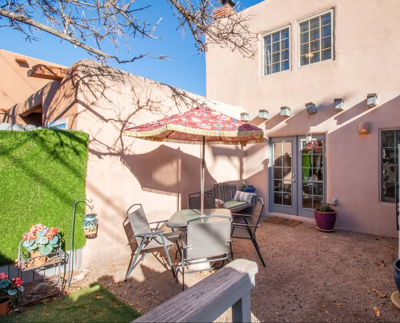 This upgraded home features classic Santa Fe style with Saltillo and Talavera tile, reclaimed oak wide-plank flooring, French doors, skylights, beams, and a kiva fireplace. The main level includes open living and dining areas that flow into a remodeled kitchen and a sunny south-facing courtyardāperfect for entertaining or relaxing. Upstairs, two bright bedrooms and a full bath offer comfortable private spaces. The attached unit on the first floor has its own private gated entrance, kitchen/living space, bedroom, flex room, and ¾ bath, making it ideal for guests, tenants, or a separate small business.