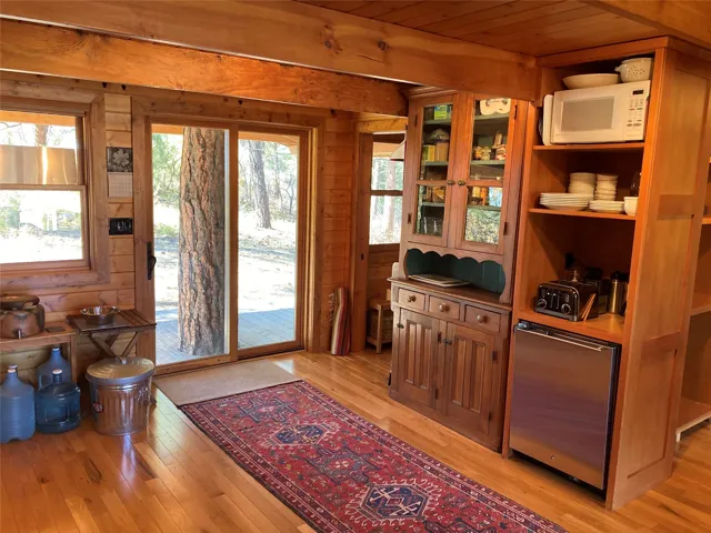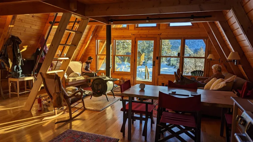 This charming A-Frame cabin offers the perfect mountain getaway with comfort, character, and privacy on 5.5 beautiful acres. The home features a private well, water cistern for additional storage, and a remodeled interior with a cozy, efficient layout. Inside, the open living space includes a wood-burning stove, an electric range, and several space-saving refrigerator units, blending rustic charm with practical modern touches.