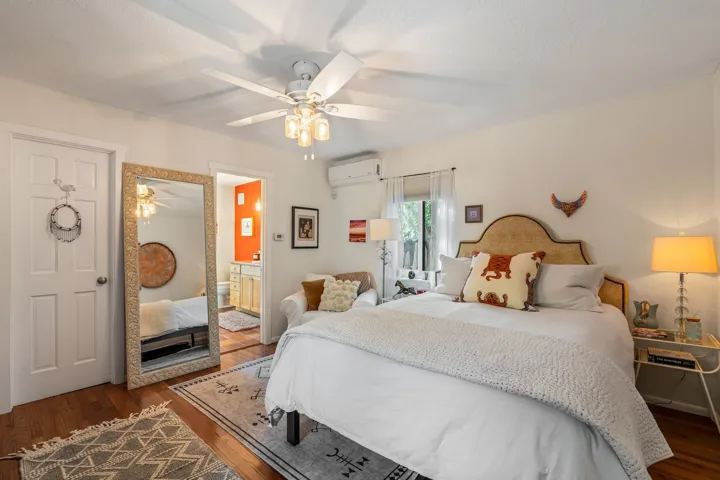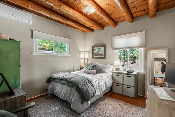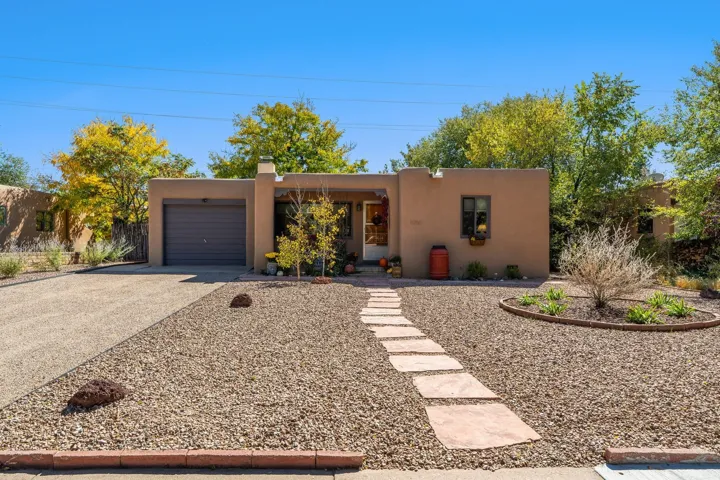 With much of its original design beautifully preserved, this Casa Alegre Stamm home radiates timeless Southwestern charm. Built in 1954, it showcases hallmark Stamm features – original hardwood floors, vigas, and handcrafted doors – while incorporating thoughtful modern updates for today’s comfort and convenience. The inviting floor plan includes two bedrooms plus a versatile third room ideal for an office, den, or guest space, along with two bathrooms, a warm welcoming living room, a dedicated dining area, and an updated kitchen with tasteful finishes. The spacious primary suite offers an ensuite bath and walk-in closet. An attached one-car garage provides added functionality and storage options. Outdoors, a large brick patio opens to a fully enclosed yard featuring lush grass, mature shade trees, fruit trees, and a colorful array of perennials – perfect for entertaining, gardening, or simply relaxing in your own private oasis. Nestled on a quiet street in the heart of Casa Alegre, this home enjoys one of Santa Fe’s most desirable and convenient locations. Residents can easily access Frenchy’s Field, the River Trail, Ashbaugh Park, and the Acequia Trail, while being just a short drive from shops, restaurants, and other local amenities. With its ideal blend of character, modern livability, and prime location, this turnkey Santa Fe classic offers comfort, style, and connection to all “The City Different” has to offer.
