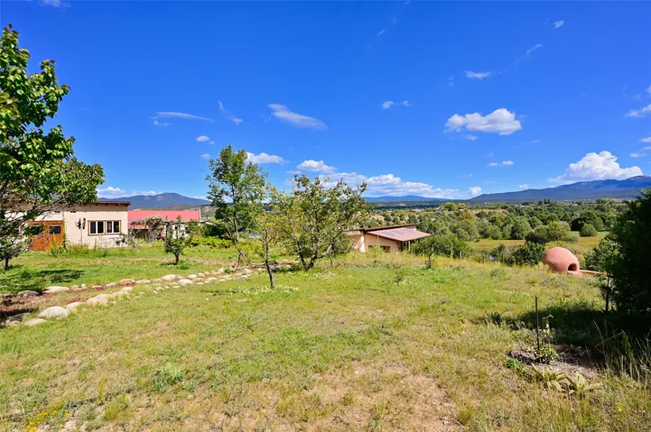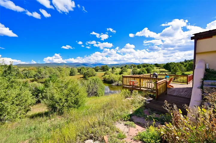 The total living space of 4,100 sq ft includes a charming 1,600 sq ft earth-bermed 2-bedroom home featuring custom stone floors, vigas, radiant in-floor heat in the kitchen and master suite, and an updated kitchen with a Wolf Stove and granite countertops. The home is designed for energy efficiency, maximizing solar gain, and has a wrap-around deck with captivating pond and mountain views.