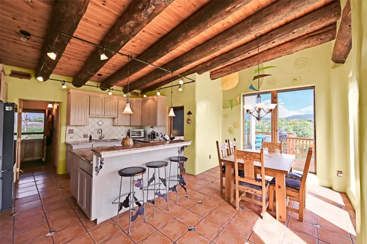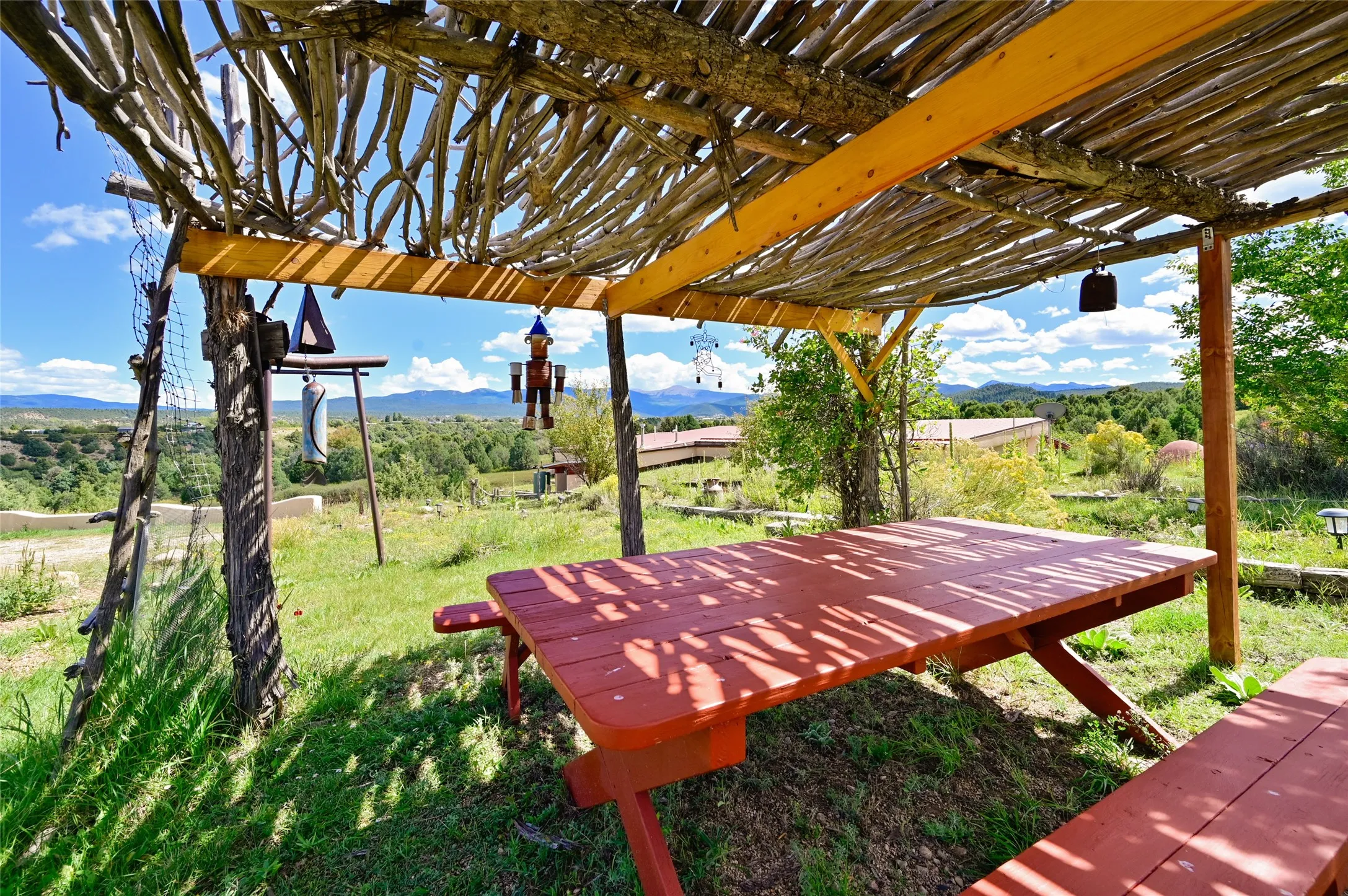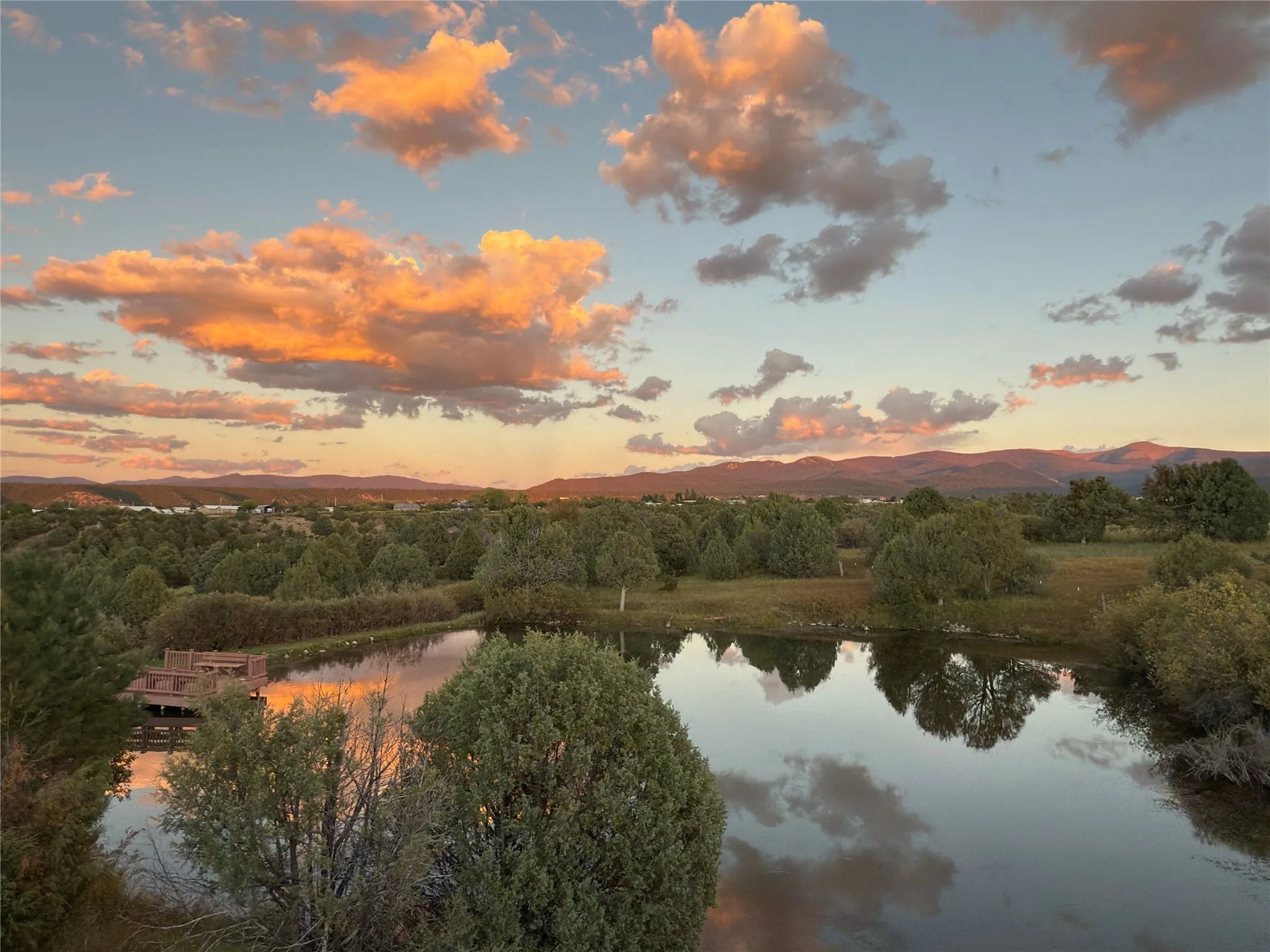 The total living space of 4,100 sq ft includes a charming 1,600 sq ft earth-bermed 2-bedroom home featuring custom stone floors, vigas, radiant in-floor heat in the kitchen and master suite, and an updated kitchen with a Wolf Stove and granite countertops. The home is designed for energy efficiency, maximizing solar gain, and has a wrap-around deck with captivating pond and mountain views.
