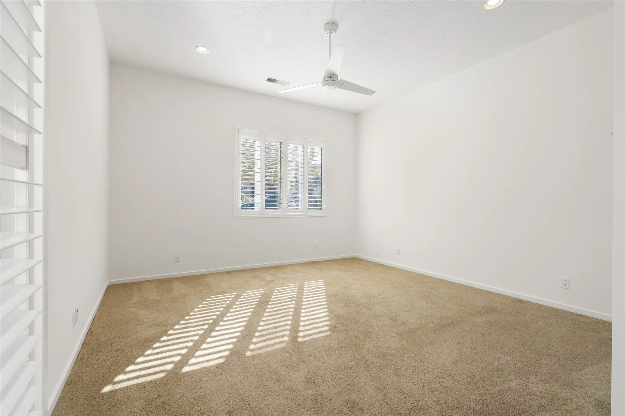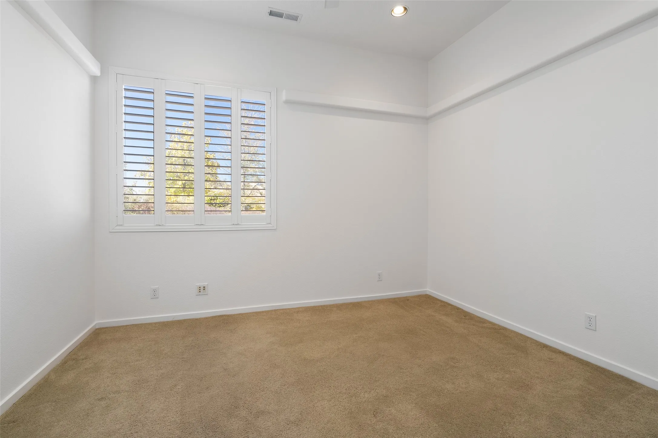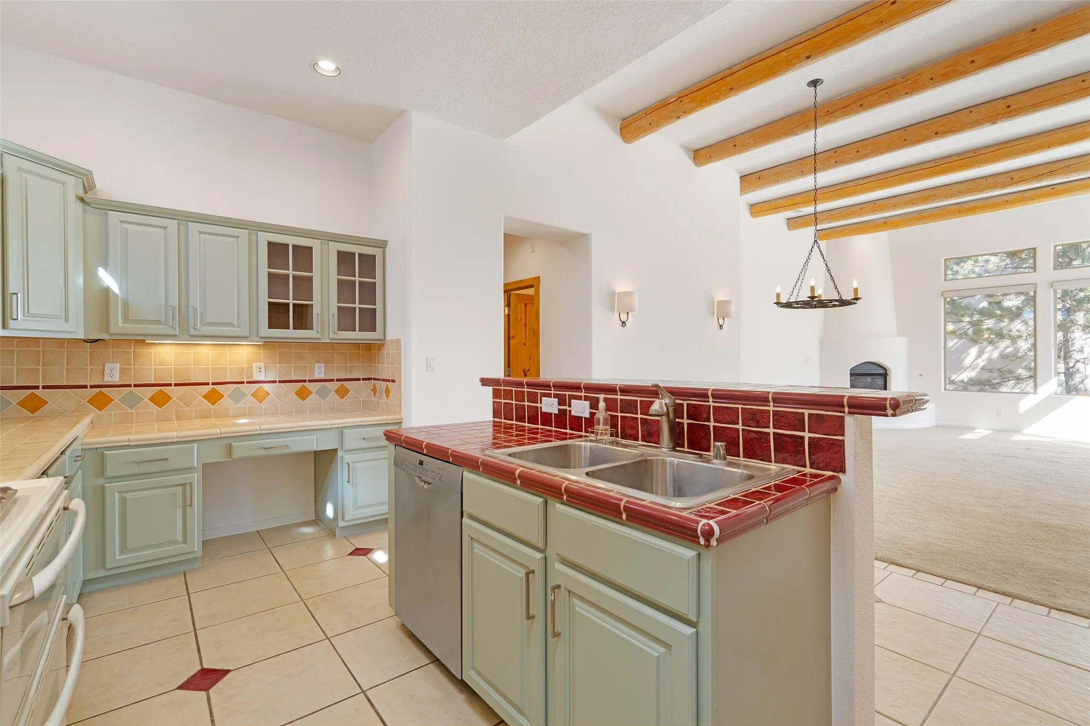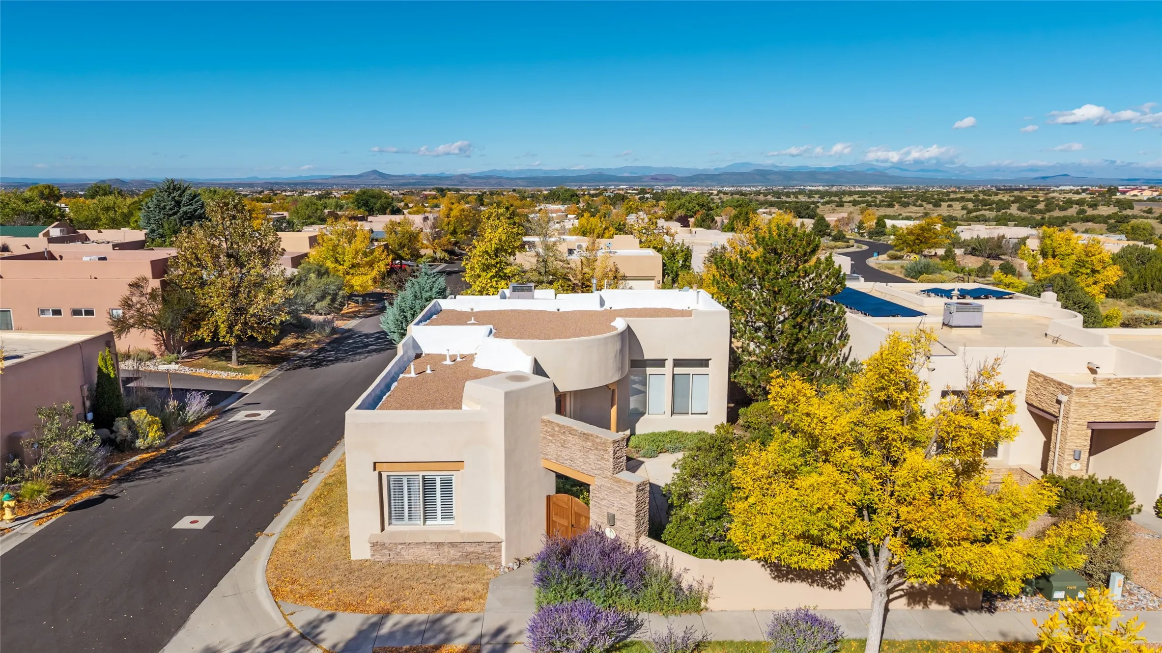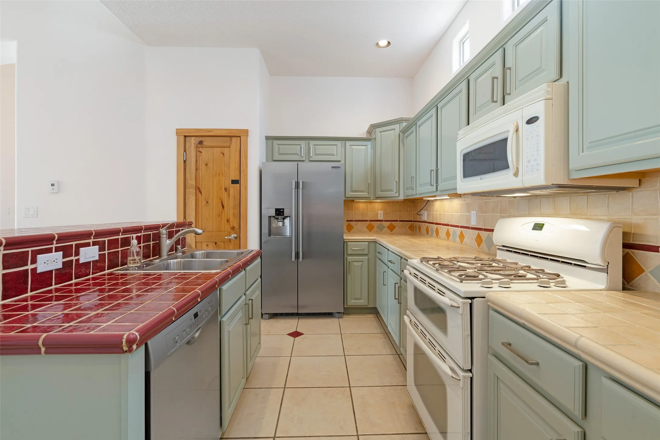 Delightful Rancho Viejo, former “Portal” model home. Beautiful courtyard entrance with mature landscaping. The entire interior has recently been professionally re-painted. Spacious living area with high ceilings and vigas and a gas fired kiva fireplace. Sensible split floorplan featuring 2 bedrooms plus an office with built-in shelving and a built-in desk area. Custom wood doors throughout. Primary bedroom and second bedroom have shutter blinds. Two car garage is finished and has plenty of storage cabinets. Stainless refrigerator and dishwasher replaced in the last 5 years. Roof redone in the last 5 years. Water heater and tankless replaced in 2019. Walled in back area too with nice trees! Rancho Viejo is a master planned community with 11,000 acres; 50% featuring natural open spaces. This home is close to walking trails, parks, the SF Community College, Target, Santa Fe Place Mall, many restaurants and grocery stores. This home is move-in ready!