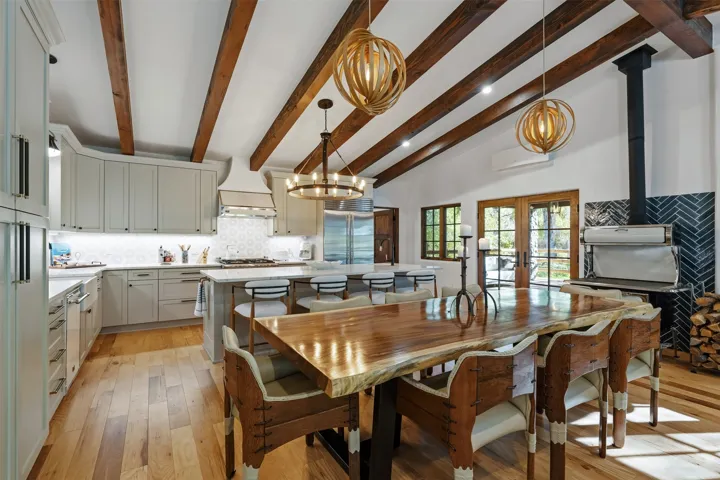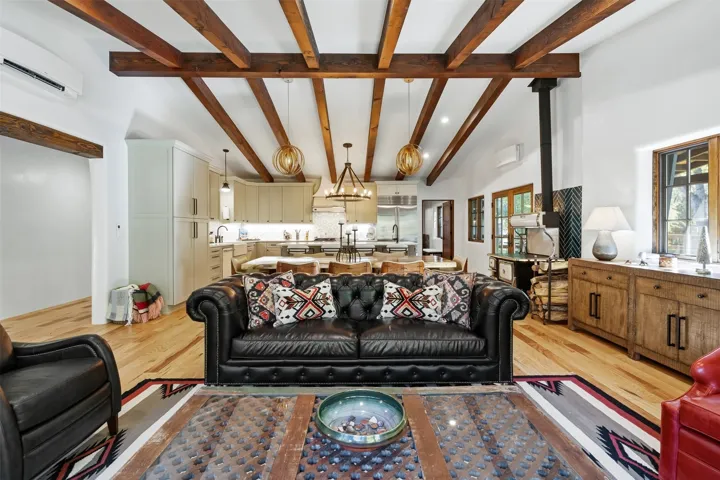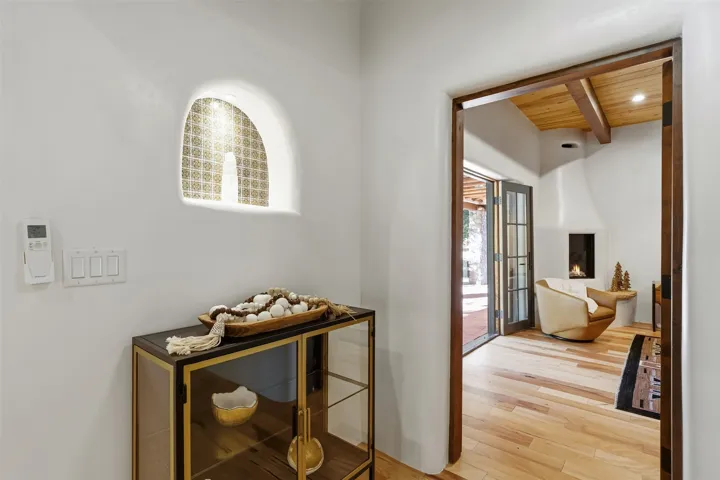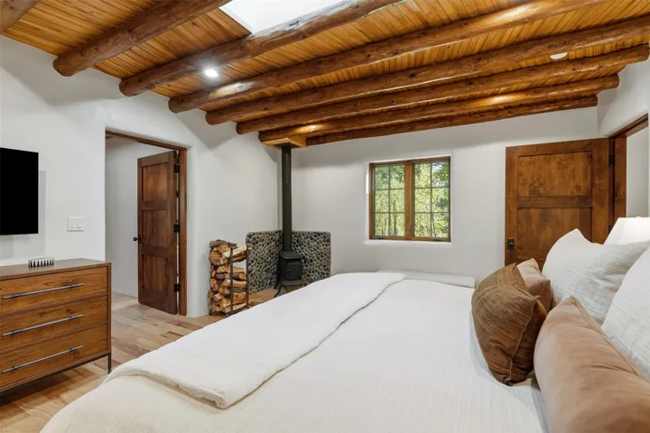 Step outside to discover covered outdoor living spaces, complete with a hot tub, ideal for entertaining or unwinding amidst nature. The property is adorned with charming features such as an antique wood stove, gas kiva fireplaces, and a potbelly stove, enhancing its rustic elegance. Recent upgrades include new stucco, a new roof, and new windows, ensuring modern comfort and efficiency.