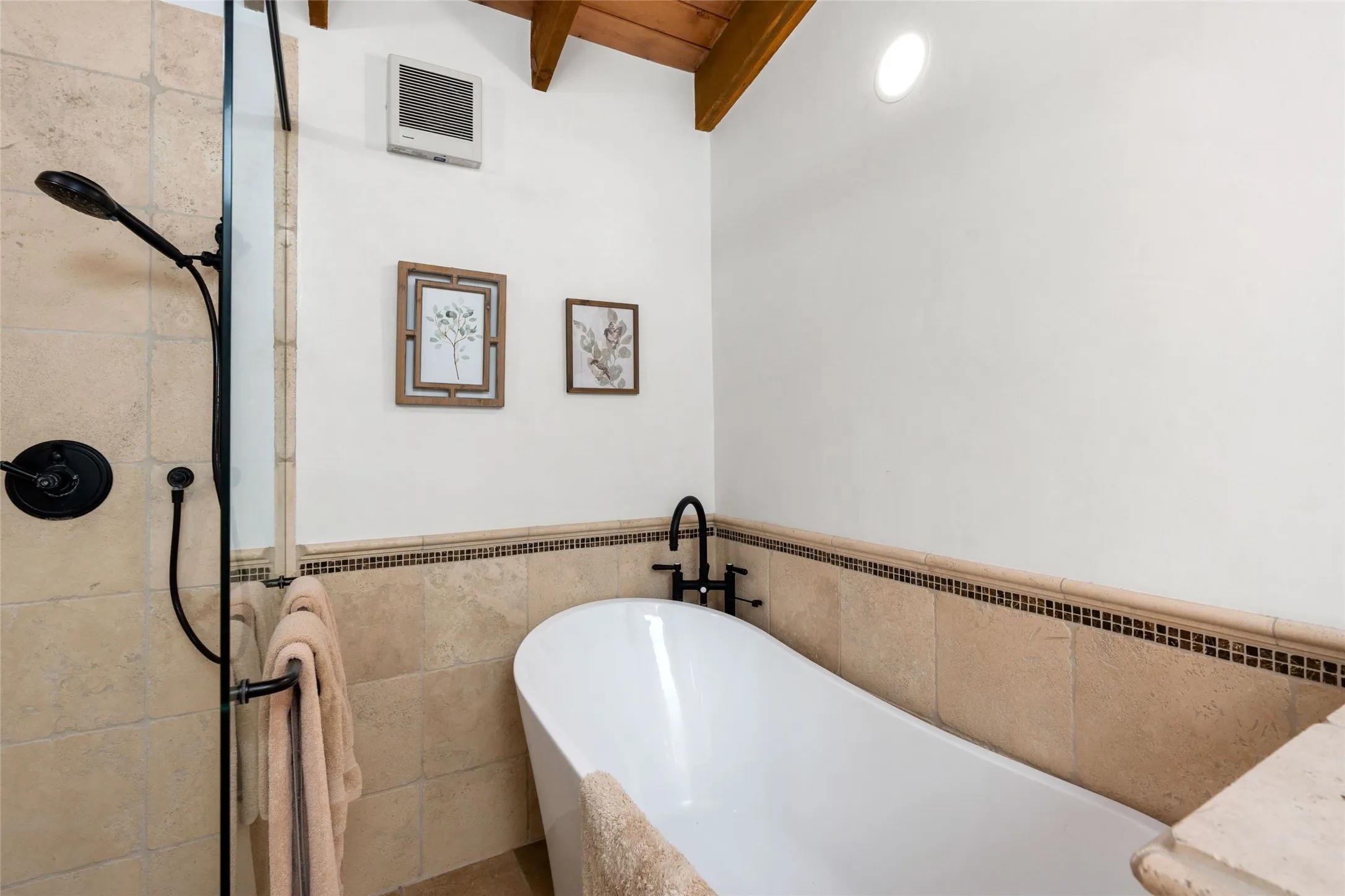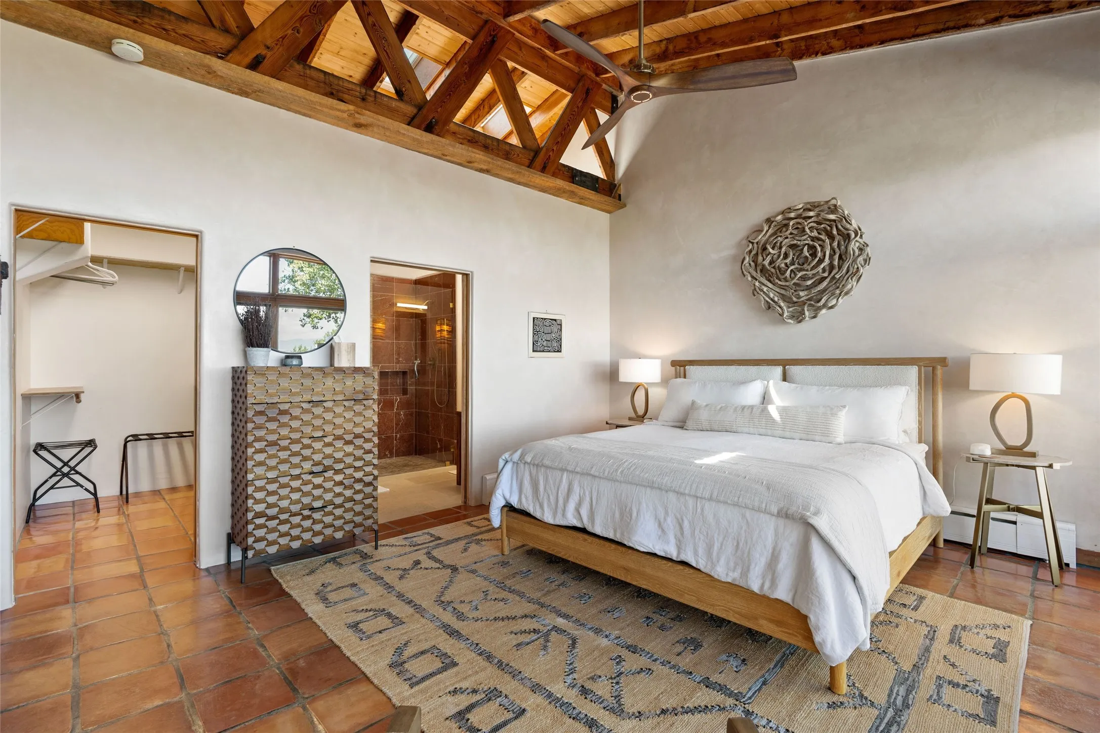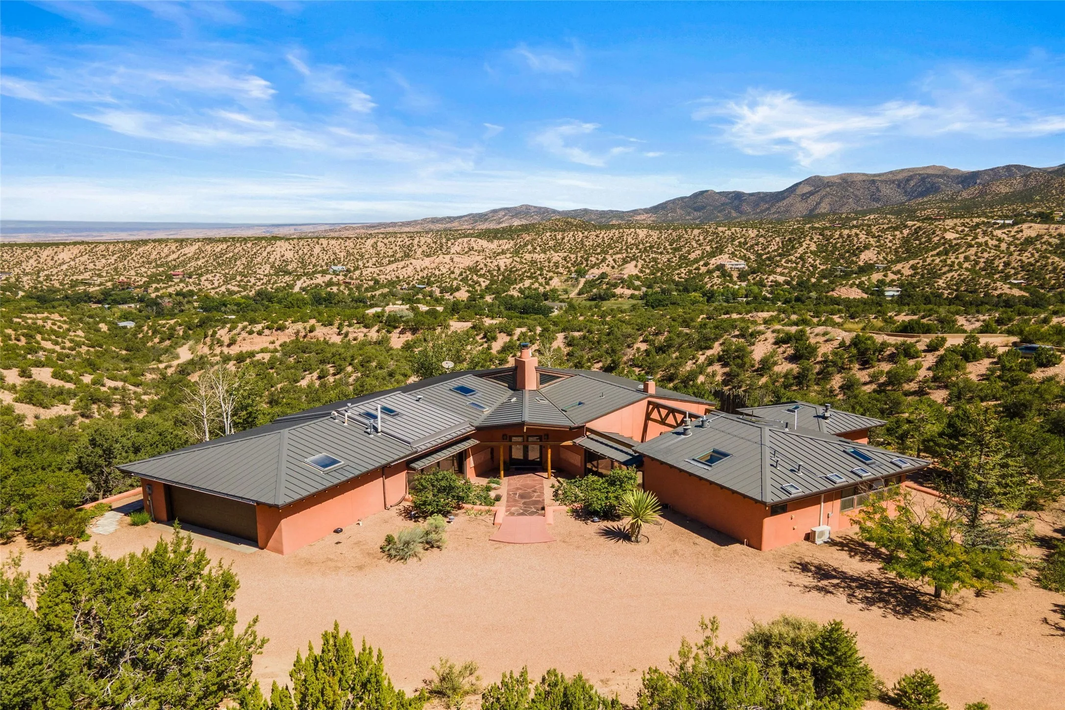 Stunning 3-bedroom, 3.5-bath home in Vista Redonda professionally sited on 5 ridge-top acres of piƱon trees and breathtaking views of the Sangre de Cristo and Jemez Mountains. Constructed by renowned builder Dennis Sayer, this residence showcases exceptional workmanship and reflective design. The pitched roof and soaring beamed ceilings create an airy, inviting atmosphere, while the hard plaster walls and polished Saltillo tiles add timeless elegance. Ā Upon entering, you’ll find a spacious great room that flows into a dining area and a well-appointed eat-in kitchen. The office, complete with built-in desk and bookcases, provides a quiet retreat, while the kiva fireplace adds warmth and character to the space. Ā The home features two en-suite bedrooms in each wing, ensuring privacy and comfort for guests.. In addition, there is a detached 196 sq. ft. studio/casita. Multiple outdoor areas invite you to enjoy al fresco dining and entertaining, including a delightful sunrise breakfast patio where you can soak in the morning sun with a cup of coffee. Ā Natural light floods the home through plentiful skylights, windows, and glass doors, begetting a bright and welcoming environment. Additional highlights include a heated 2-car garage and newer boiler and water heaters. Just south of Vista Redonda is the Village of Tesuque, its neighborhood gathering spot Tesuque Village Market and the contemporary restaurant and bar, El Nido. Easy access to The Santa Fe Opera and downtown Santa Fe.