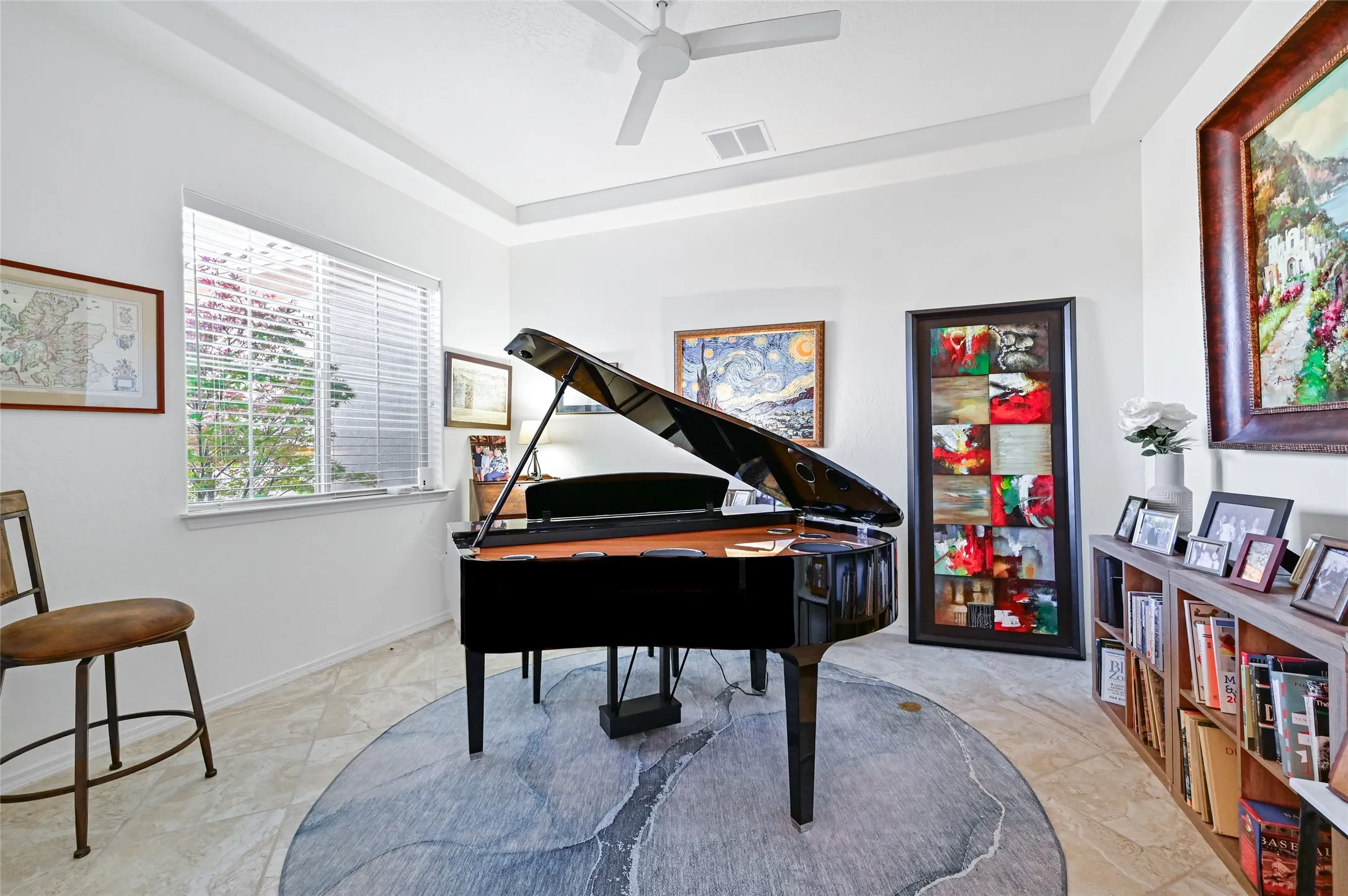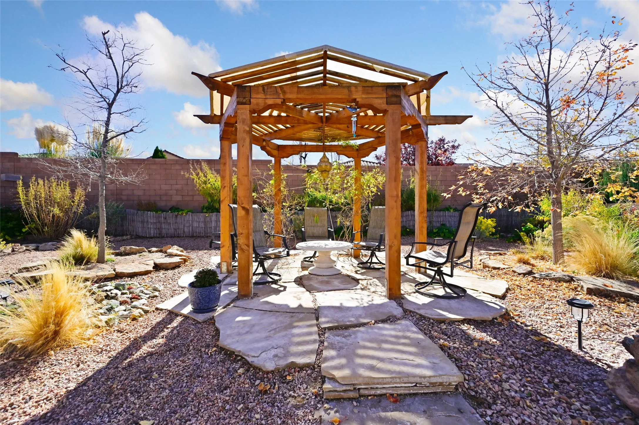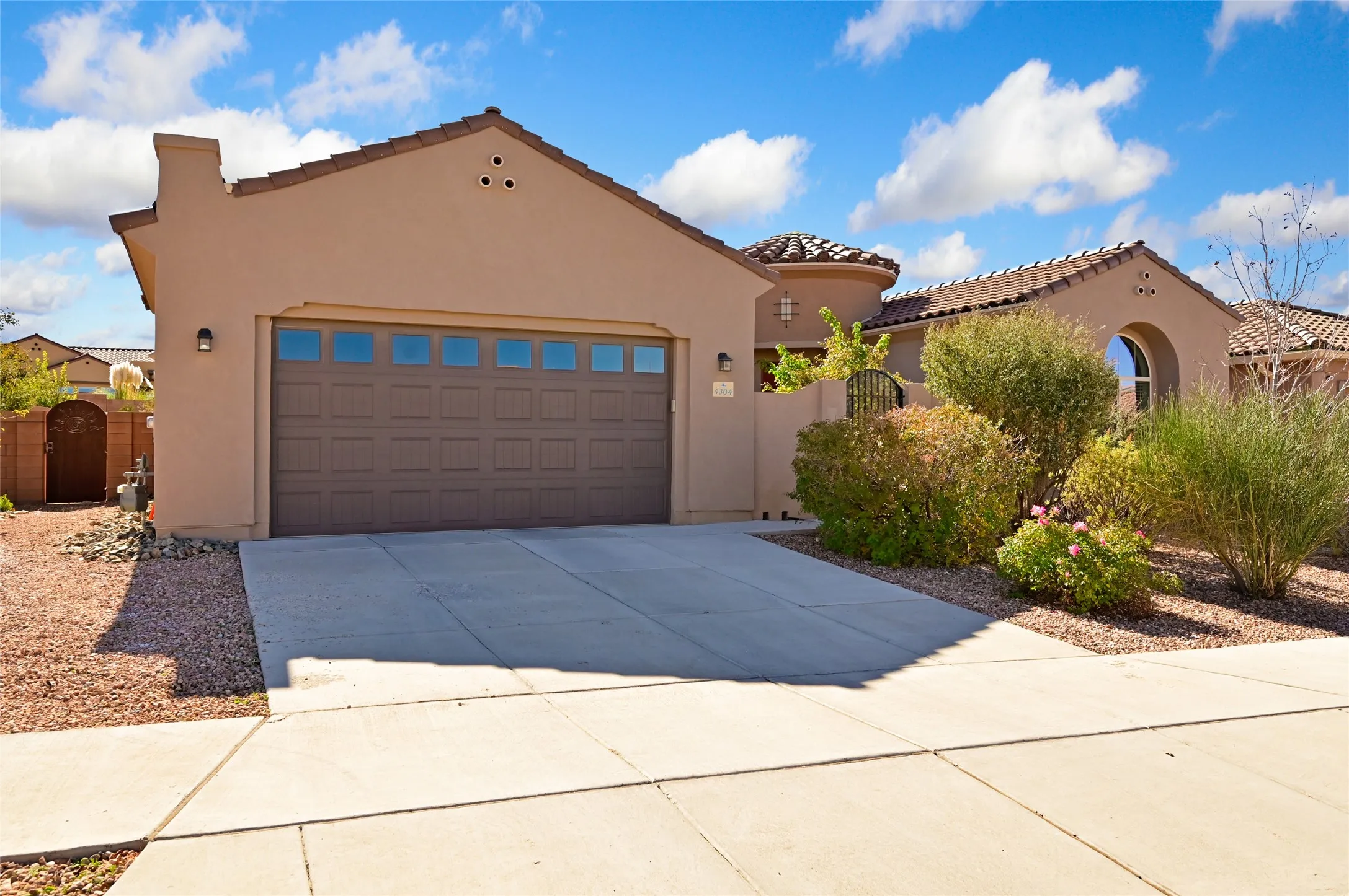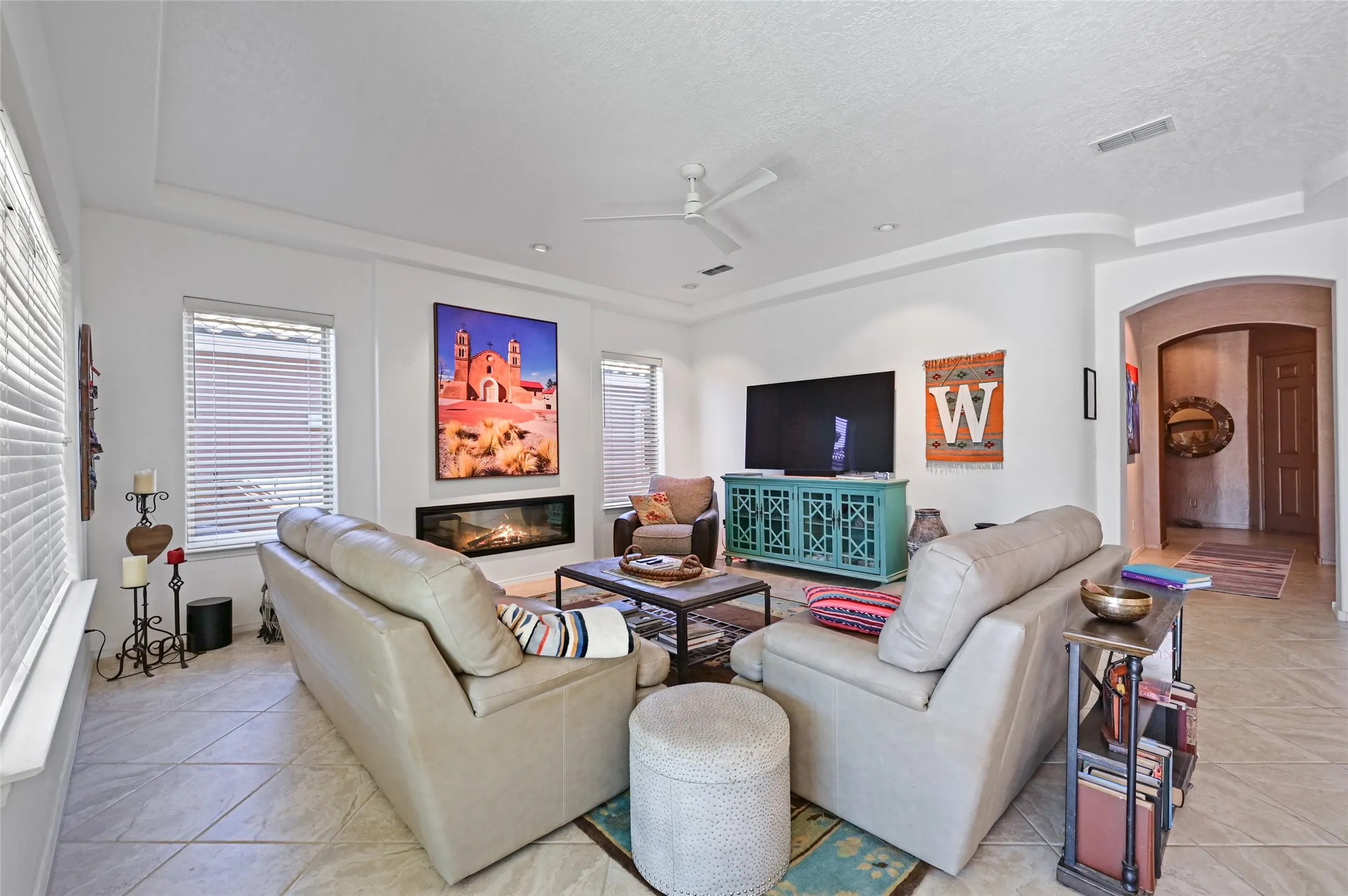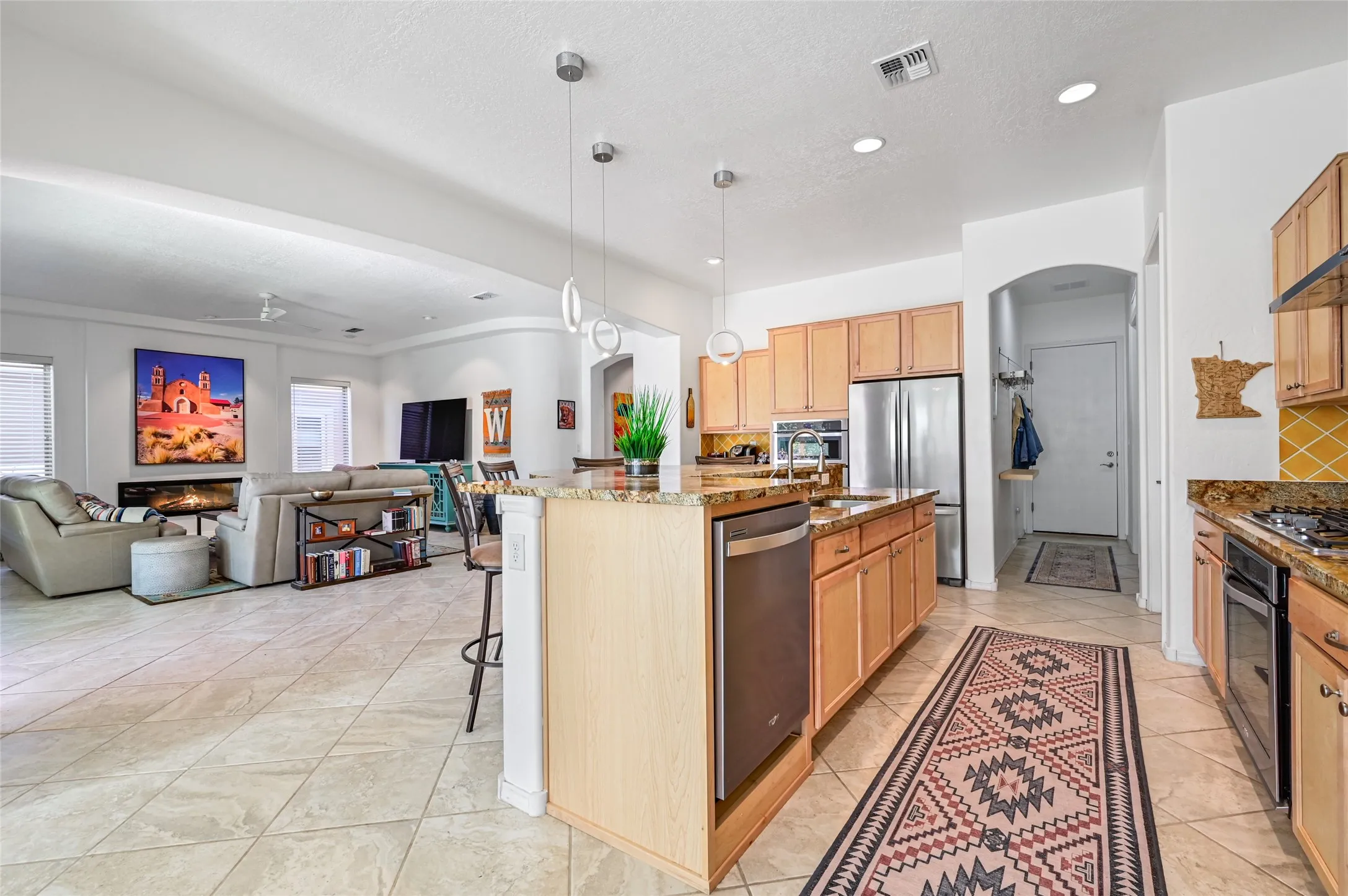 Step Inside Your Dream Home! Welcome to this beautifully designed, single-level retreat featuring 3 spacious bedrooms, a den/office and 2 full bathrooms. Thoughful design with the comfort of refrigerated air conditioning and the stunning scale provided by 10-ft ceilings and 8-ft doors throughout. An open-concept floor plan flows effortlessly from the living room to the kitchen and dining areas. Fall in love with the gourmet kitchen, a true chef’s haven! It’s equipped with a gas cooktop, two electric ovens, and a brilliantly designed 42-inch island that even features a convenient, elevated dishwasher. A consistent flow of porcelain tile flooring ties the entire home together, offering both beauty and easy upkeep. A Retreat for Everyone. You’ll find the tranquil primary bedroom suite on one end of the home, while the comfortable guest wing is tucked away on the other. A serene enclosed sunroom, complete with windows and screening, features a built-in barbecue grill! An ideal place to unwind while enjoying views of the walled yard. The same luxurious granite countertops you see inside right into the outdoor kitchen area for a sophisticated, continuous look. Outdoor Oasis and Community Perks. The backyard features a custom pergolaāthe perfect spot to enjoy the beautiful Southwest Garden. And the community adds value with a great jogging path just steps away! This home truly brings together style, comfort, and functionality.