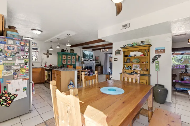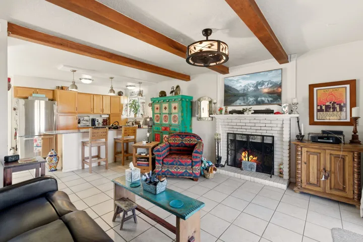 Inside, you’ll find an open floor plan with tile flooring, a wood-burning fireplace, and ample natural light. The kitchen features generous cabinetry and flows into a spacious dining area, perfect for entertaining. The primary suite includes an en suite bath, while two additional bedrooms offer flexibility for guests or home office use.