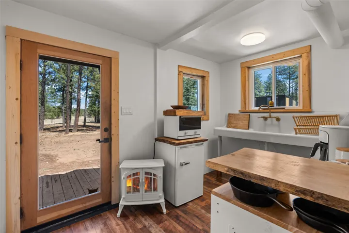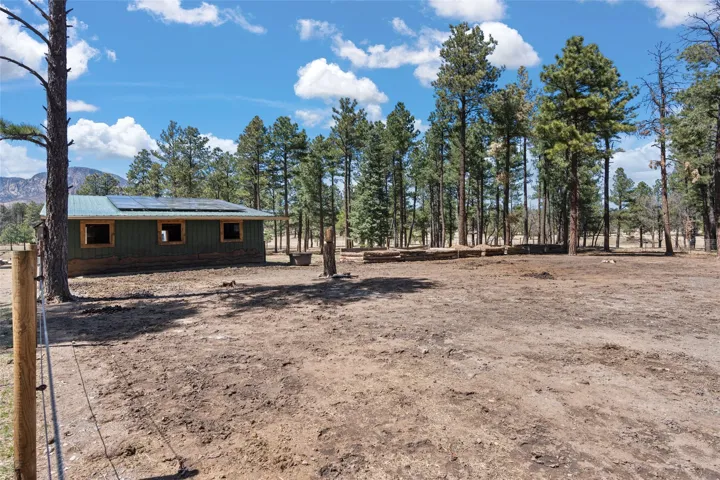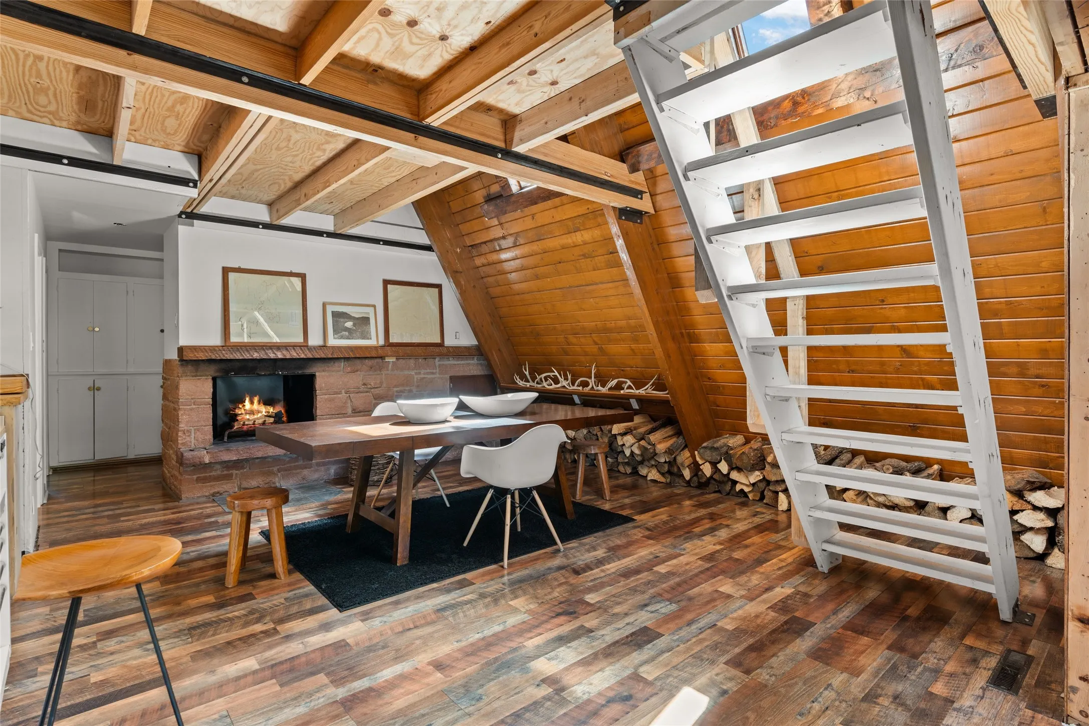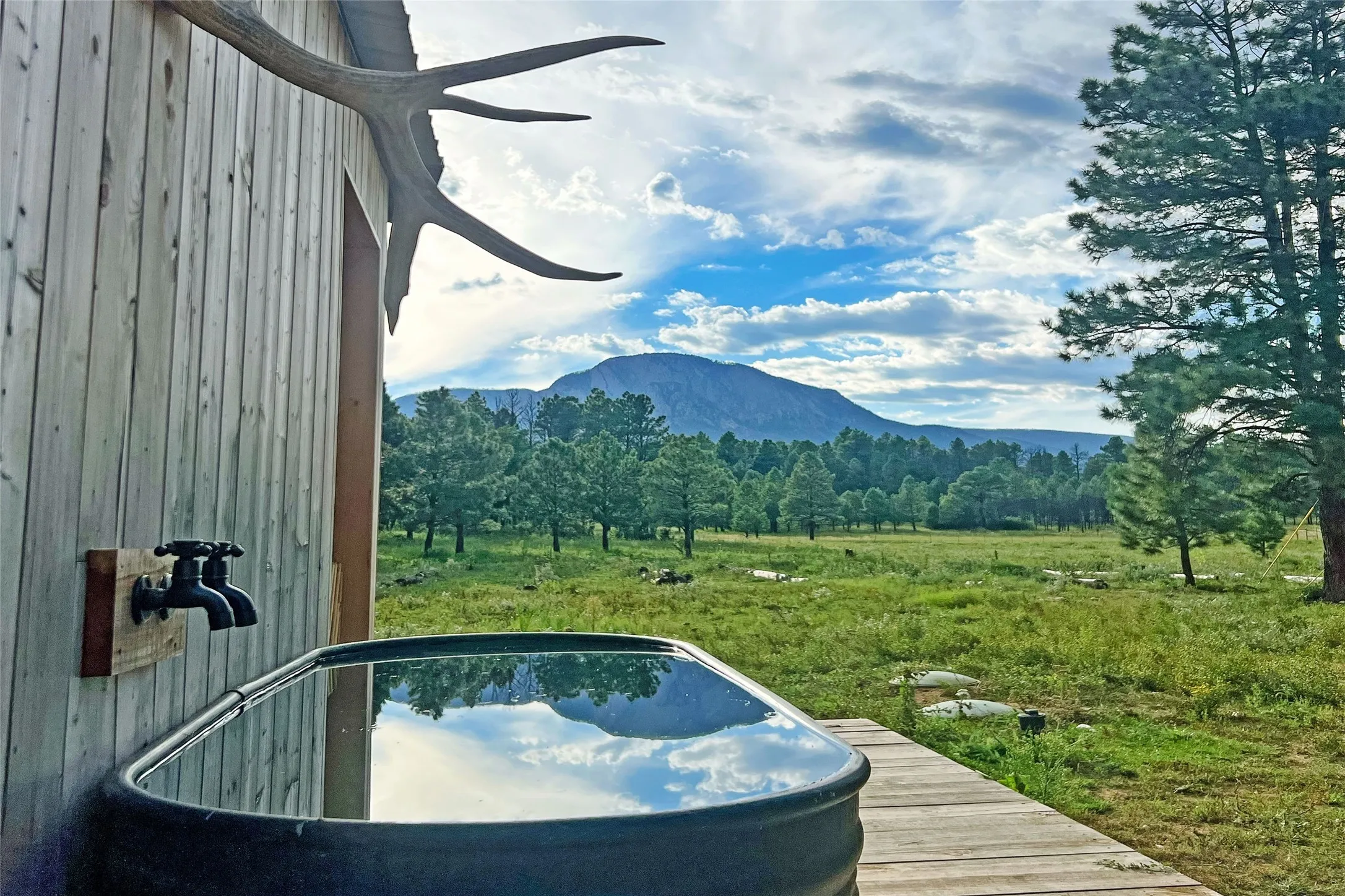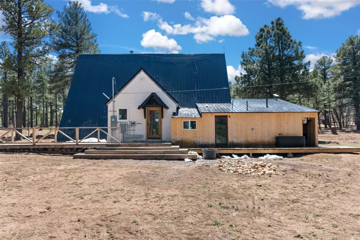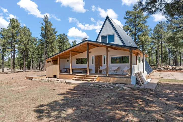 Behind a gated entrance, this 11.86-acre mountain retreat near Las Vegas, NM, and Storrie Lake offers privacy, sustainability, and stunning views of Hermits Peak. Originally a faminly hunting compound, the beautifully remodeled A-fram home features 3 bedrooms, 1.5 baths, an open-concept living area with a pellet stove, and a kitchen with movable workbench-style counters and an induction cooktop.