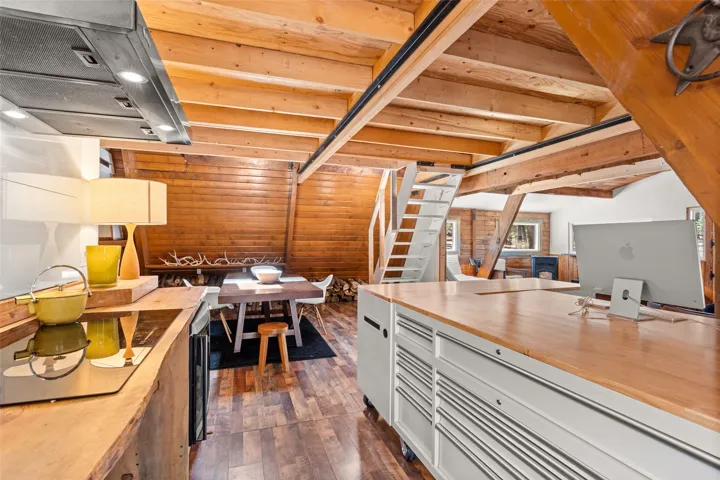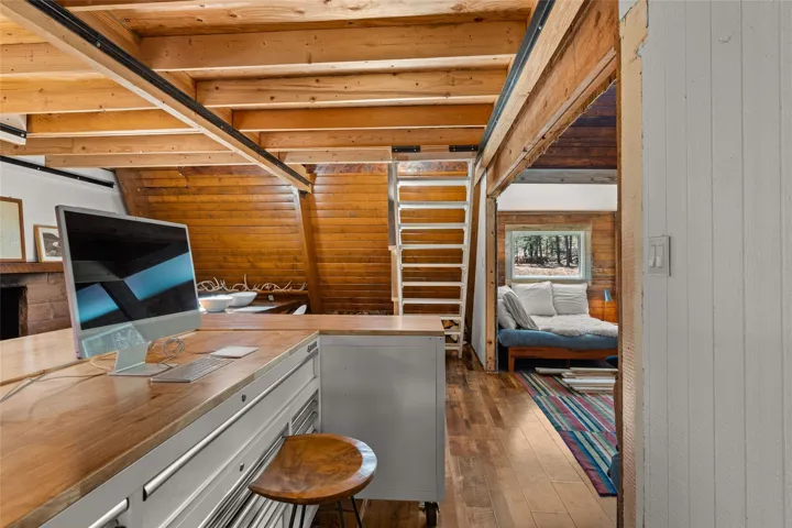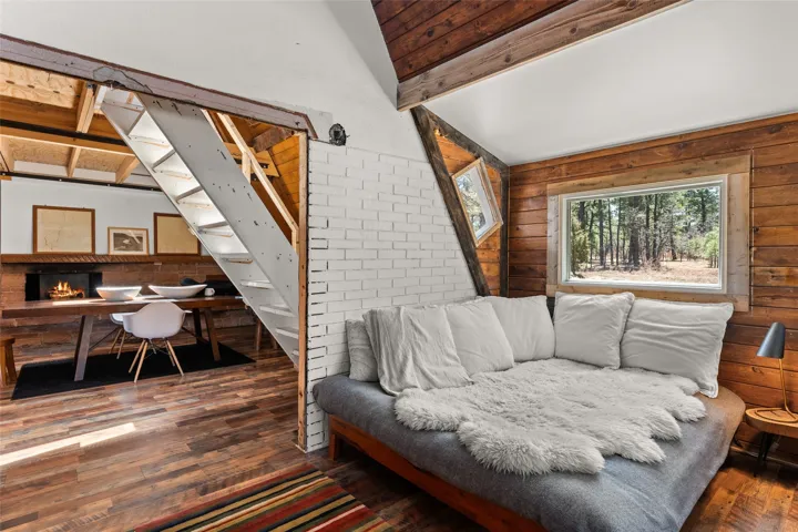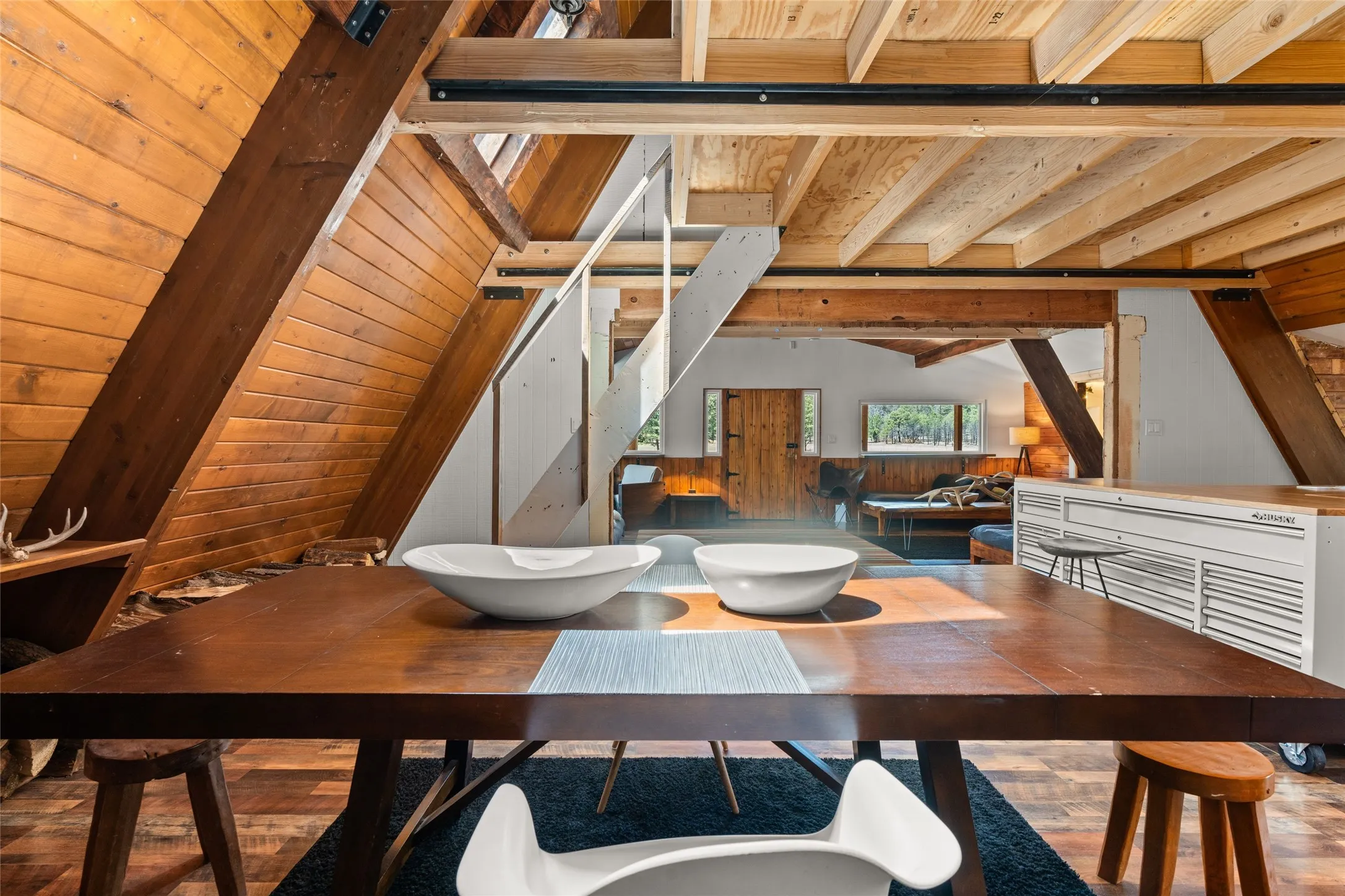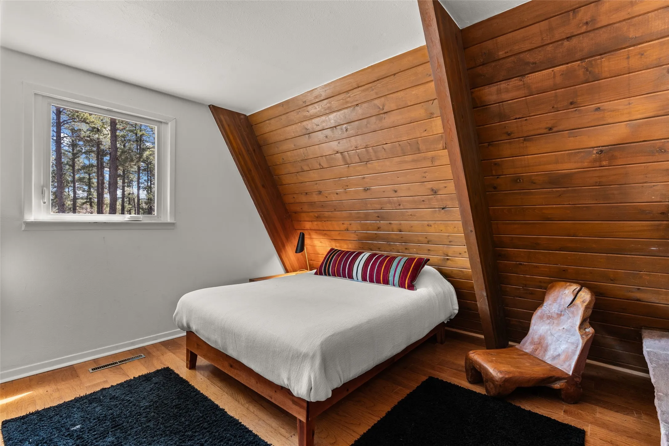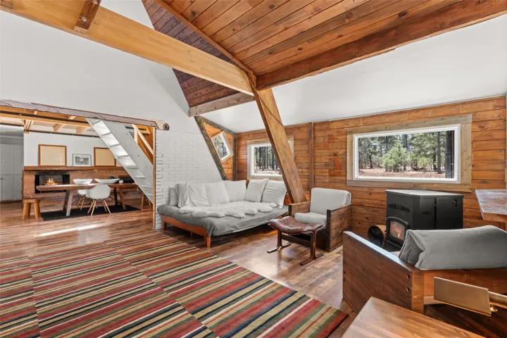 Behind a gated entrance, this 11.86-acre mountain retreat near Las Vegas, NM, and Storrie Lake offers privacy, sustainability, and stunning views of Hermits Peak. Originally a faminly hunting compound, the beautifully remodeled A-fram home features 3 bedrooms, 1.5 baths, an open-concept living area with a pellet stove, and a kitchen with movable workbench-style counters and an induction cooktop.