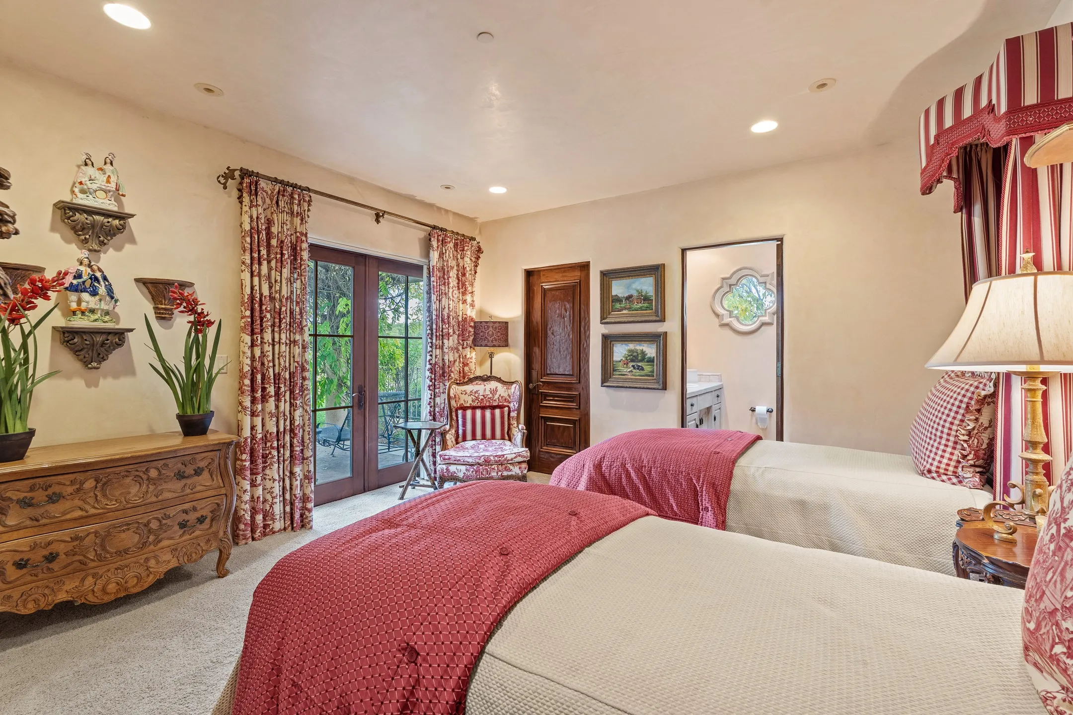 The east wing hosts the elegant primary suite with its own fireplace, private portal, and in-ground spa with a waterfall. The spa-like bath offers dual vanities, a soaking tub, and a large walk-in shower, while the custom closet provides both beauty and functionality. On the west side of the home, you will find 2 guest suites providing separation and privacy.
