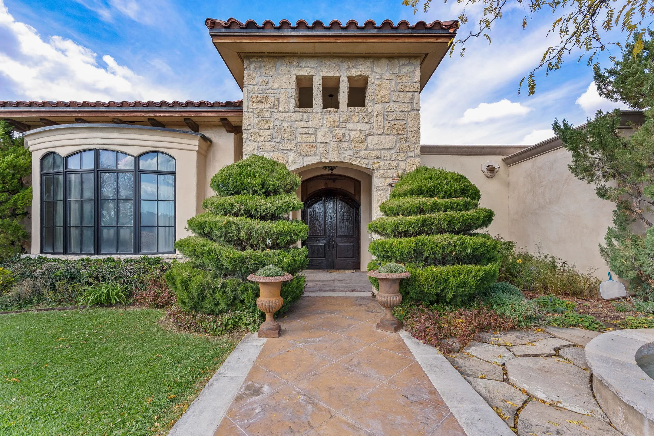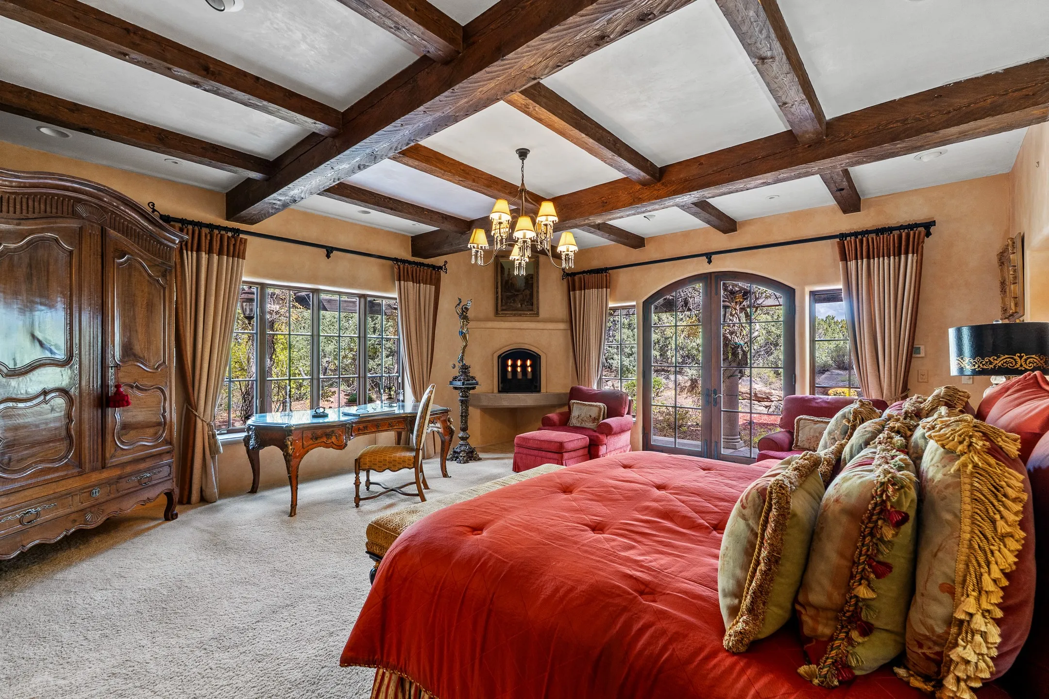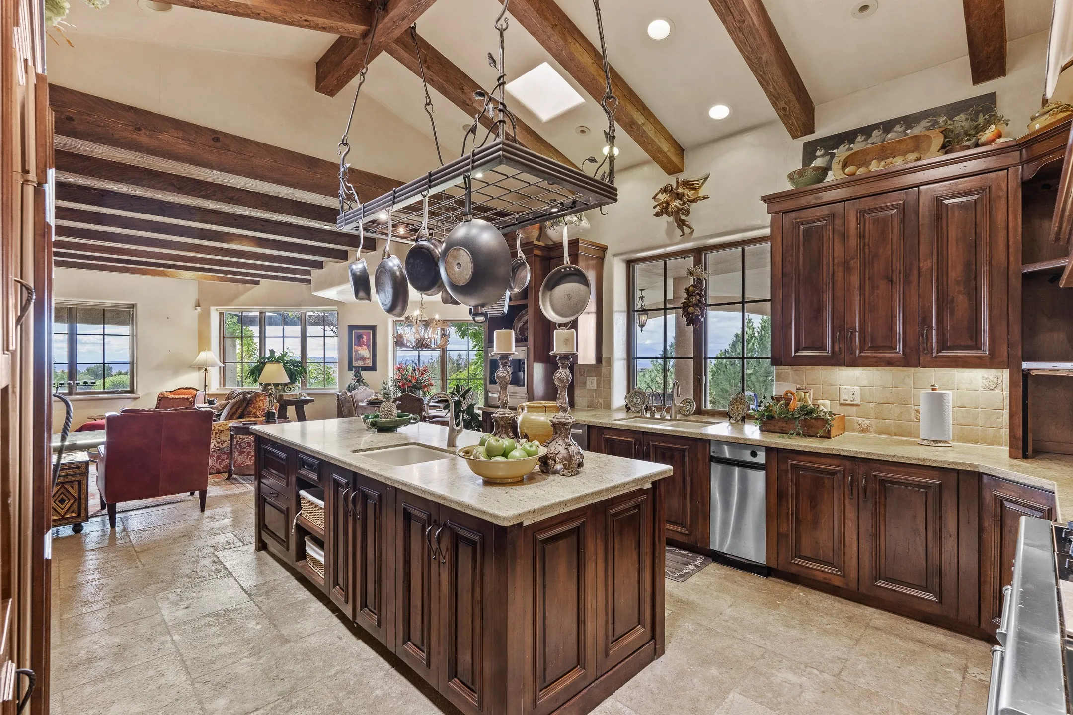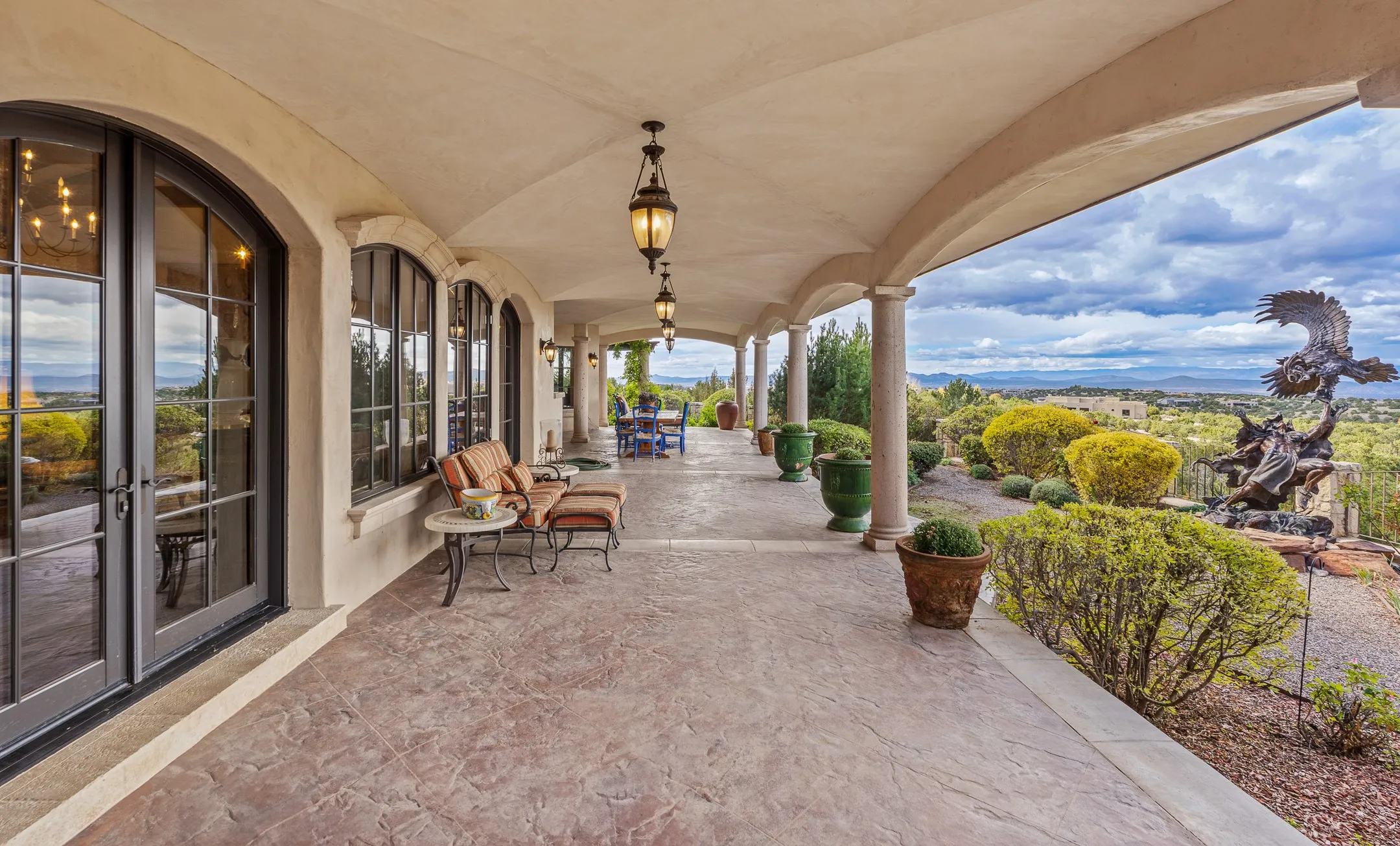 For those drawn to the romance of Italy, this extraordinary residence captures the essence of a Tuscan villa translated beautifully into the high desert landscape of Santa Fe. Nestled on 2.5 acres in the coveted Sundance Estates, this home with 4 bedrooms plus an office, 4.5 baths, and a 3-car garage offers 5,013 square feet of refined living, crafted with exquisite detail and timeless materials. Beyond stately wrought-iron gates, cupid sculptures and a stamped and colored concrete drive lead to a grand arrival with limestone walls, a graceful fountain, and hand-hewn double doors. Inside, rich walnut and travertine floors create a harmonious blend of warmth and sophistication. Diamond plaster walls, coved plaster ceilings, and rustic wood trestle beams evoke the artistry of old-world Europe, while expansive windows and French doors frame breathtaking mountain and sunset vistas. The chefās kitchen is a showpieceāadorned with alder cabinetry, granite countertops, a Wolf range, a Subzero refrigerator, a built-in Miele coffee center, and a wine cooler. Here you’ll be romanced by a generous island, casual dining area, and adjoining family room with a fireplace, creating an inviting central gathering space. The kitchen and living room open to a deep covered portal designed for alfresco entertaining, featuring an outdoor kitchen, limestone fireplace, and rose garden.