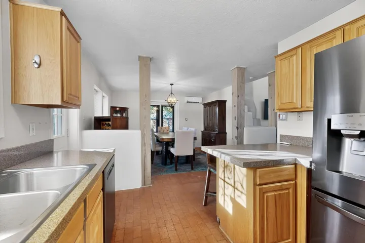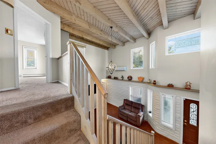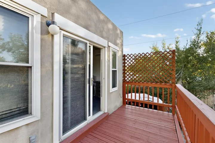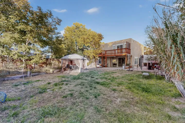 Excellent location with easy access to Old Town, the Bosque Trail, and other Rio Grande/Downtown attractions. No HOA! Charming Southwestern-style adobe & frame home w/ high wood-beam ceilings, clerestory windows, refrigerated air and kiva fireplace. Two bedrooms on the main level plus a large owner’s suite with balcony and office/possible 4th bedroom upstairs. Brick floors w/ radiant heat, granite countertops and stainless appliances. Carpet to be replaced after move out, or credit to be used toward other flooring of buyer’s choice. Whole house water treatment system. Sunny kitchen opens to dining and patio. Finished, heated/cooled garage. Large fenced ¼-acre yardāminutes to dining, shopping, El Vado, and the Bio Park / Botanical Gardens. Fantastic Short Term Rental possibility!