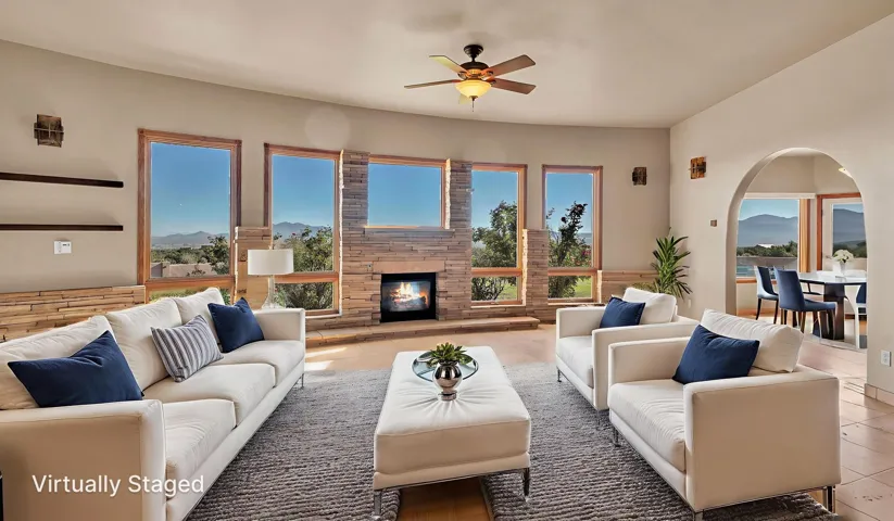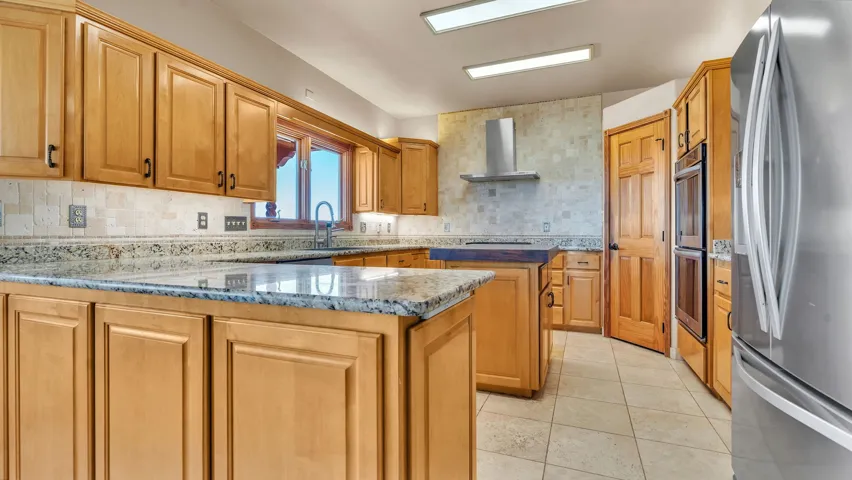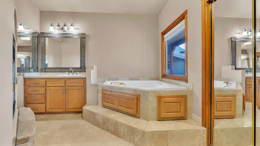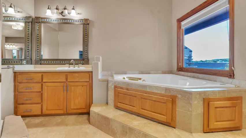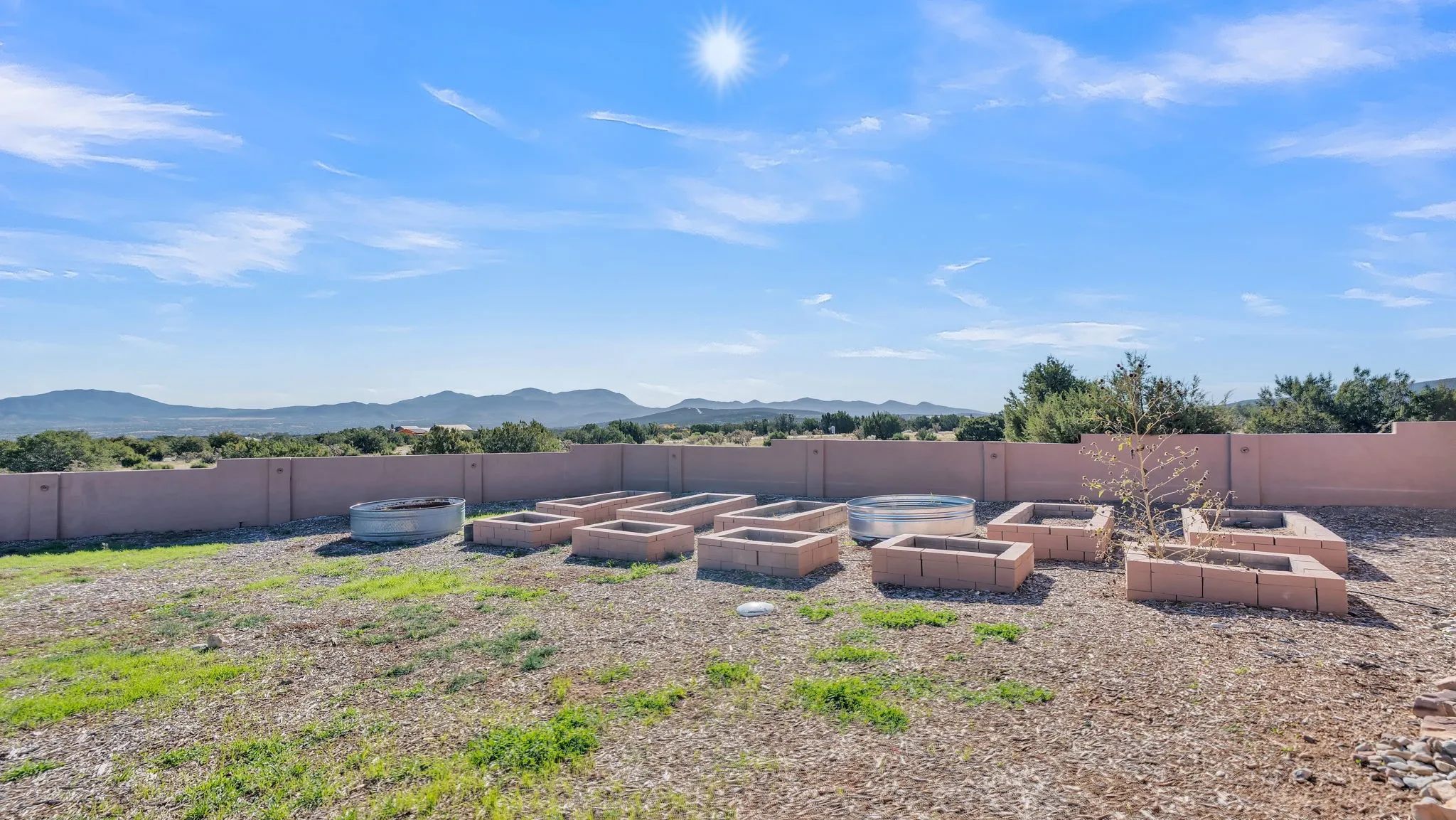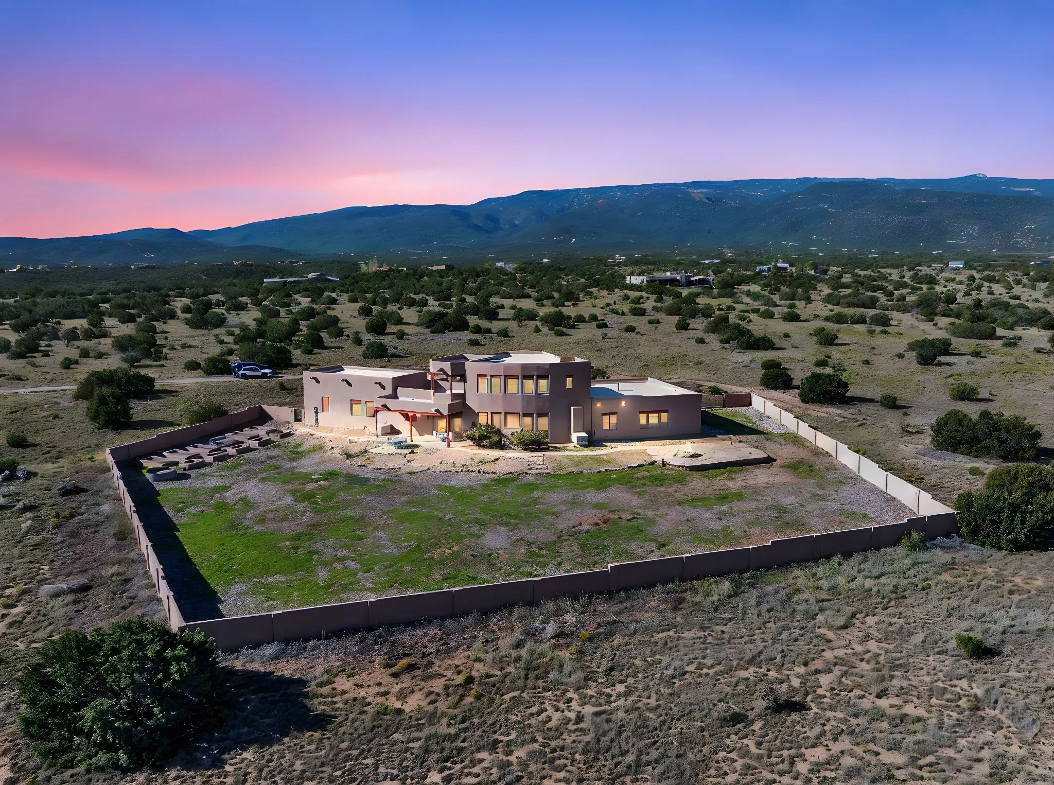 Welcome to 5 La Aguapa, Sandia Park, NM Experience luxury rural living in San Pedro Creek Estates! This custom 4,000+ sq ft home on 10.57 acres offers breathtaking views of five mountain ranges. Featuring 4 bedrooms, 4 baths, and two primary suites, this home combines comfort and elegance. The great room with soaring ceilings, a gas log fireplace, and panoramic views. The gourmet kitchen includes granite countertops, a built-in gas stove, pantry, and access to a workshop and three-car garage. Enjoy radiant heat, travertine tile flooring, a large utility room, and a walled backyard with access to Golden Open Space Los Duendes Trail. This is luxury rural living within reach.