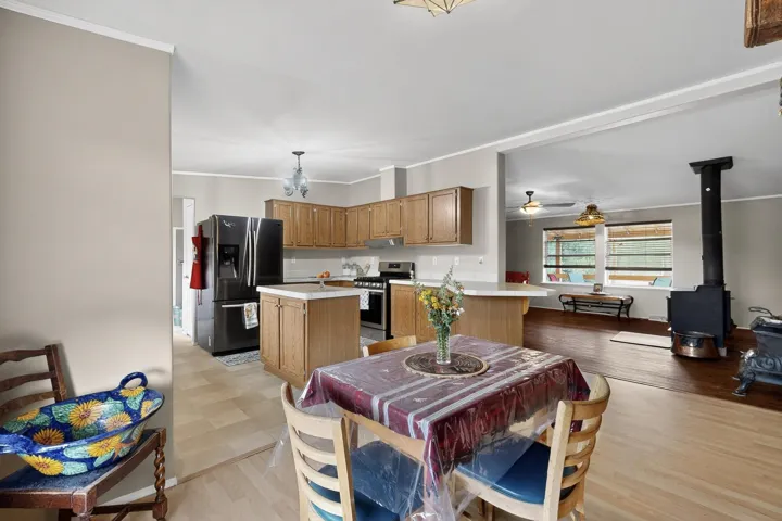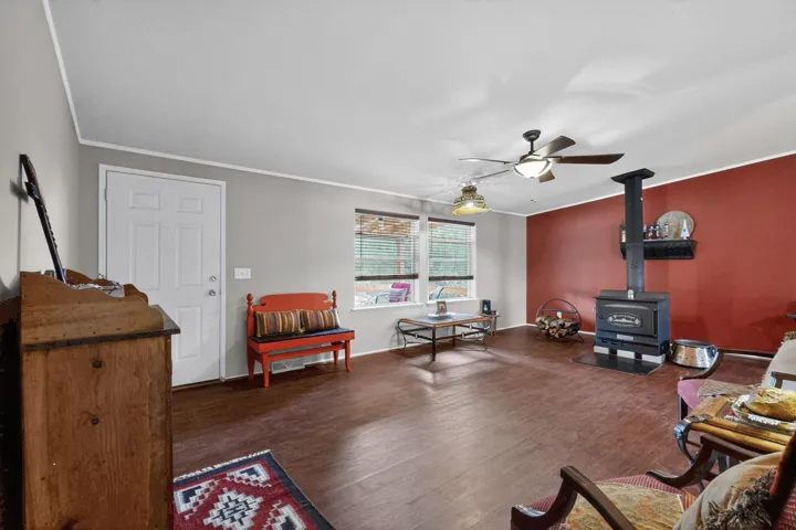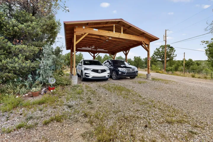 11 Corte Vargas has a 2007 3 bedroom, 2 full bath doublewide manufactured home on a permanent foundation sited on 1.026 +/- acres located in the Glorieta area, 22 minutes to Santa Fe. The home is accessed from a covered porch, has living room with wood burning stove, cook’s kitchen, split bedroom floor plan, forced air heating as well as air conditioning, ample closets, washer and dryer. The area around the home is nicely landscaped with perennial flowers, walkways, covered chicken coop, 2 car carport and designated sitting and viewing area. Adjoining 5.37 acres also for sale MLS #202504963, for $124,900