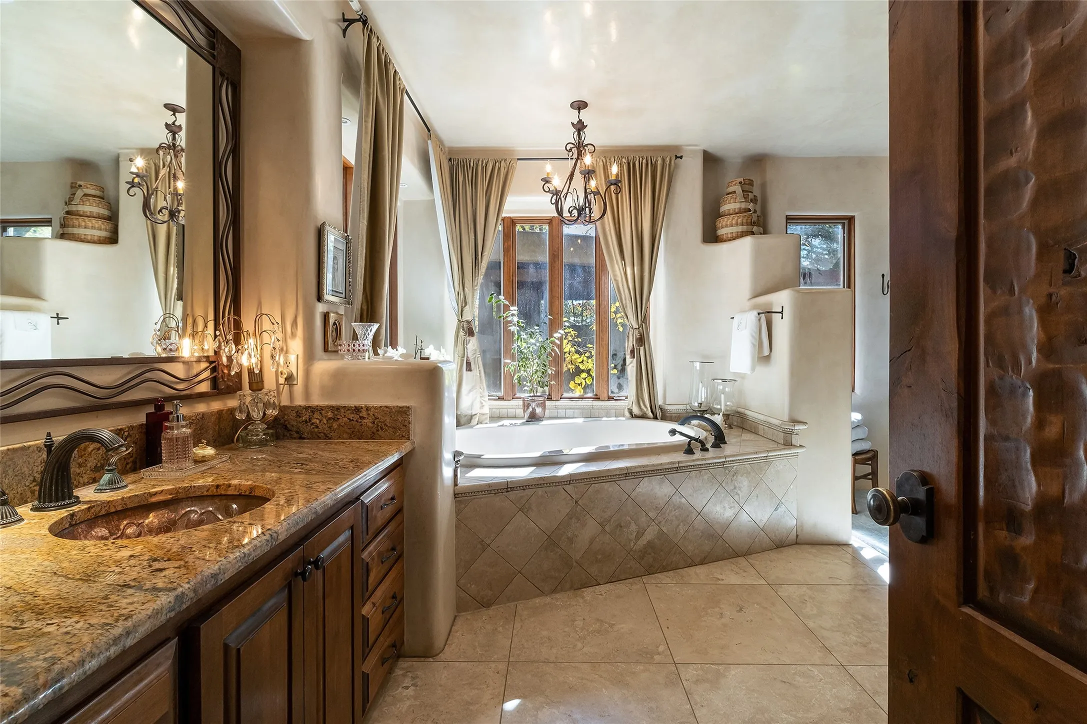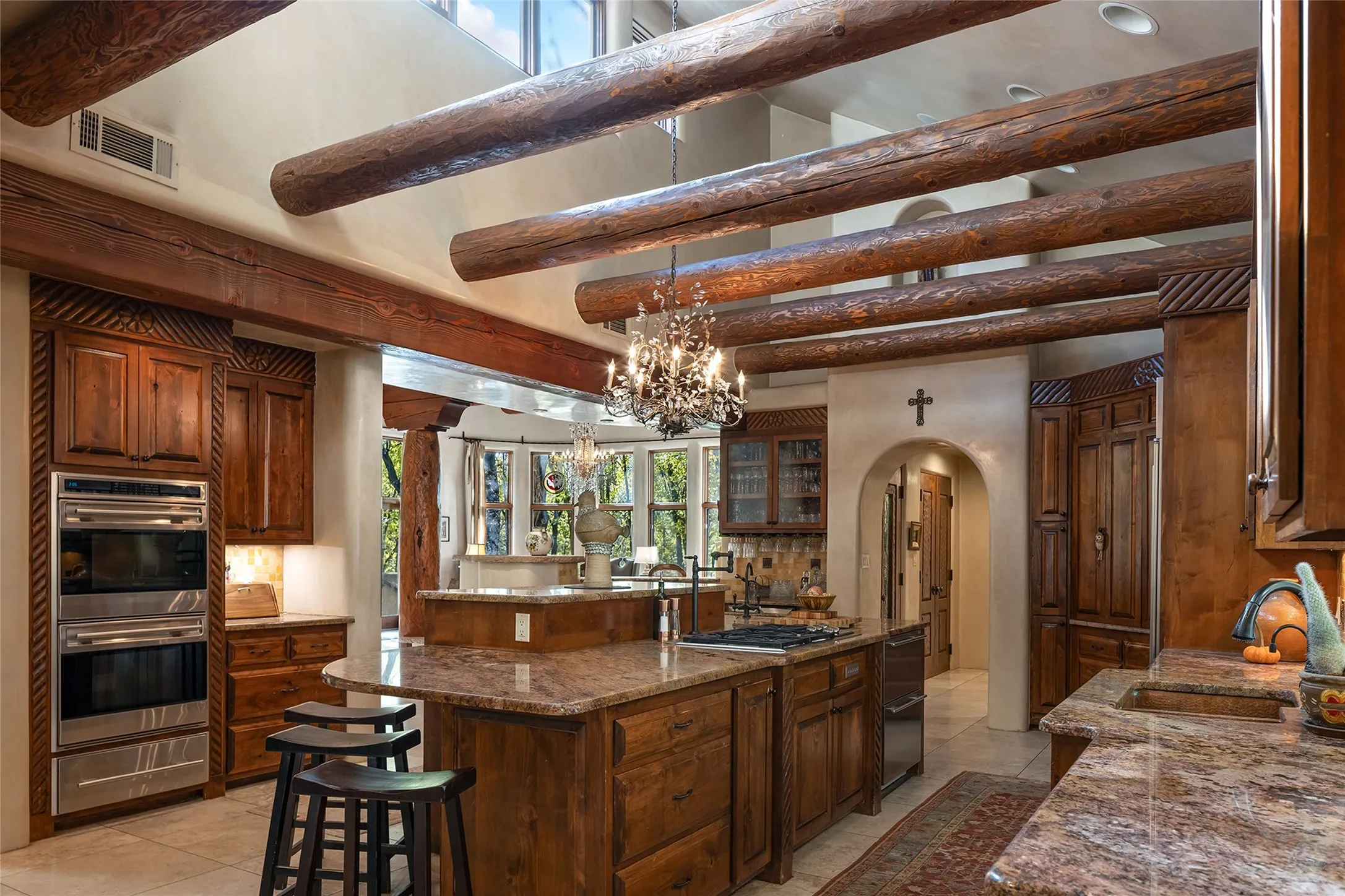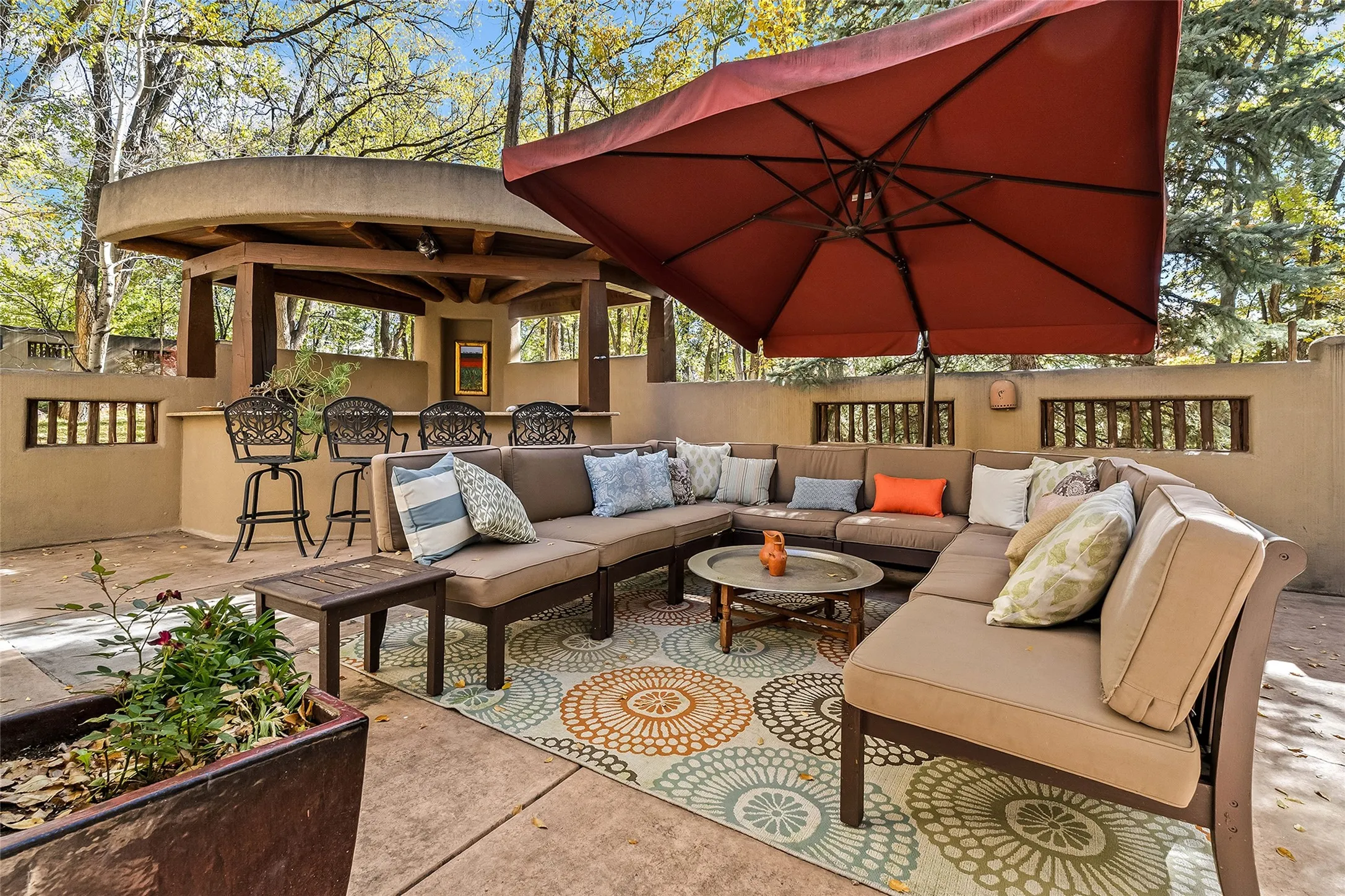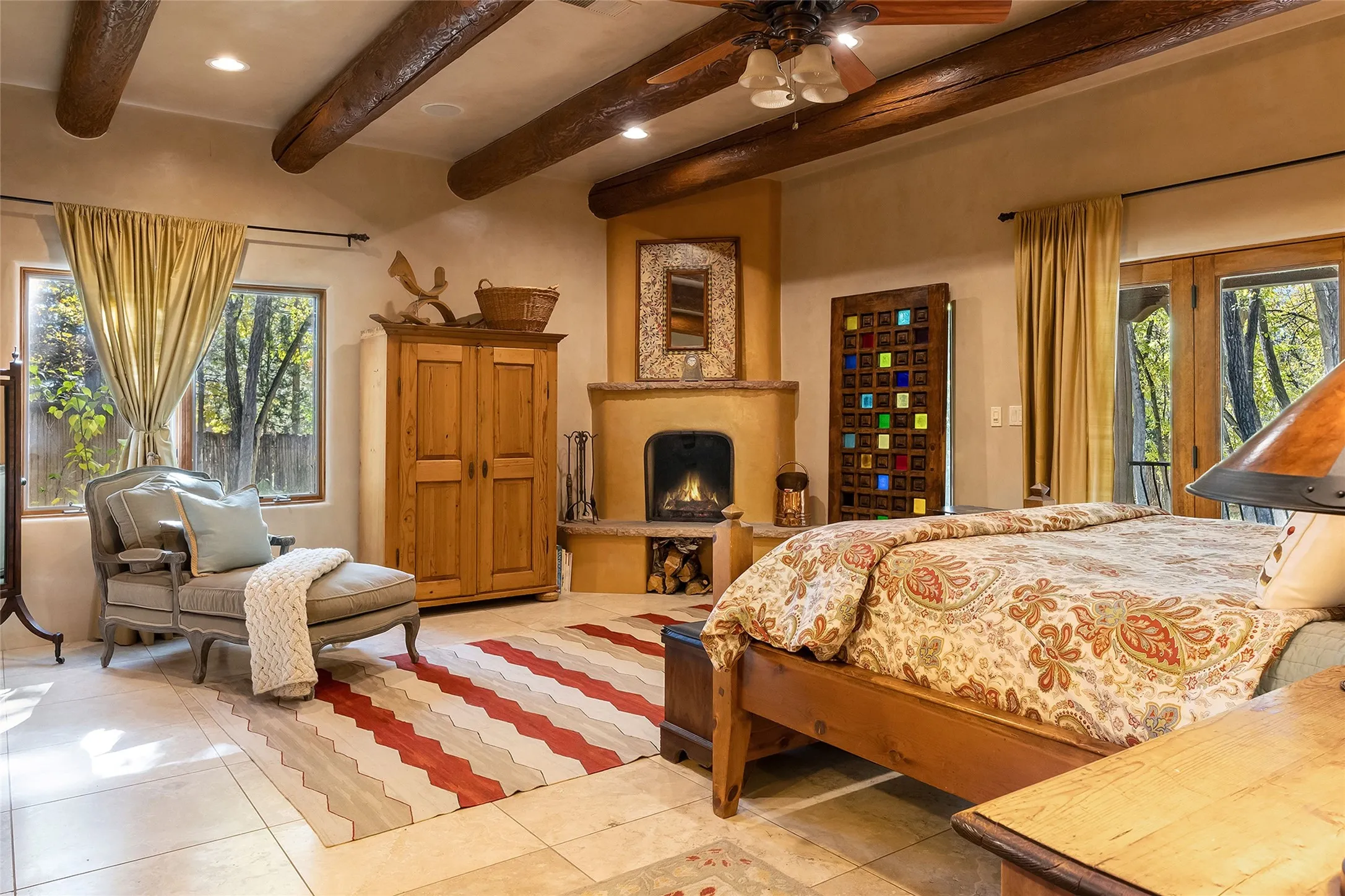 9 Old Coach Road is a 3-bedroom, 5-bath residence on 1.45 verdant, park-like acres in the heart of Tesuque Valley—one of Santa Fe’s most distinct, coveted and naturally lush settings. The property is a quiet, gated enclave defined by mature deciduous trees and flowing grass that reflect the valley’s rare greenery. The 5,447-square-foot home embodies classic Northern New Mexican design with a pitched metal roof and a warm, pueblo-inspired interior defined by hand-troweled plaster walls, vigas, copper and stone sinks and graceful rounded forms. A showpiece living room with a glass window-wall framing the landscaped tableau blends into a formal dining area and beautifully equipped kitchen, with an adjoining den that offers a more private retreat. The layout emphasizes both flow and function, creating an inviting environment for everyday living as well as entertaining. Each of the three bedrooms is a private suite, and the primary suite includes a fireplace, spa-style bath with steam shower and jetted tub, a large walk-in closet, and direct access to a private gym. Off the primary suite is a walled flagstone courtyard with a spa and outdoor bar. The home office is spacious and secluded behind custom carved wood doors, ideal for creative work or study. Outdoor living is central to the home’s character, with a deep portal and patio featuring a wood-burning fireplace overlooking shaded lawns. The property’s thoughtful design encourages a connection to nature while maintaining complete privacy. A three-car garage with storage rooms adds convenience and flexibility. Just minutes from downtown Santa Fe yet immersed in the quiet charm of Tesuque, 9 Old Coach Road offers a rare blend of authenticity, craftsmanship, and tranquility—an enduring reflection of traditional Northern New Mexico living in one of the region’s most beautiful valleys.
