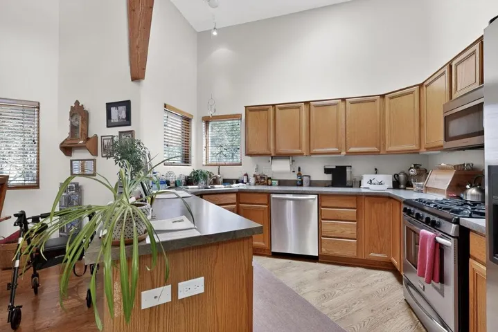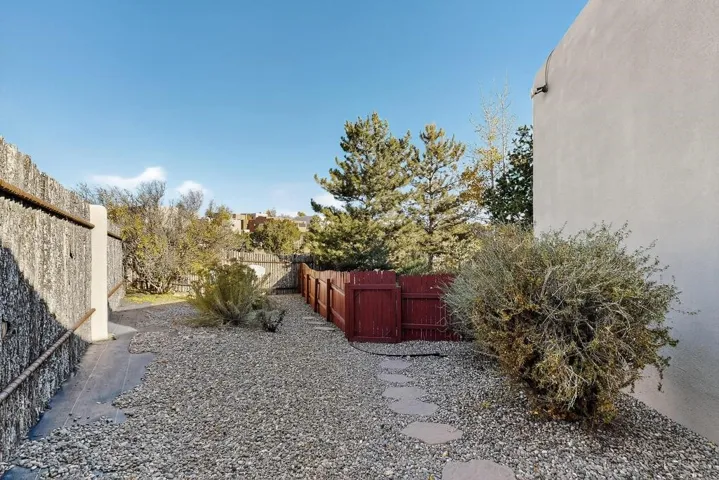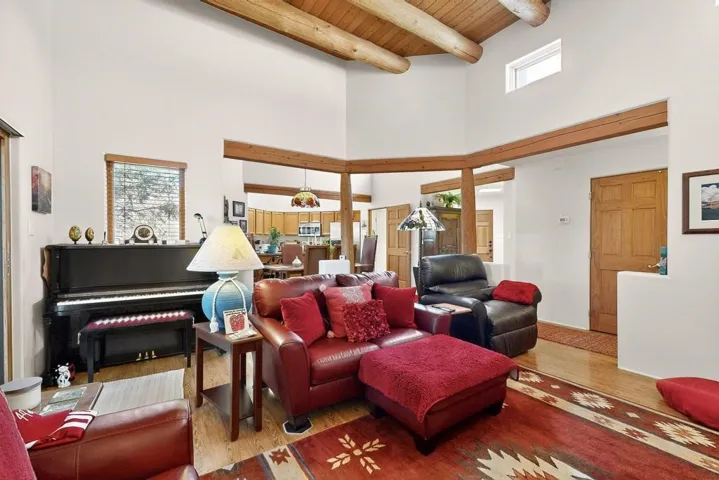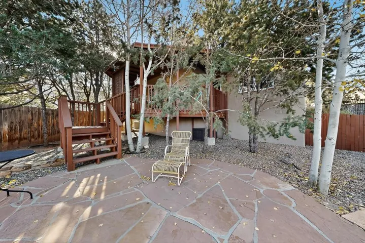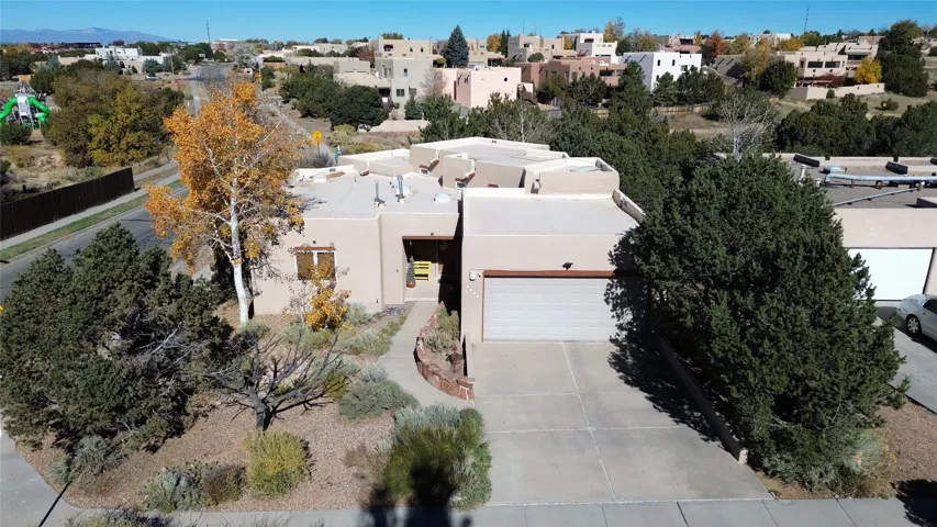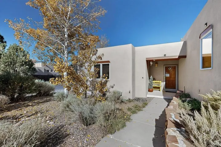 Donāt miss this charming single-level home in Pueblos del Sol featuring three bedrooms and two bathrooms. This residence showcases classic Santa Fe details such as Vigas and a cozy Kiva fireplace. Lots of natural light streaming in from five skylights throughout the home. The open floor plan provides great flow and comfortable bedroom separation, while the spacious deck with a solid portalāaccessible from both the living room and primary bedroomāoffers the perfect place to relax and enjoy the beautiful mountain views. York Central air conditioning and a two-car garage complete this wonderful Santa Fe home. Additionally, the raised subfloor design allows for easy access to plumbing for repairs or modifications. Situated on a large, beautifully landscaped corner lot with native plants and an apricot tree, the property backs onto a greenbelt for added privacy. Recent updates include a finished garage with a new door (2016), a new TPO roof (2021), new coyote and dog-eared fencing (2021), stucco patched and stained (2025), a new hot water heater (2025), and a new sump pump (2023). We invite you to come take a look at this wonderful property.
