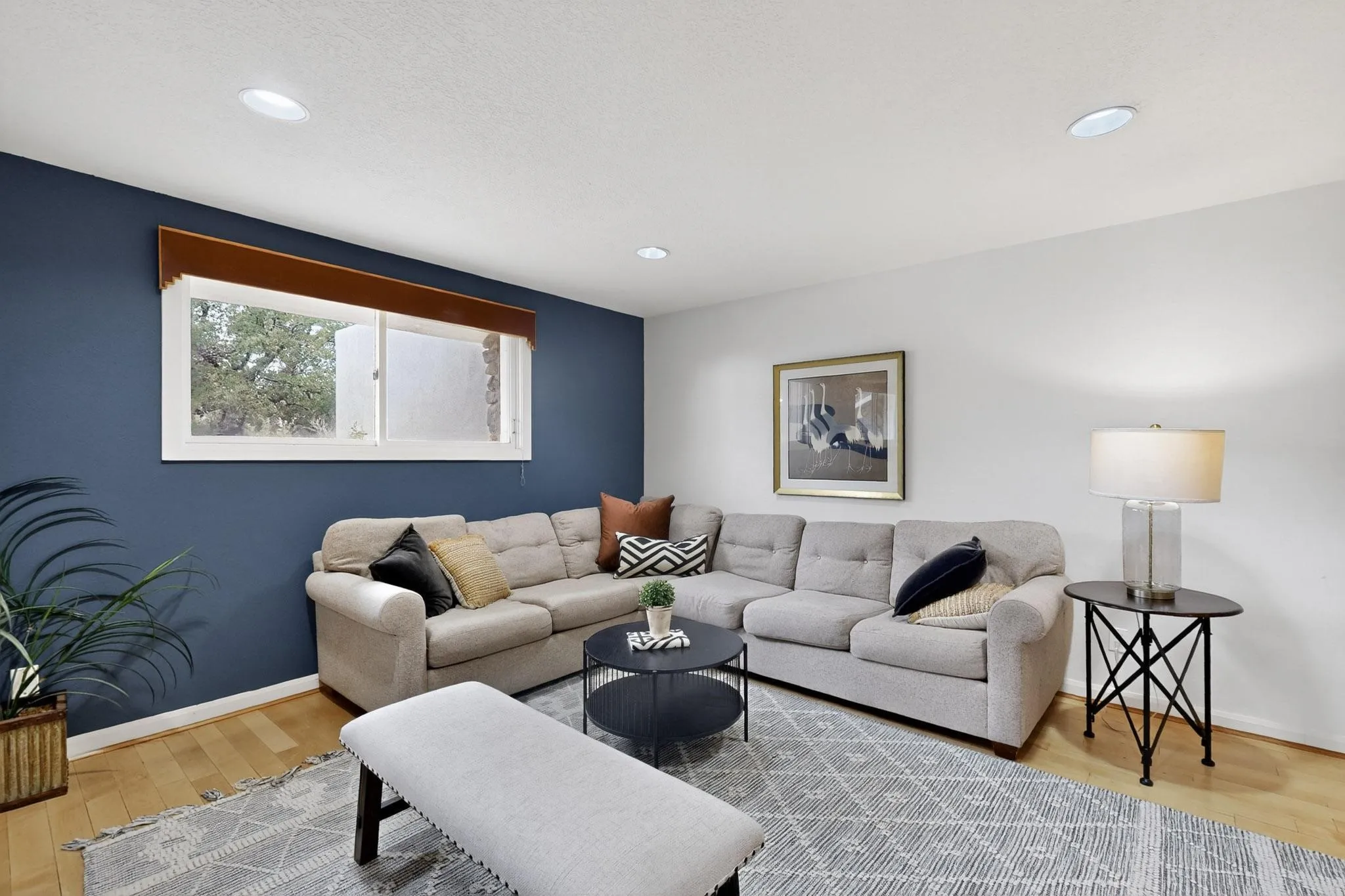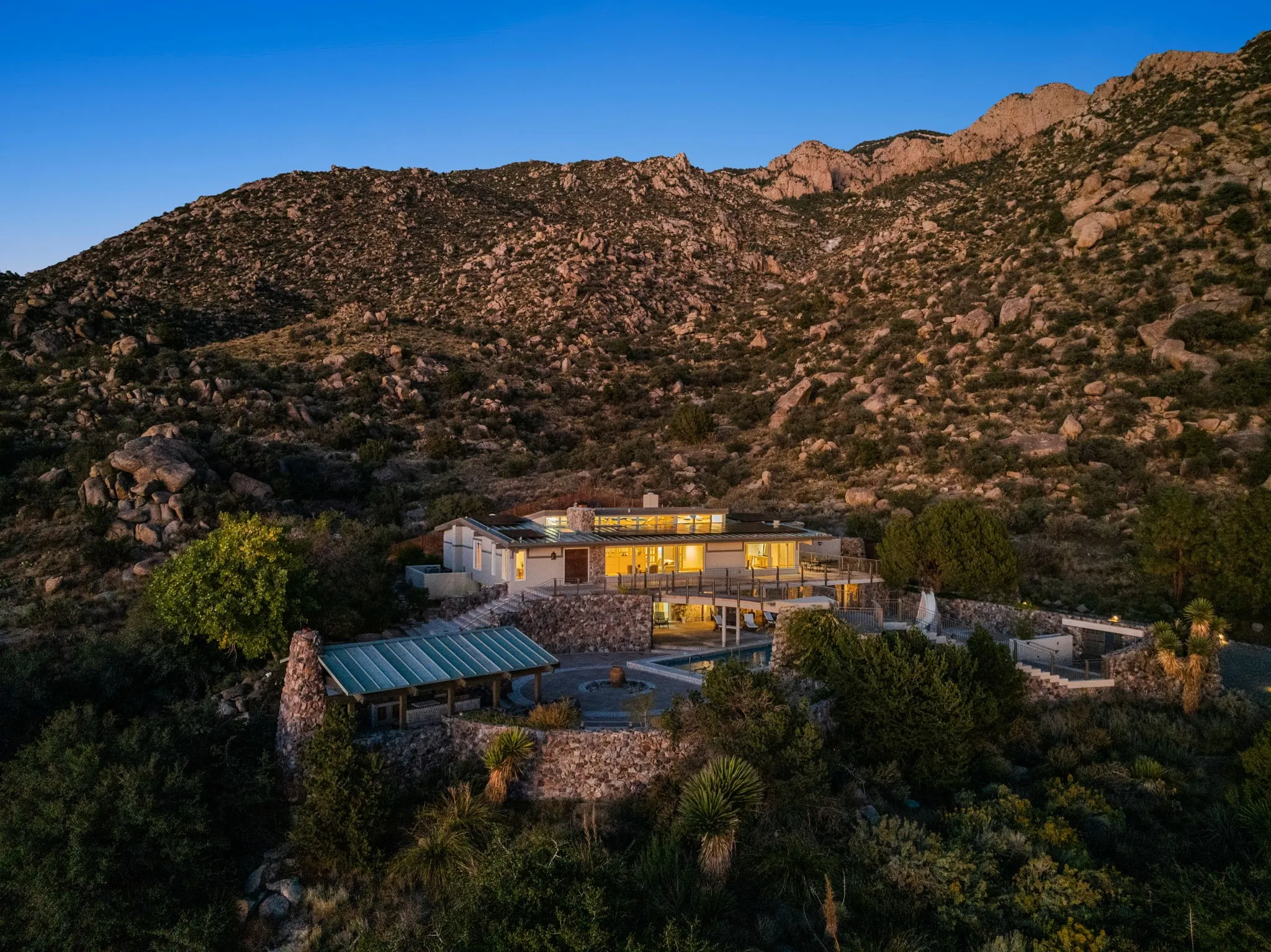 Elevate your lifestyle in this ”one-of-a-kind” ABQ Dream Home! This authentic and refined mid-century modern home sits on an elevated double lot with 1.87 acres backing the Sandia mountains, bordering the Cibola National Forest and embodies the best of Albuquerque living. Expansive walls of glass frame breathtaking, unobstructed views of the mountains, vibrant sunsets, glittering city lights, starry nights, distant storms, and wildlife crossings. A stunning bridge and covered patio adorned by mosaic-tile cross over the shimmering pool leading to a massive outdoor covered cooking area with granite island, built in seating, and woodburning fireplace, creating a perfect blend of balance of timeless design and luxury living. Designed for both intimate gatherings and grand entertainment, this estate provides spacious living and dining areas filled with an abundance of natural light, 3 indoor woodburning fireplaces, hardwood finishes, large bedrooms, an office and primary suite with two water closets, custom wardrobes, exercise room and a steam shower. Outdoors, a resort-style retreat unfolds with two fully equipped outdoor cooking spaces, a fabulous 14×60 sparkling pool with a water slide, flagstone patios, rock walls, dramatic stairways, and a relaxing hot tub outside the primary bedroom beneath the star lit skies. Inside the lower-level game room boasts a family room with TV projector and retractable screen, pool bath, and cocktail lounge area that open to the pool and expansive deck area, creating the ultimate entertainment hub. With an $85k seller owned solar system, custom details throughout, and a versatile floor plan, this residence delivers a lifestyle of luxury, privacy, and unparalleled scenery- from sunrise over the Sandias to glittering city lights at night.