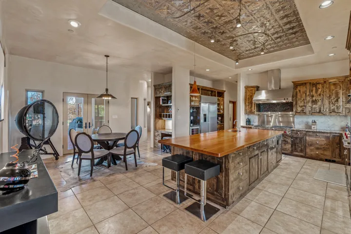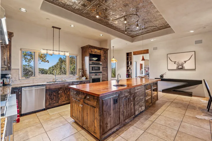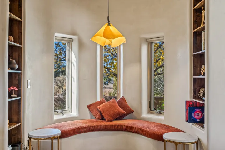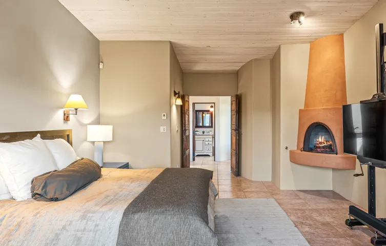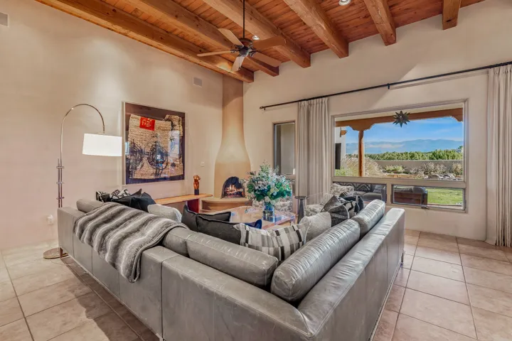 Experience true Santa Fe living in this elegant residence with a detached guesthouse, perfectly positioned in the coveted Sundance Estates to capture sweeping views of the Sangre de Cristo Mountains. Designed for seamless indoor-outdoor living, this home offers expansive portals, an inviting outdoor kiva fireplace, and exquisite landscaping that frame the essence of the Santa Fe lifestyle. Step inside to the beautifully designed open-concept formal living and dining room featuring smooth plaster walls, tall beamed ceilings, a kiva fireplace, expansive windows and double French doors that flood the interiors with natural light and boast the sweeping mountain views. The kitchen is a cookās delightāfeaturing high-end appliances including a Wolf cooktop and oven, a walk-in pantry, a large cherrywood island, and thoughtful finishes that blend style and function. The primary suite is both luxurious and serene, complete with a gas fireplace, spa-like bath with dual marble vanities, a soaking tub, a walk-in shower, and a grand walk-in closet. Step outside to your private patio and unwind in the hot tub beneath the stars. A pre-wired media room/theater offers the perfect setting for entertainment, while guests enjoy privacy in their own wing with an en-suite bedroom nearby and two convenient powder rooms for visitors. The detached casita provides a private retreat with its own entrance, kiva fireplace, bedroom, kitchenette, and access to the main home through the landscaped backyard. The grounds are as impressive as the interiors, with mature trees, lush lawn, a tranquil water feature, and walkways that connect every outdoor living spaceāfrom the primary suiteās patio to the guesthouse. A circular driveway completes the propertyās sense of arrival and sophistication, along with solar and a heated three-car garage, where the third bay currently functions as a gym. 58 Sundance Drive is a home where elegance, comfort, and the natural beauty of Santa Fe come together in harmony.