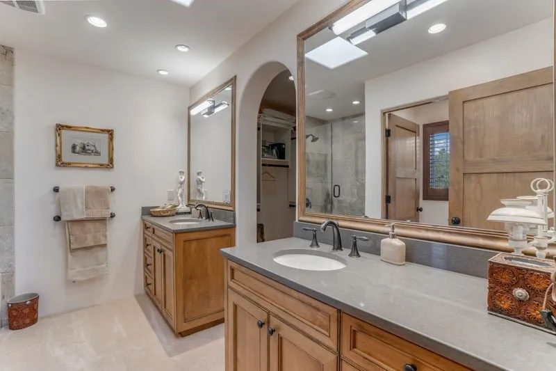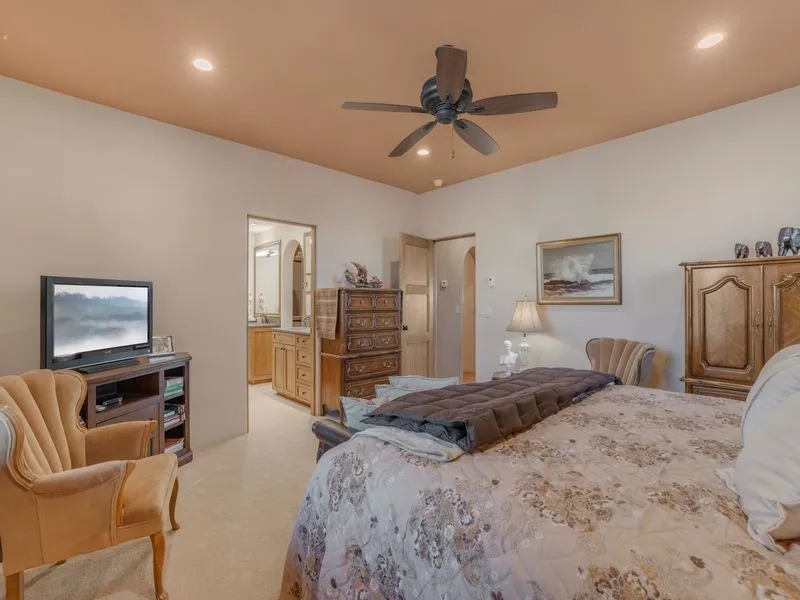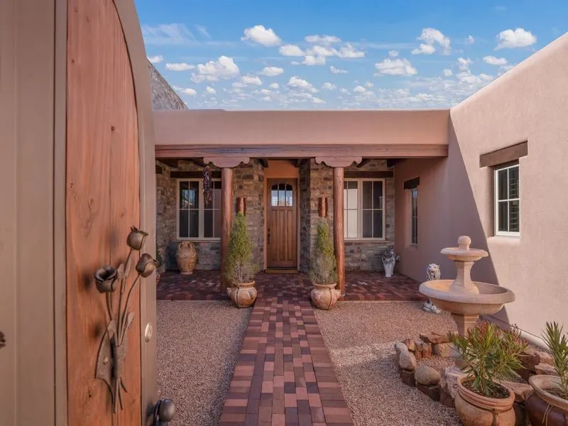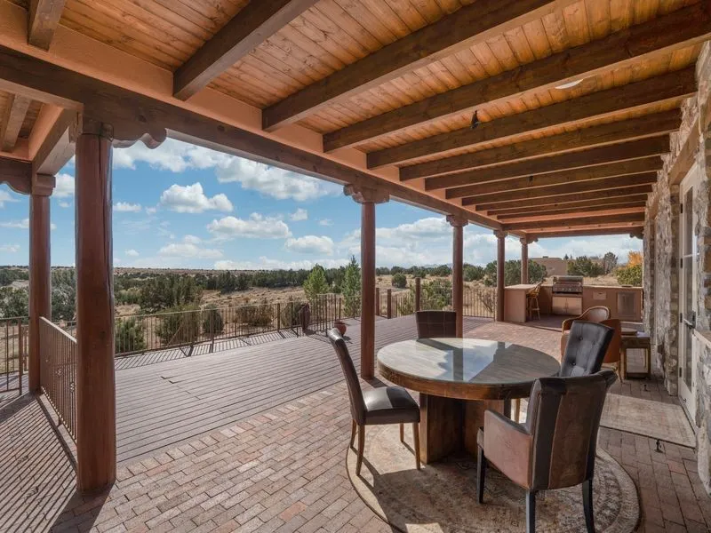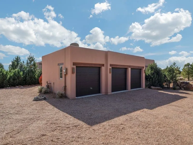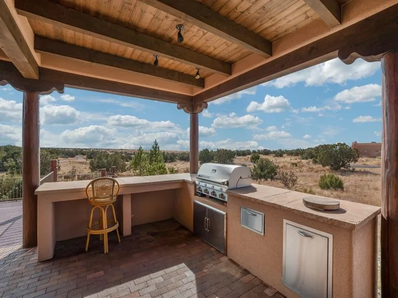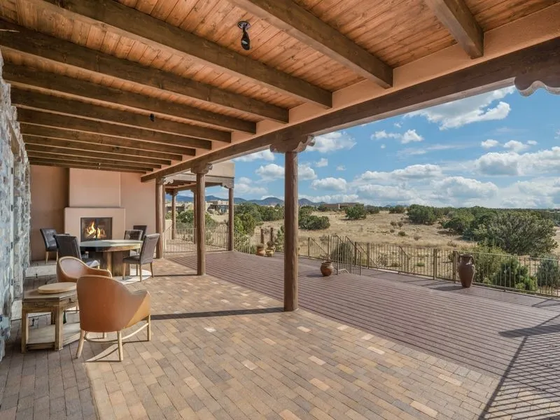 Experience refined Santa Fe living in this beautifully crafted, custom built 3 bedroom, 3 bath home offering stunning Ortiz, Jemez, and Sangre de Cristo mountain views. Thoughtfully designed for comfort and elegance, the residence features diamond-finish plaster walls, sumptuous archways, tongue-and-groove ceilings with beams, and classic brick floors that bring warmth and character throughout. The gourmet kitchen impresses with granite countertops, stainless-steel appliances, double ovens, a gas cooktop, and a spacious island with bar seating—all opening to a generous dining area and inviting living room with a kiva fireplace. The outdoor living space expands the home’s livability, including a large, wrap-around covered portal with an outdoor fireplace, built-in grill, and an expansive deck oriented to the southeast for breathtaking sunrise and mountain vistas. The luxurious primary suite includes a kiva fireplace, private access to the portal, a spa-style bath with a walk-in shower and clawfoot tub, dual vanities, and large walk-in closet. The guest suite with full bathroom is large enough to serve as a second primary suite. The third bedroom is set up as an office with ¾ bathroom across the hall and access to the portal. All bedrooms are nicely separated from each other for enhanced comfort and privacy. Beautifully landscaped with 90+ mature trees on an estate lot of 1.98 acres backing up to open space with direct access to walking trails, the property offers a serene connection to nature. Modern comforts include in-floor radiant heat, forced-air heating, central refrigerated A/C, community water and sewer, and high-speed internet. A three-car heated garage provides abundant storage and convenience. Located just 19 minutes to the Plaza, 11 minutes to Cerrillos Road shopping, and 5 minutes to SF Community College, this home perfect for entertaining blends privacy, craftsmanship, and exceptional indoor-outdoor living in one of Santa Fe’s most desirable settings.