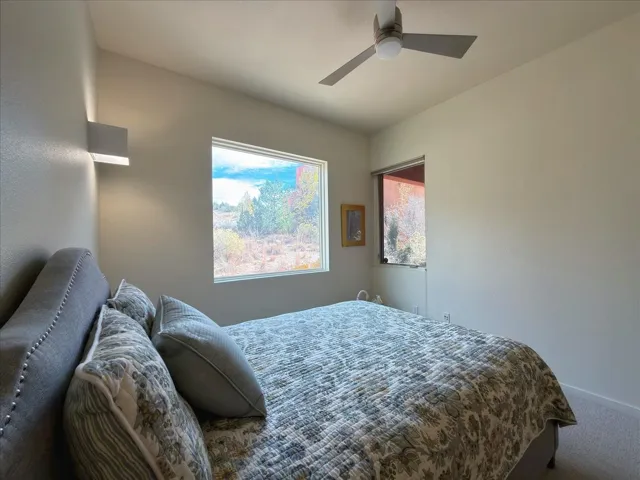 The intimate private back patio opens to native landscape and open space, offering a quiet spot to enjoy Santa Feās natural surroundings. Inside, the kitchen provides all the essential features, including a large pantry. The bedroom enjoys generous natural light and features a beautiful vista of the native landscape. The bathroom is a standout, showcasing a spacious layout and a large walk-in shower.
