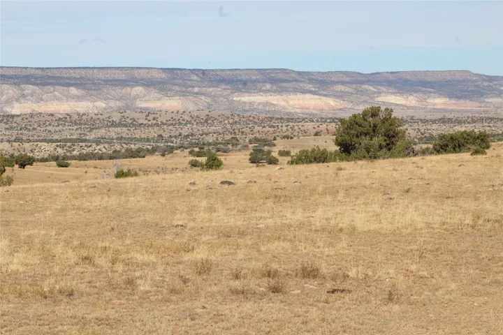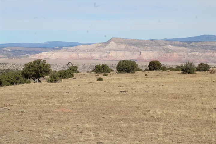 The panoramic vistas include the striking Pedernal and the Mesa Alta mountain range to the West. To the north, you can see the distinctive Piedra Lumbre rock formations and the famed Ghost Ranch area, with the Canjilon Mountains visible in the distance. The Sangre De Cristo mountains dominate the view to the east.