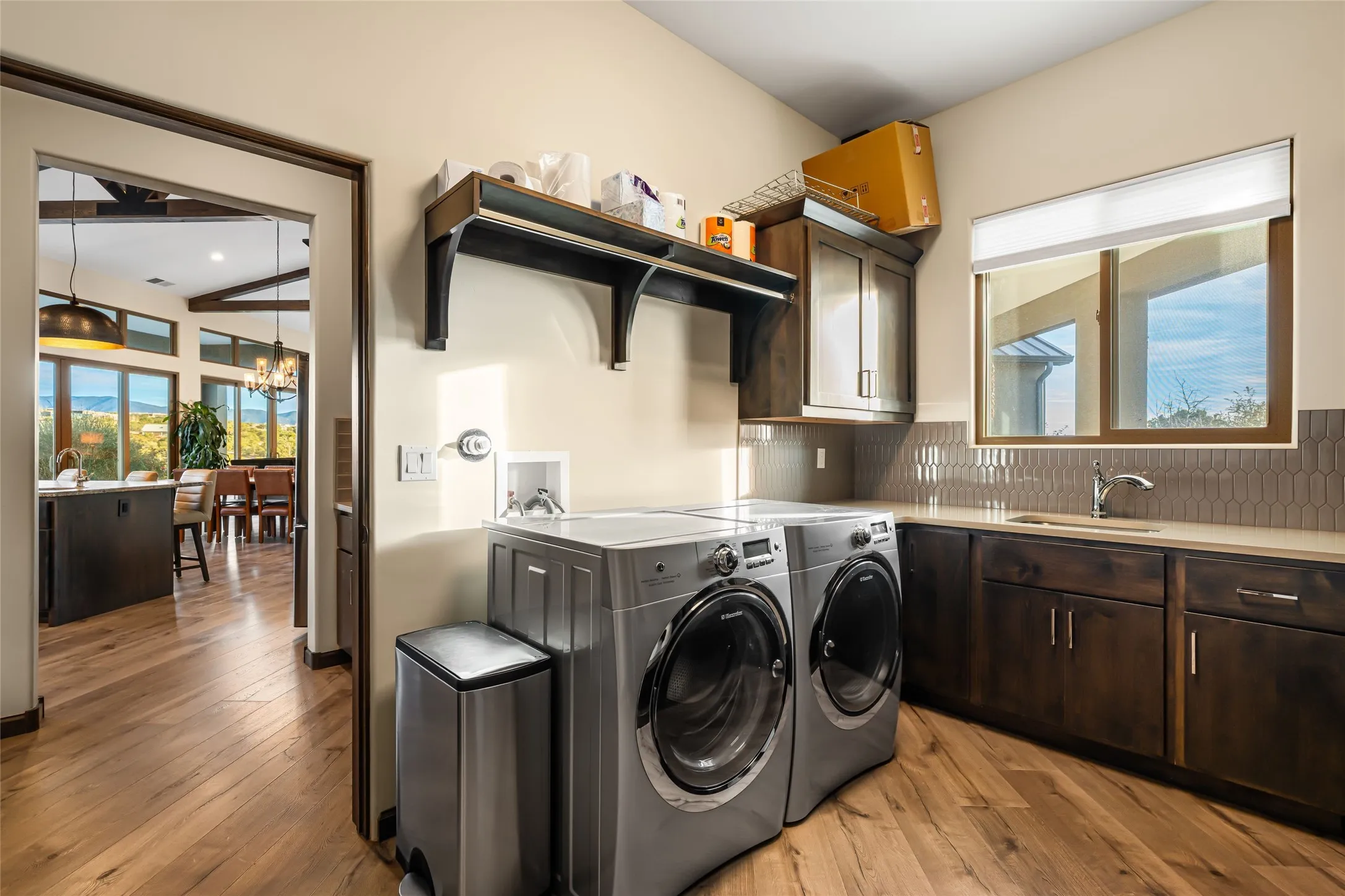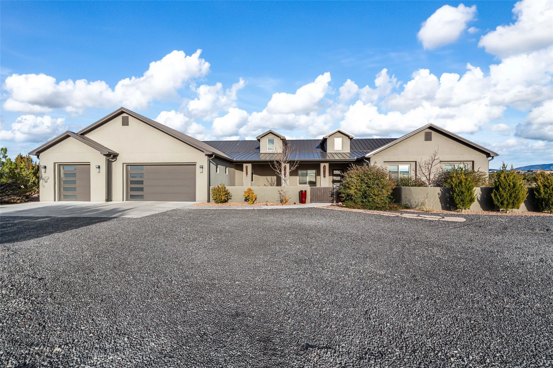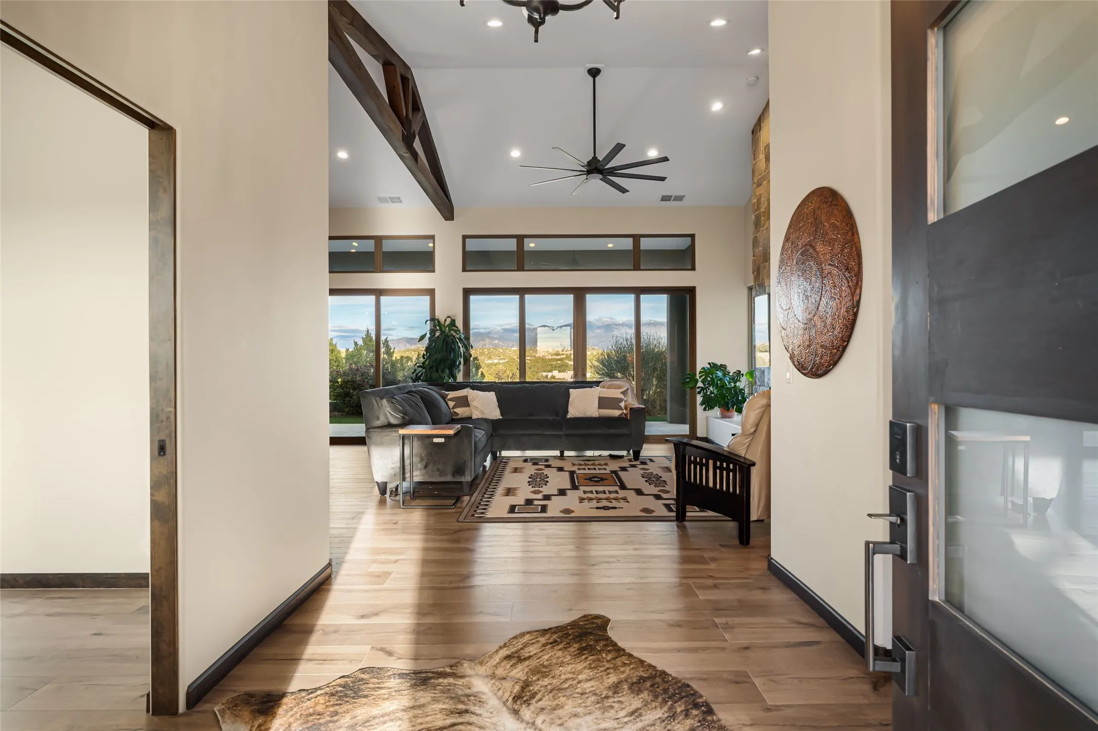 This exceptional 4-bedroom, 3.5-bath home features an open-concept main living area, a private Primary Suite, three Guest Bedrooms, a dedicated Office, and a large Workout Studio/Bonus Room. An expansive wall of floor-to-ceiling windows provides unobstructed mountain views, framing the Sangre de Cristos like artwork. Sunsets paint the landscape in soft desert hues, which become an everyday backdrop to living, dining, and entertaining.
