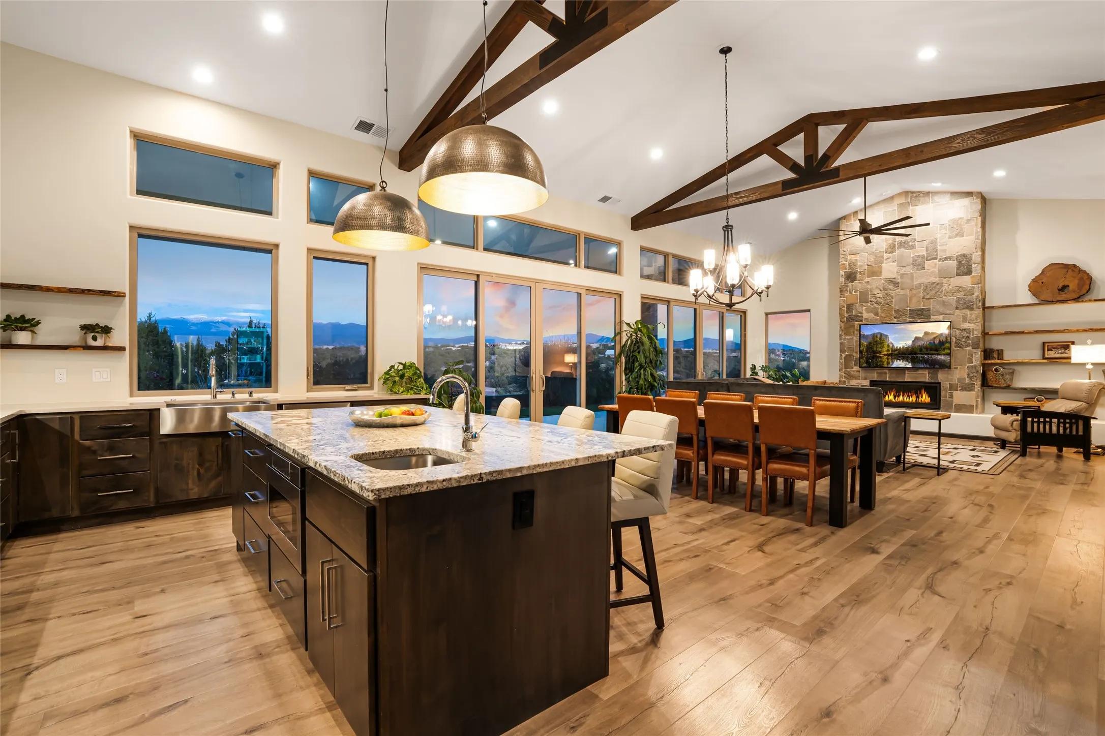 The heart of the home unfolds into an inviting, open concept living space with 14 ft. vaulted ceilings featuring dramatic finished-wood trusses and opens seamlessly to a large, covered patio which is perfect for enjoying the sweeping mountain views.
